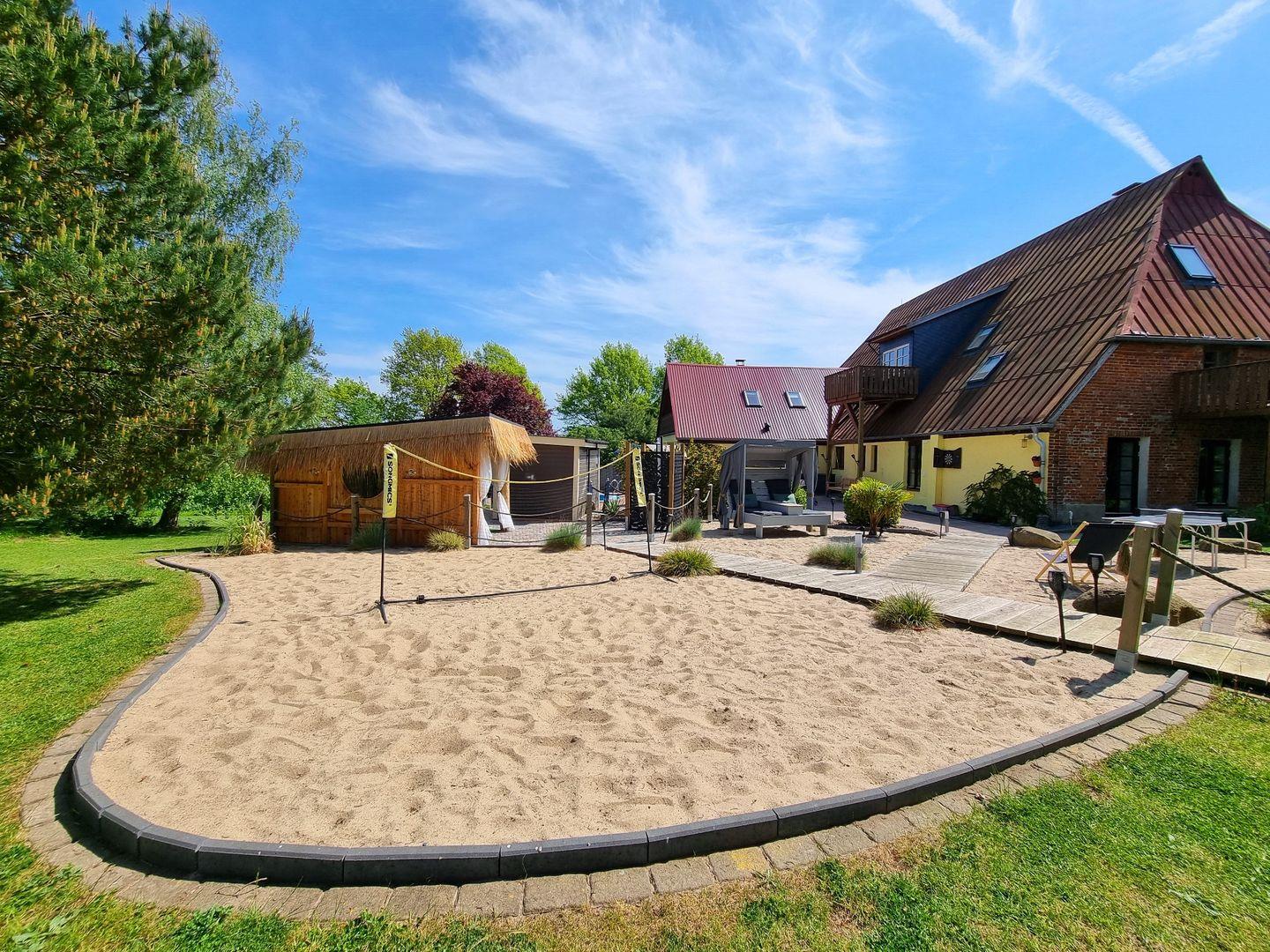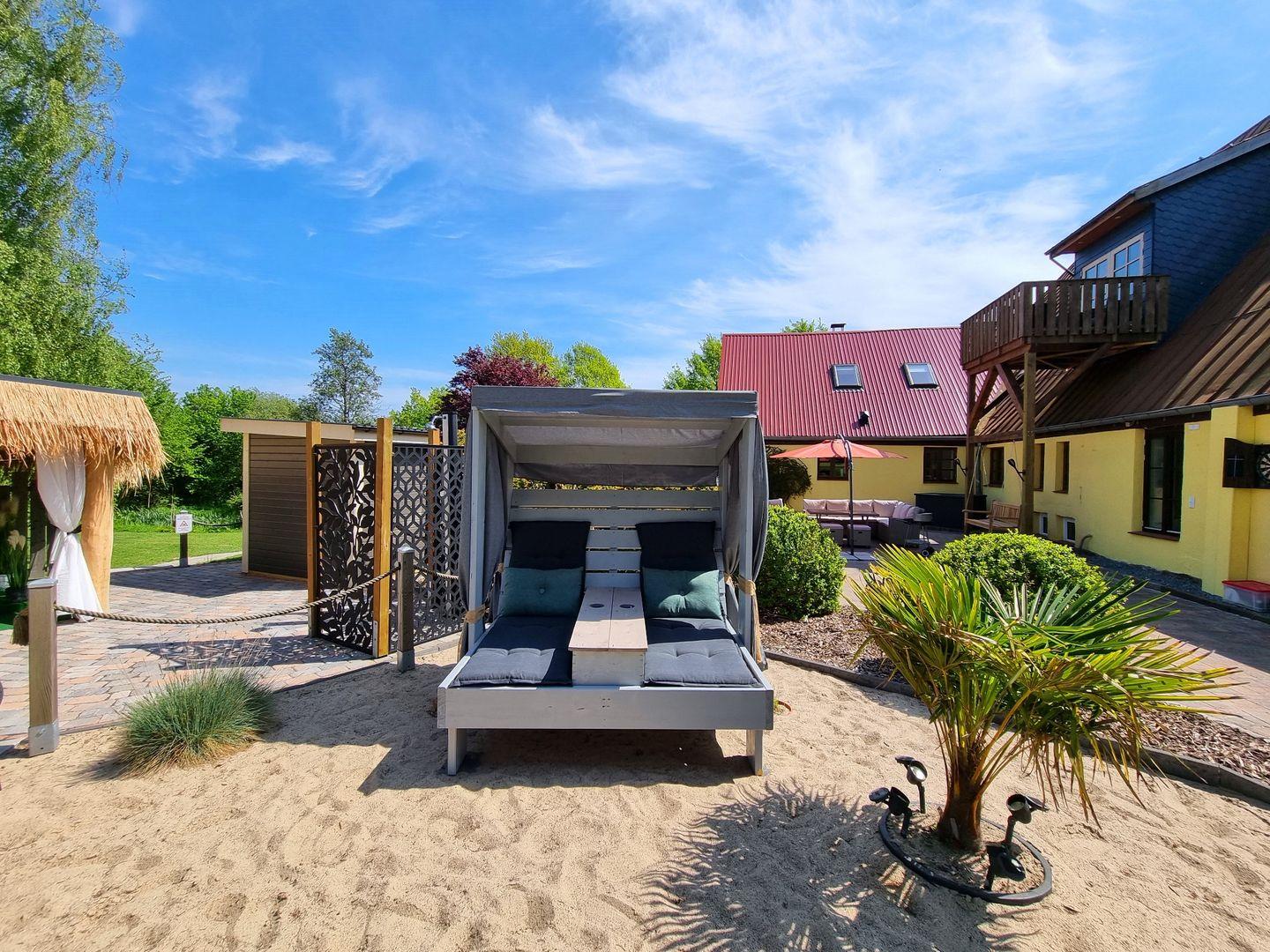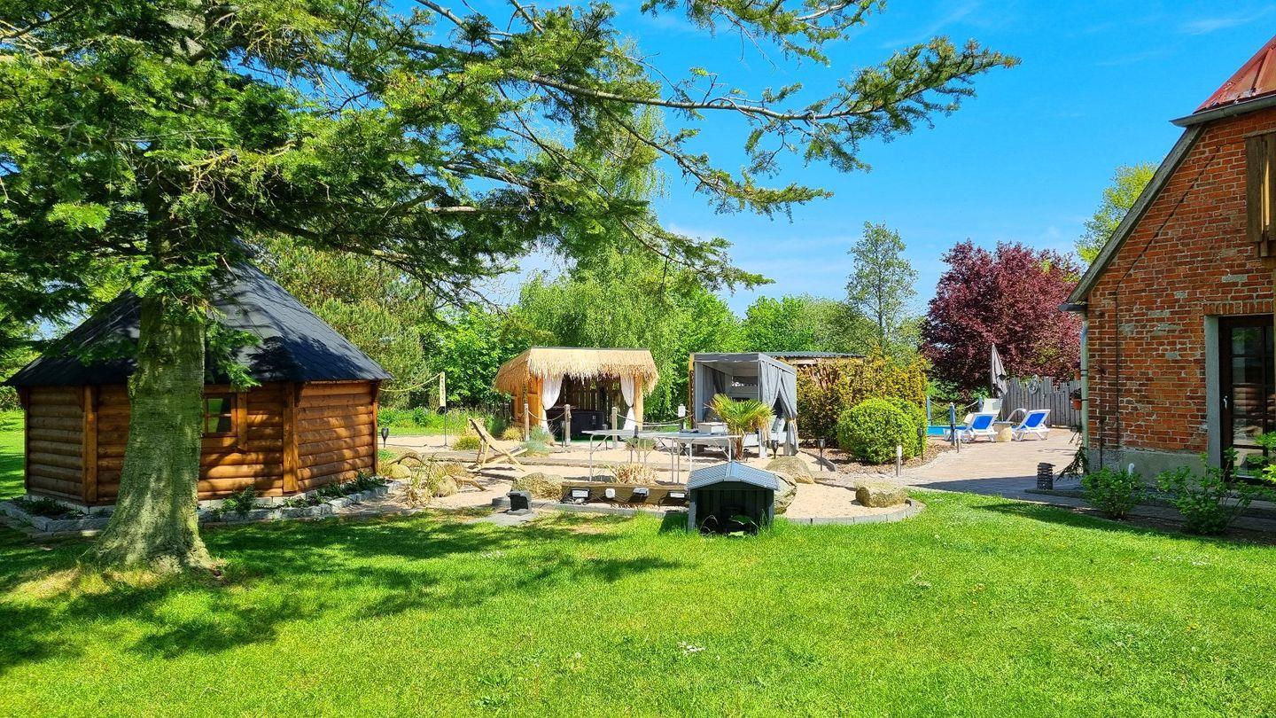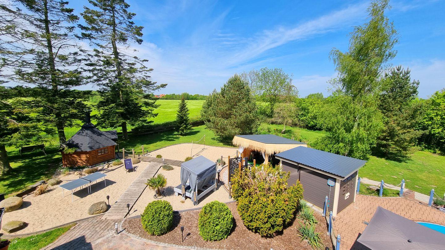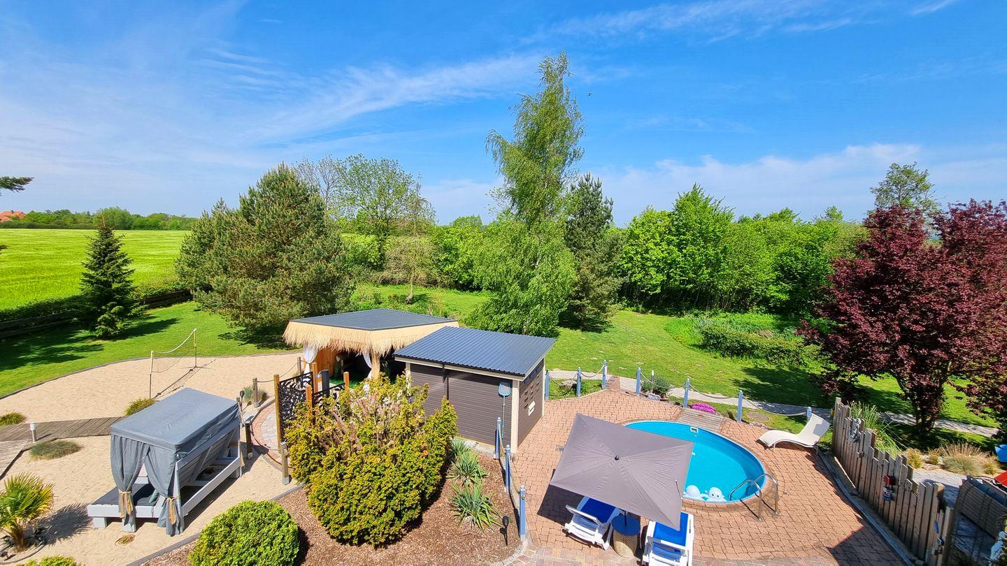 Der große Garten ist mit über 1000qm ein grünes Paradies. Für Erfrischung sorgt der Rundpool, für Wärme und Entspannung die Sauna mit zugehöriger Außendusche. Sollte es einmal regnerisch sein, oder wenn ihr es einfach nur gemütlich mögt, steht eine Grillkota als Mittelpunkt zwischen eigens angelegten Sandgärten bereit. Für Aktive Gäste gibt es einen Sandplatz mit Netz zum Volleyball und Badminton spielen, eine Tischtennisplatte und eine Outdoor-Dartscheibe. Über das gesamte Areal sind mehrere Sitzecken mit und ohne Sonnenschirme verteilt. Auch abends sorgt die Ausrichtung nach Westen für die schönsten Sonnenuntergänge über die Weiten der Felder. Dazu lässt sich stimmungsvolle Beleuchtung einschalten und die Ruhe genießen.