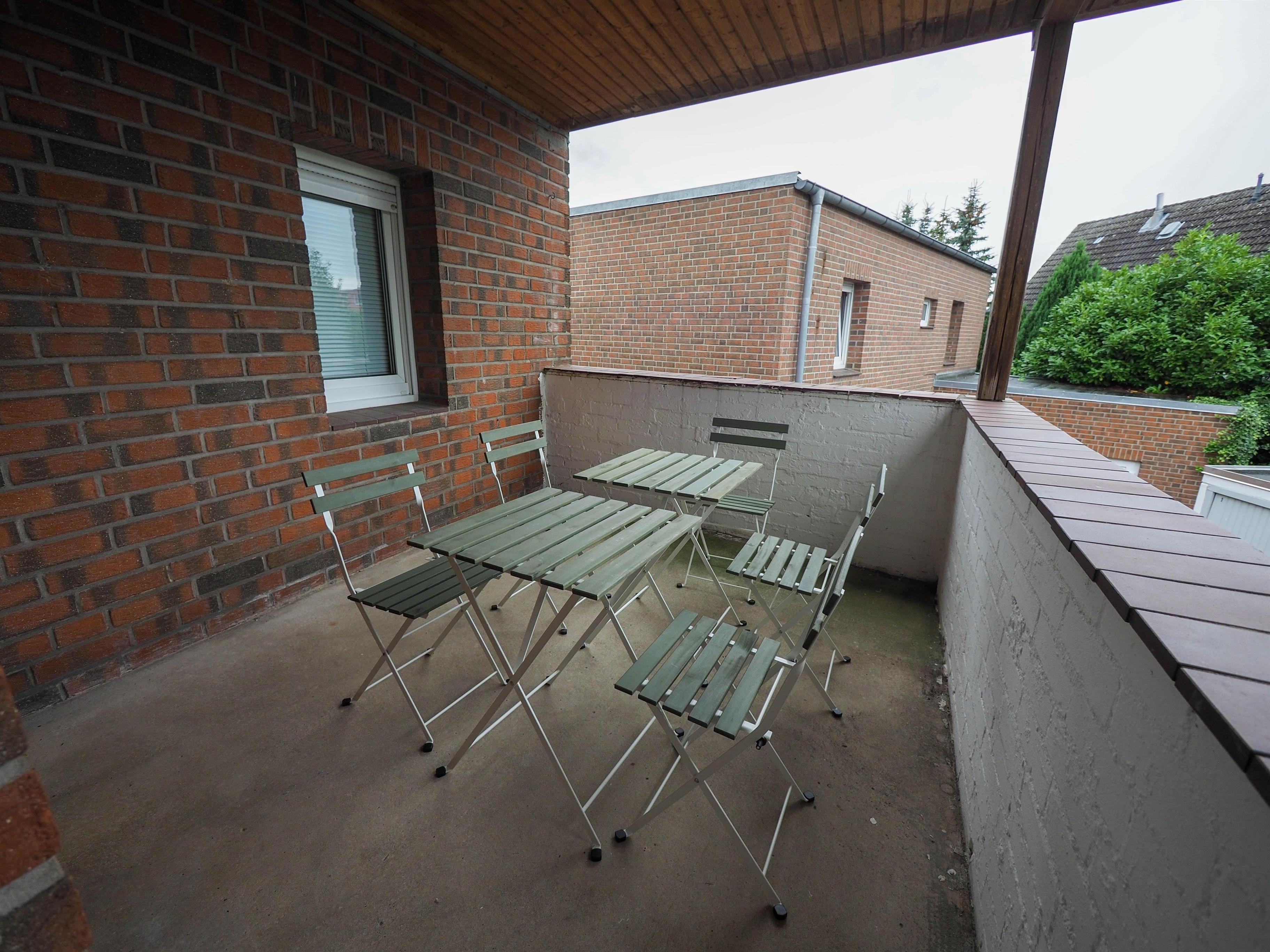 Großer überdachter Balkon mit Sitzmöglichkeiten (Tische und Stühle)