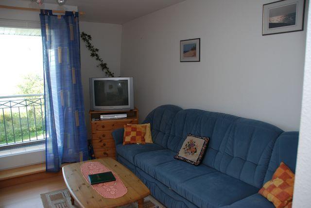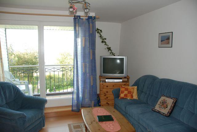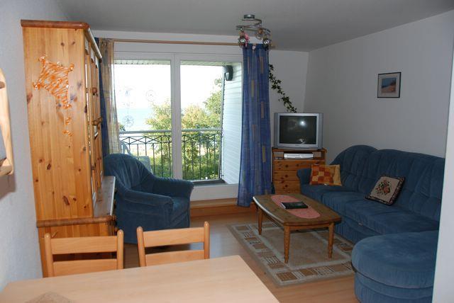 Das gemütliche Wohnzimmer mit Sofaecke, TV-Gerät und Zugang zum Balkon verfügt außerdem über die integrierte Küche. Diese ist mit Kühlschrank mit Gefrierfach, Herd mit Backofen, Geschirrspülmaschine, Kaffeemaschine, Wasserkocher und vielem mehr ausgestattet. Vom möblierten Balkon haben Sie einen tollen Blick auf die Promenade und den Strand und die Ostsee.