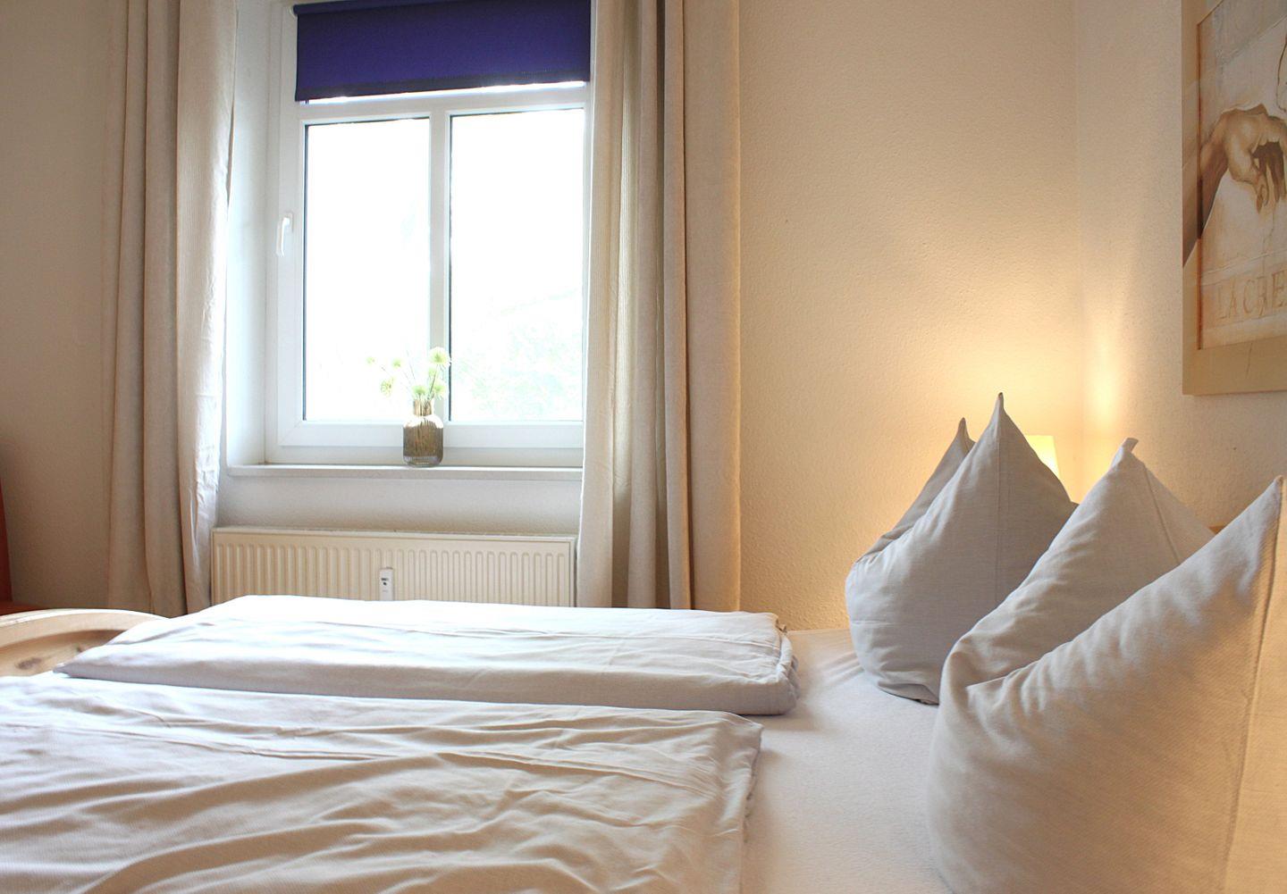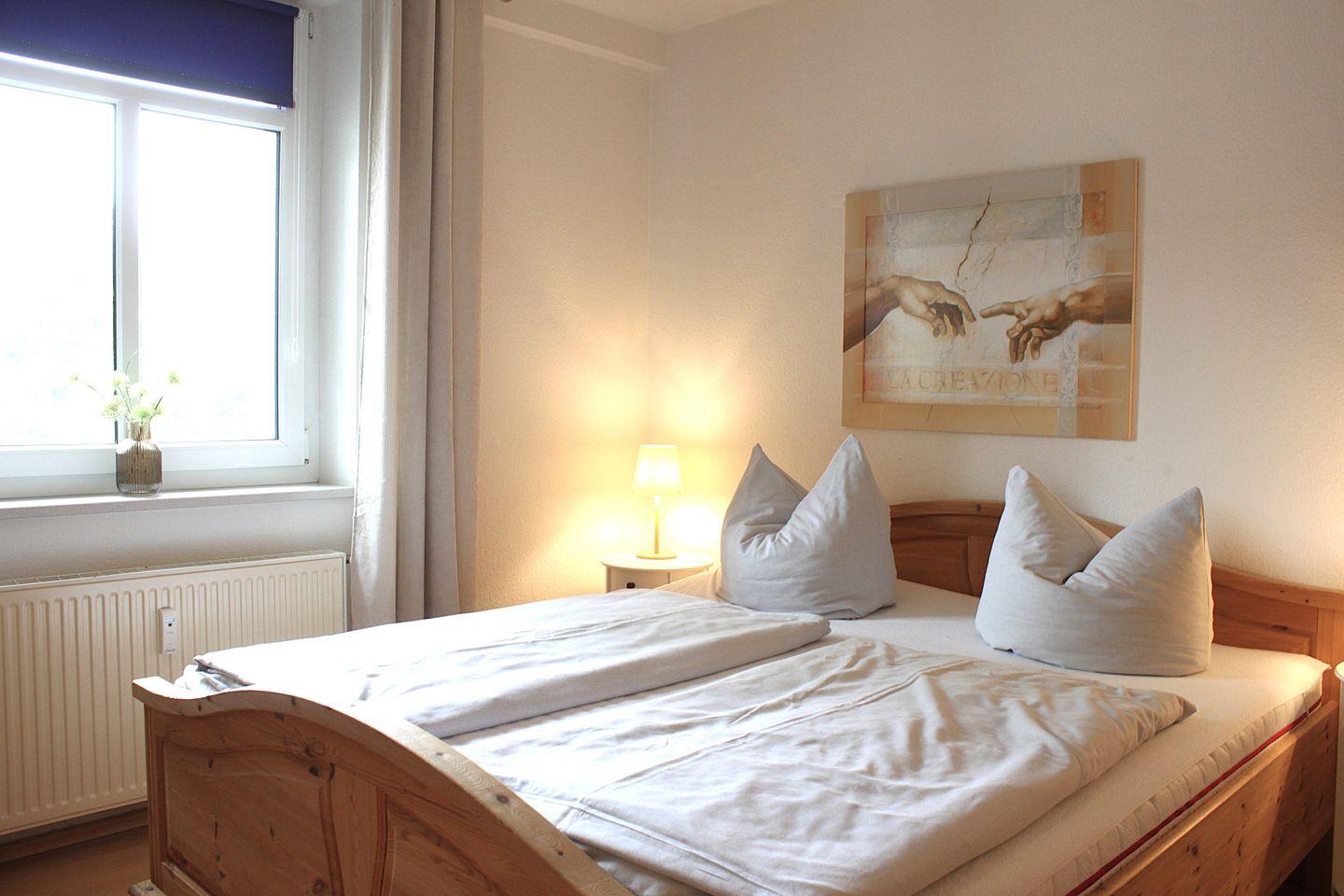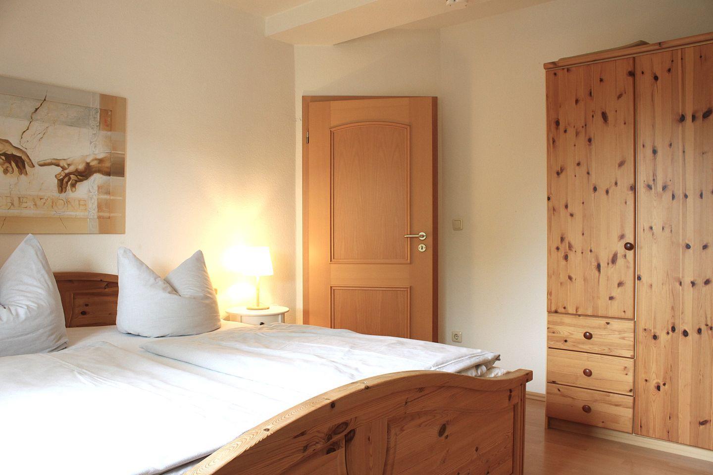 Das separate, gemütliche Schlafzimmer ist mit einem Doppelbett (durchgehende Matratze) und einem Kleiderschrank möbliert.