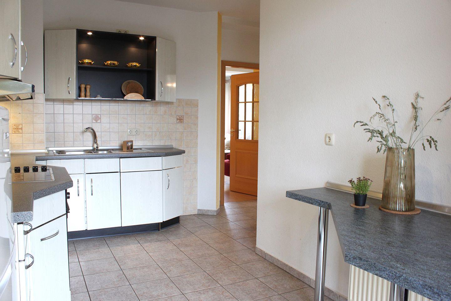 Die Küche ist separat und vollwertig ausgestattet. Dazu gehören unter anderem ein Herd mit Backofen, ein Kühlschrank mit Gefrierfach, eine Mikrowelle, eine Kaffeemaschine und vieles mehr. Hier befindet sich außerdem der Zugang zum möblierten Balkon, auf dem Sie schöne Stunden verbringen können.