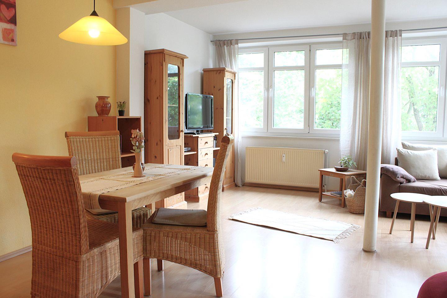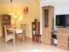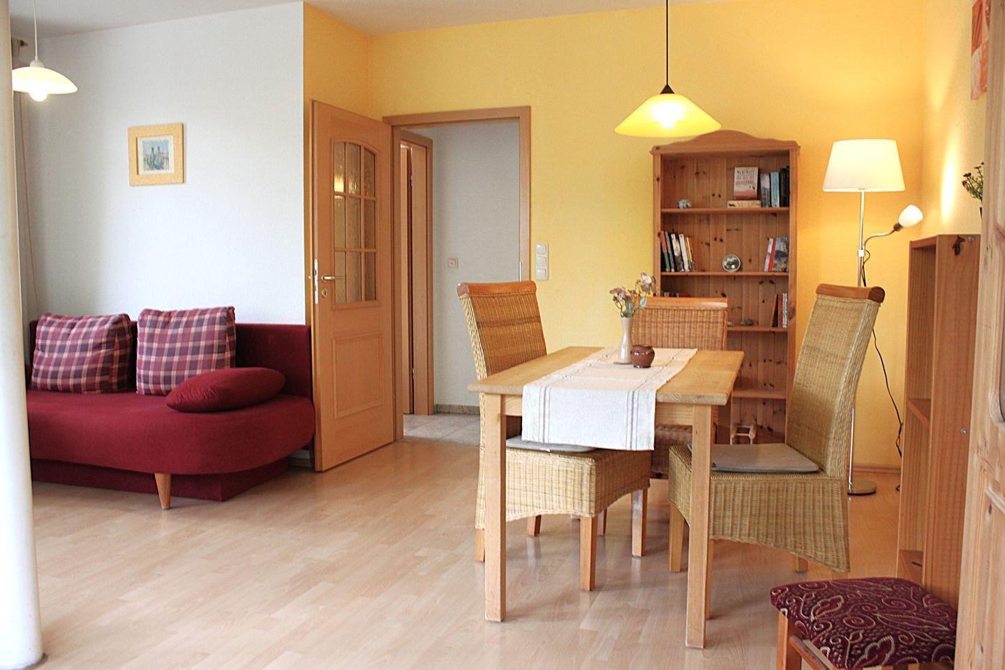 Bis zu 2 Personen finden in dieser Ferienwohnung Platz für einen schönen Urlaub direkt am Meer. Ein helles, geräumiges Wohnzimmer, von dem aus Sie einen Blick auf die Promenade und den dahinter liegenden Strand haben, bietet ein gemütliches Sofa, ein TV-Gerät und einen Essbereich.