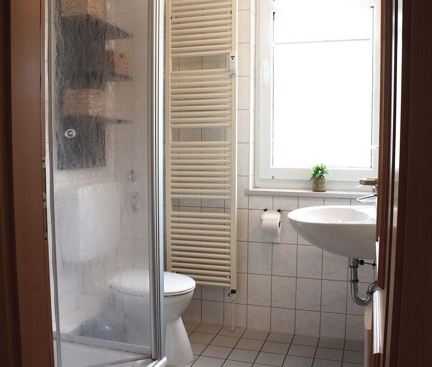 Das Badezimmer mit Fenster ist mit einer Dusche, einem Waschtisch, Handtuchheizkörper, Föhn und einem WC ausgestattet.