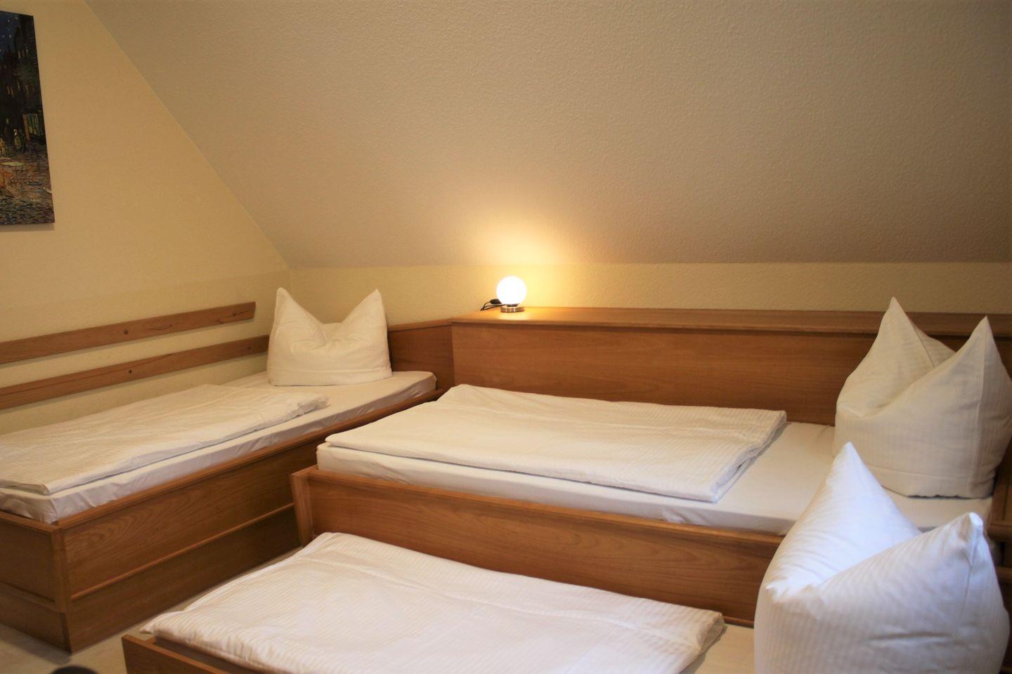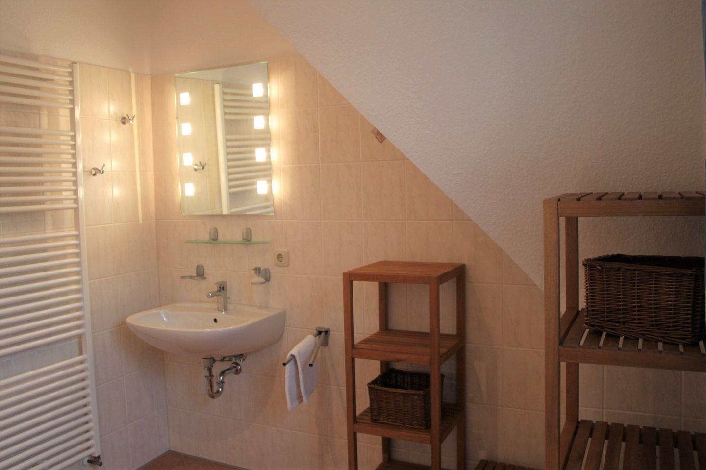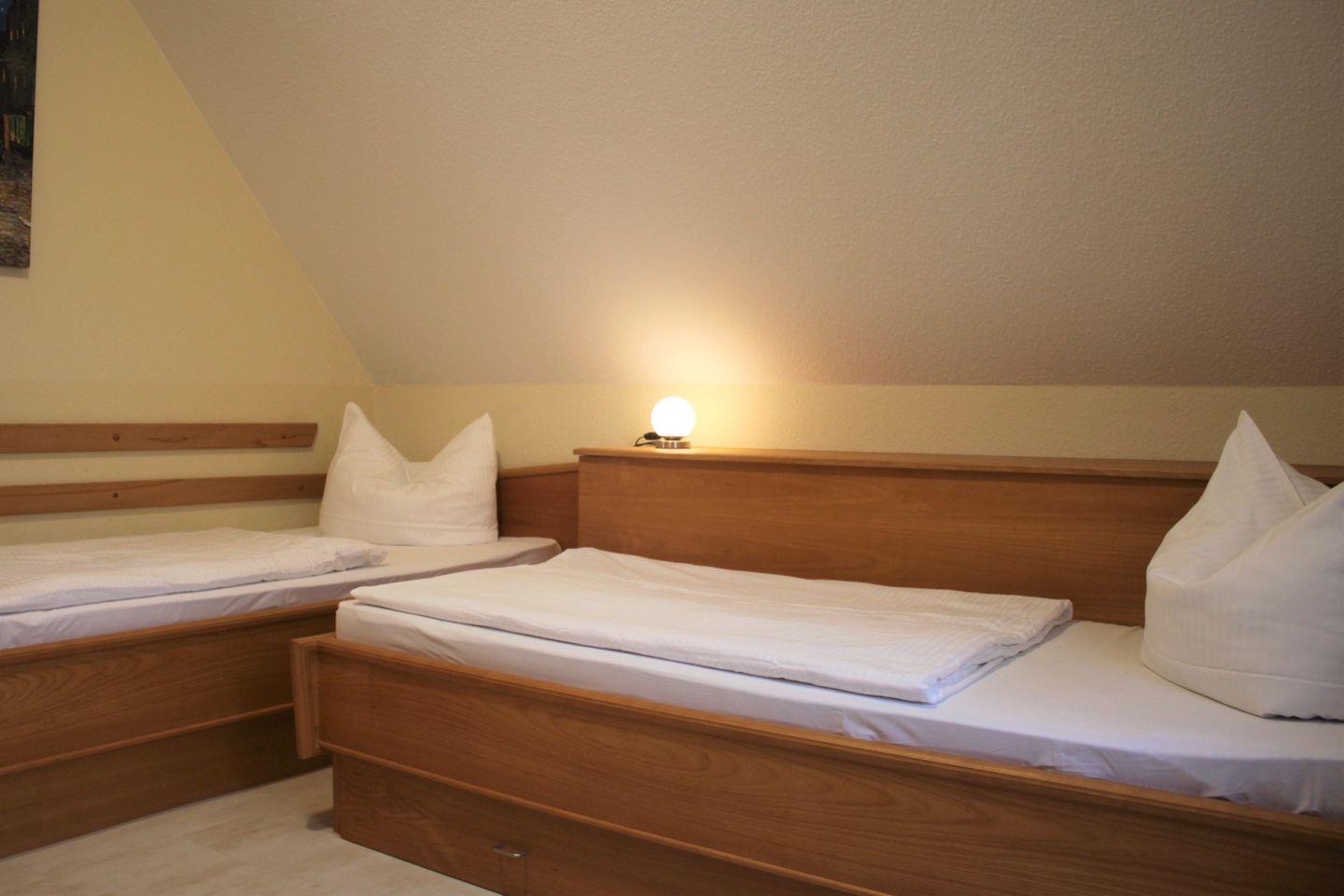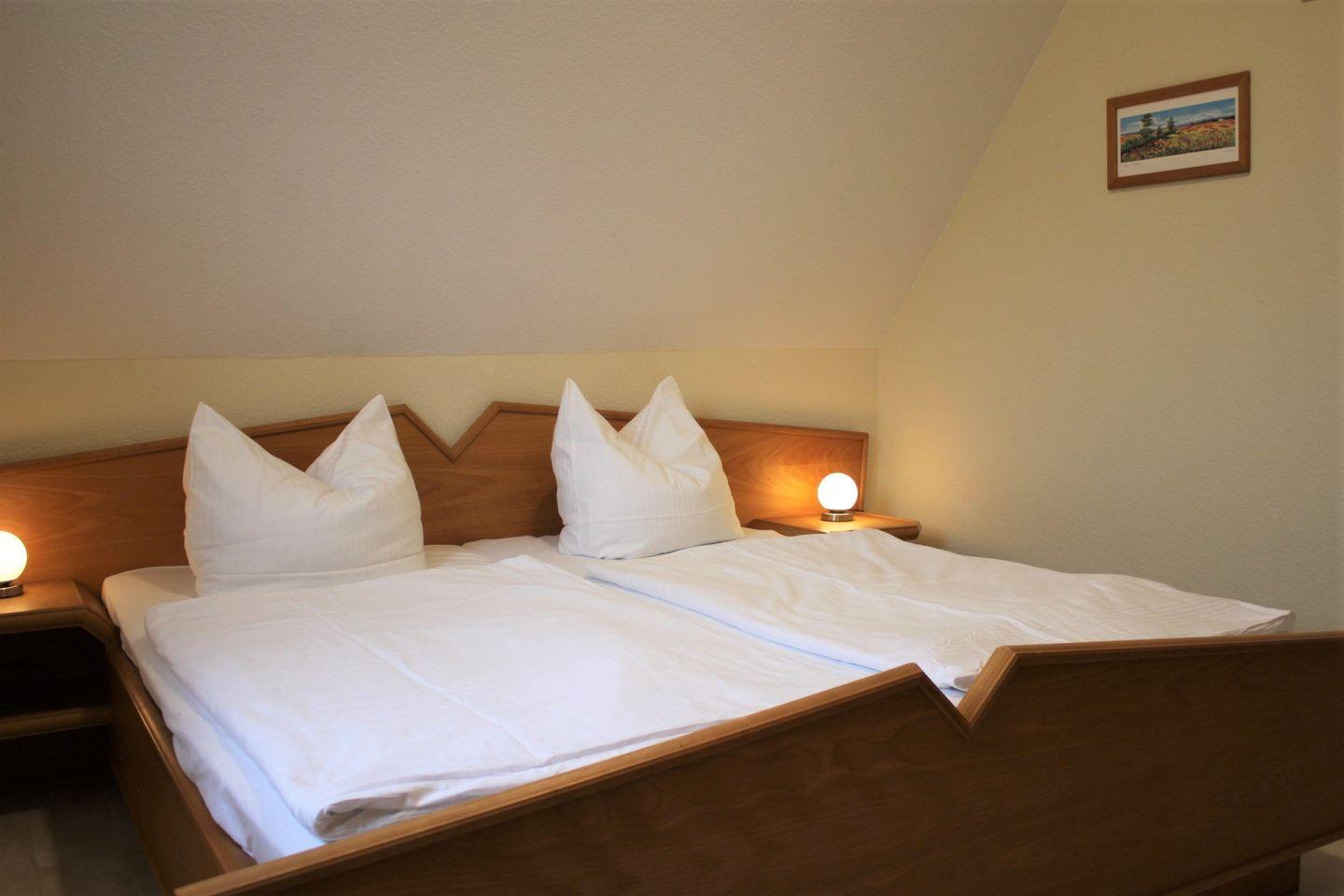 Im Erdgeschoss des Hauses verfügen Sie außerdem über ein Gäste-WC. Über eine Treppe gelangen Sie in die obere Etage des Hauses, wo sich die zwei separaten Schlafräume und das Hauptbadezimmer befinden. Die Schlafzimmer sind entweder mit einem Doppelbett oder drei Einzelbetten und jeweils einem Kleiderschrank möbliert und sorgen für erholsame Nächte.
