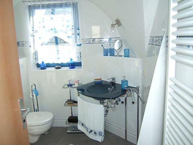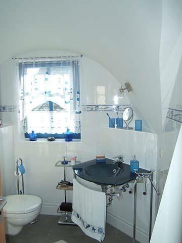 Das Badezimmer mit Fenster ist mit einer Dusche, Waschtisch und WC ausgestattet. Im Erdgeschoss befindet sich ein weiteres Gäste-WC mit Waschtisch und WC.