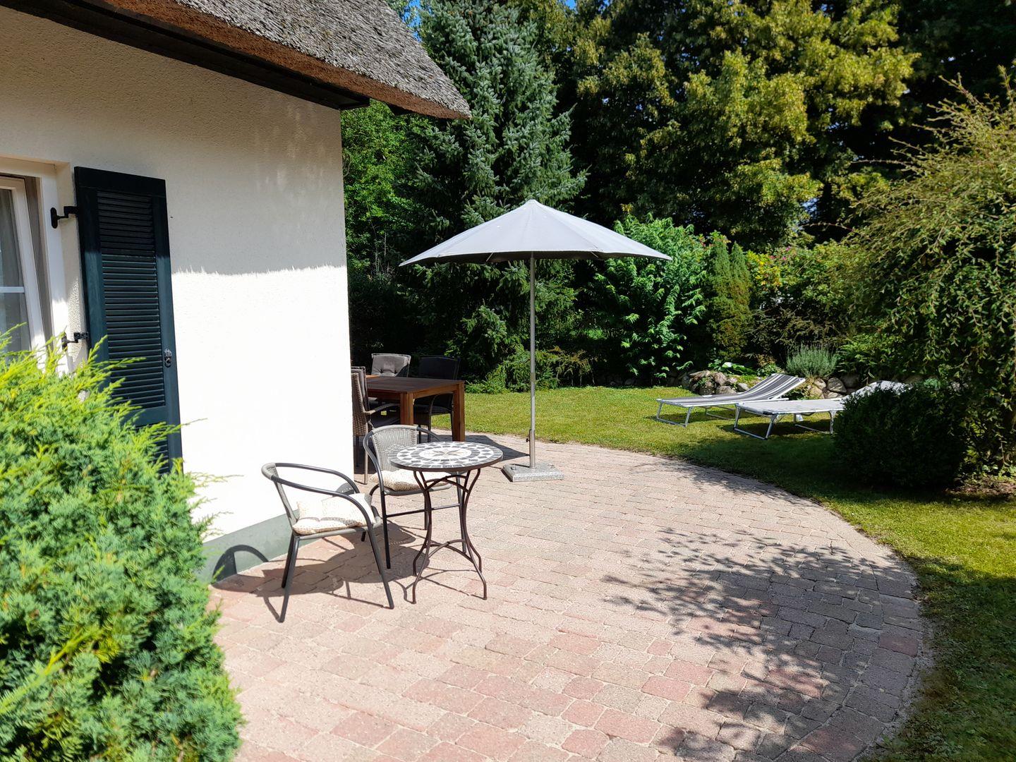 Ein gemütlicher Wohn- und Essbereich in der unteren Etage bietet Ihnen eine komfortable Sofaecke mit TV-Gerät. An den kälteren Tagen sorgt der Kamin für eine angenehme Wärme und Wohlfühlatmosphäre. Ihre Mahlzeiten nehmen Sie entweder am großzügigen Esstisch oder auf der möblierten Terrasse, mit Blick ins Grüne ein.