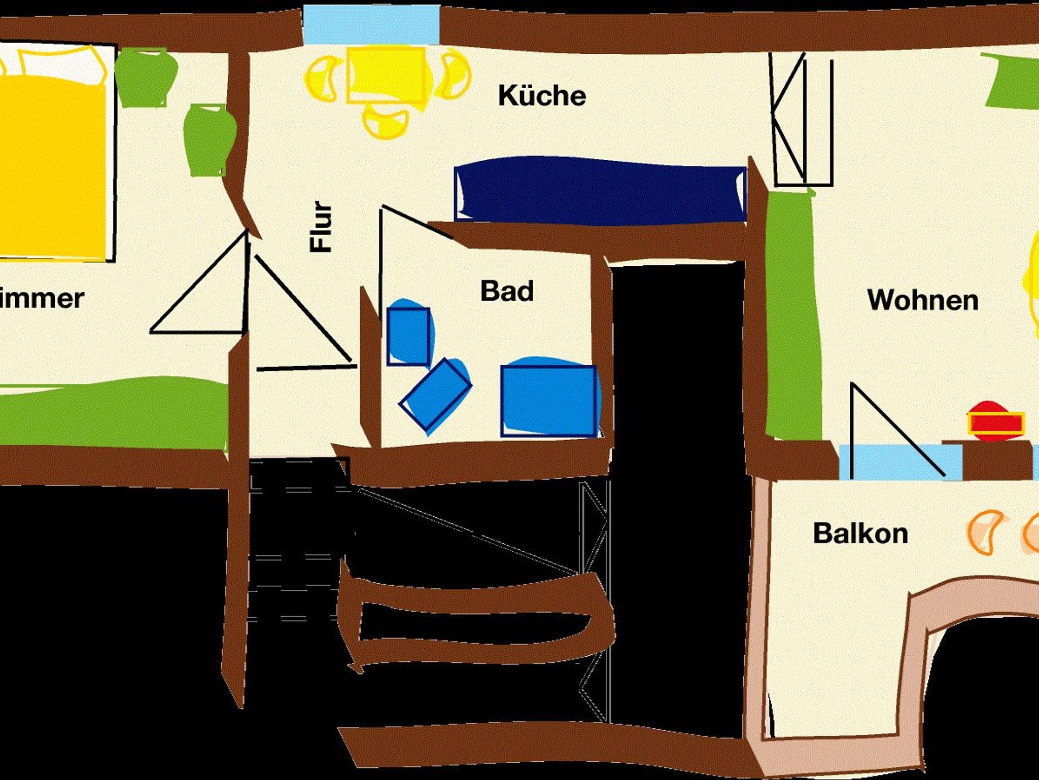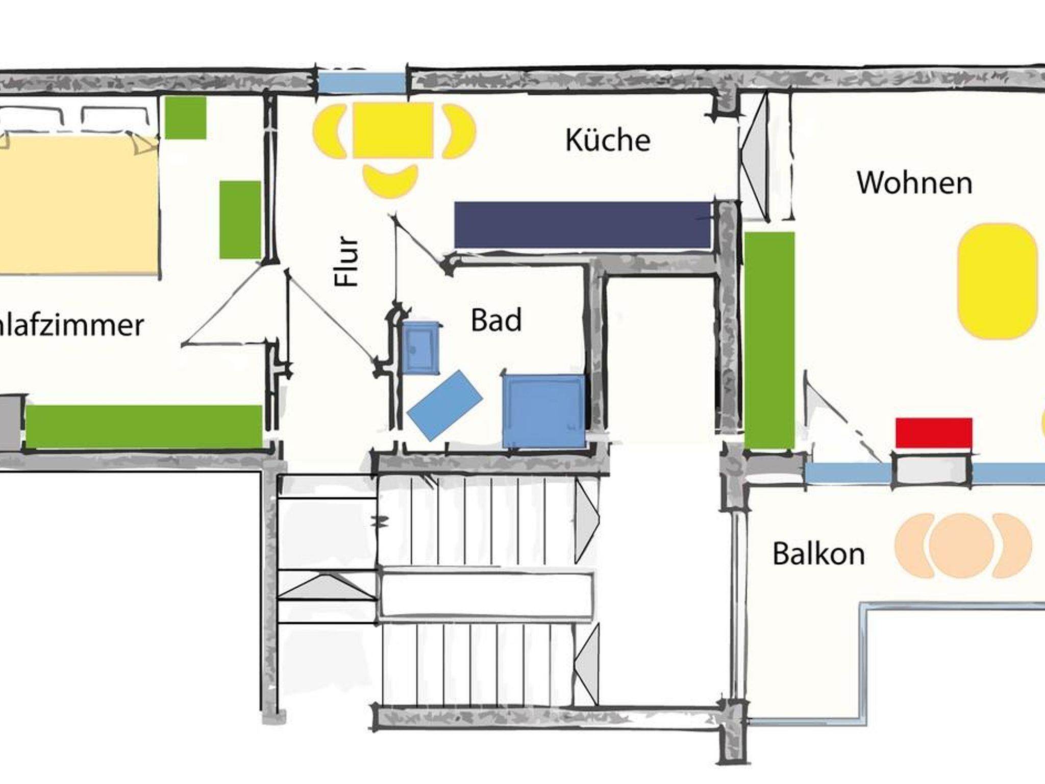 Das Appartement befindet sich im 1. Obergeschoß und hat eine Wohnfläche von ca. 52 qm mit folgender Aufteilung: