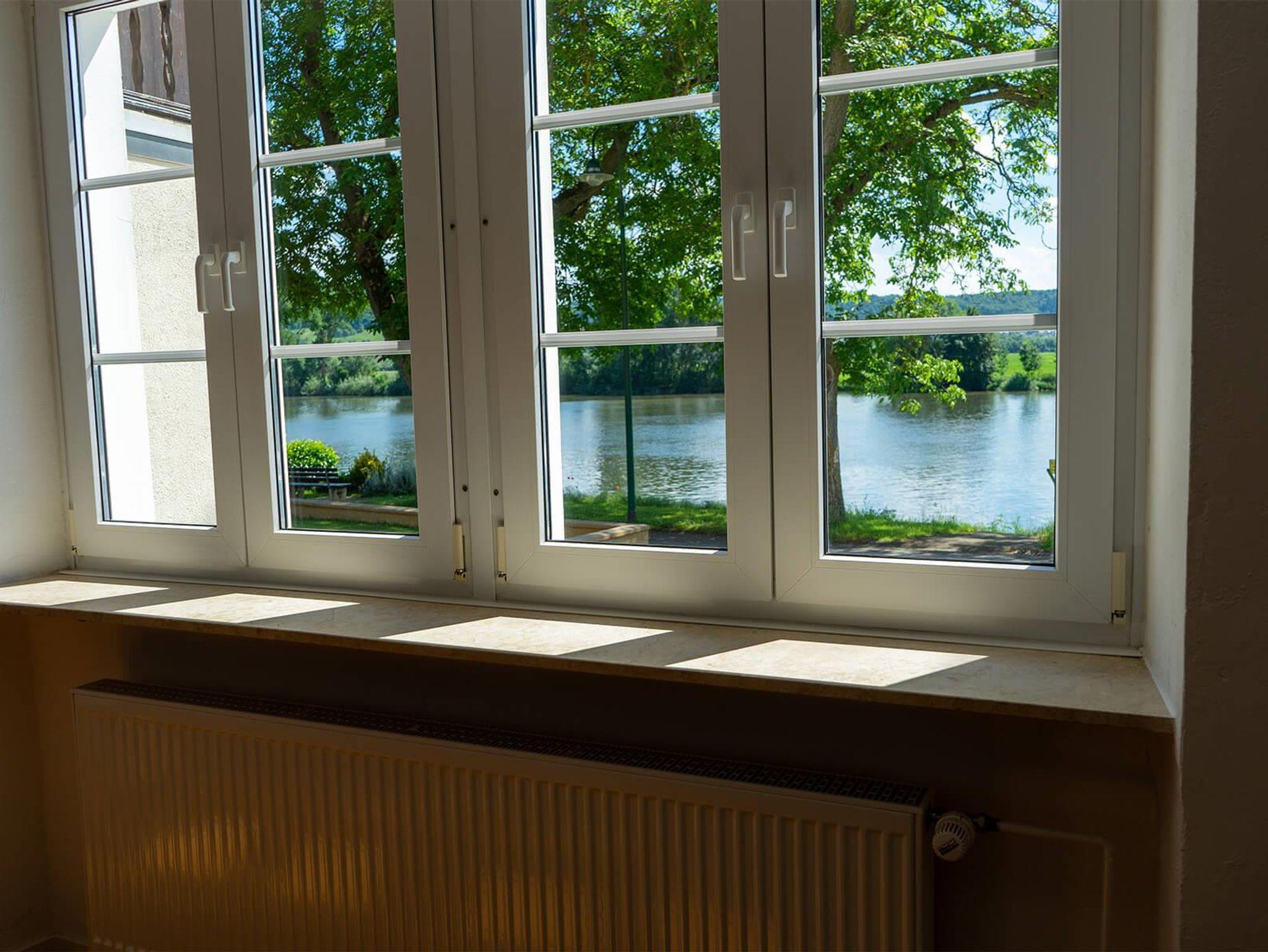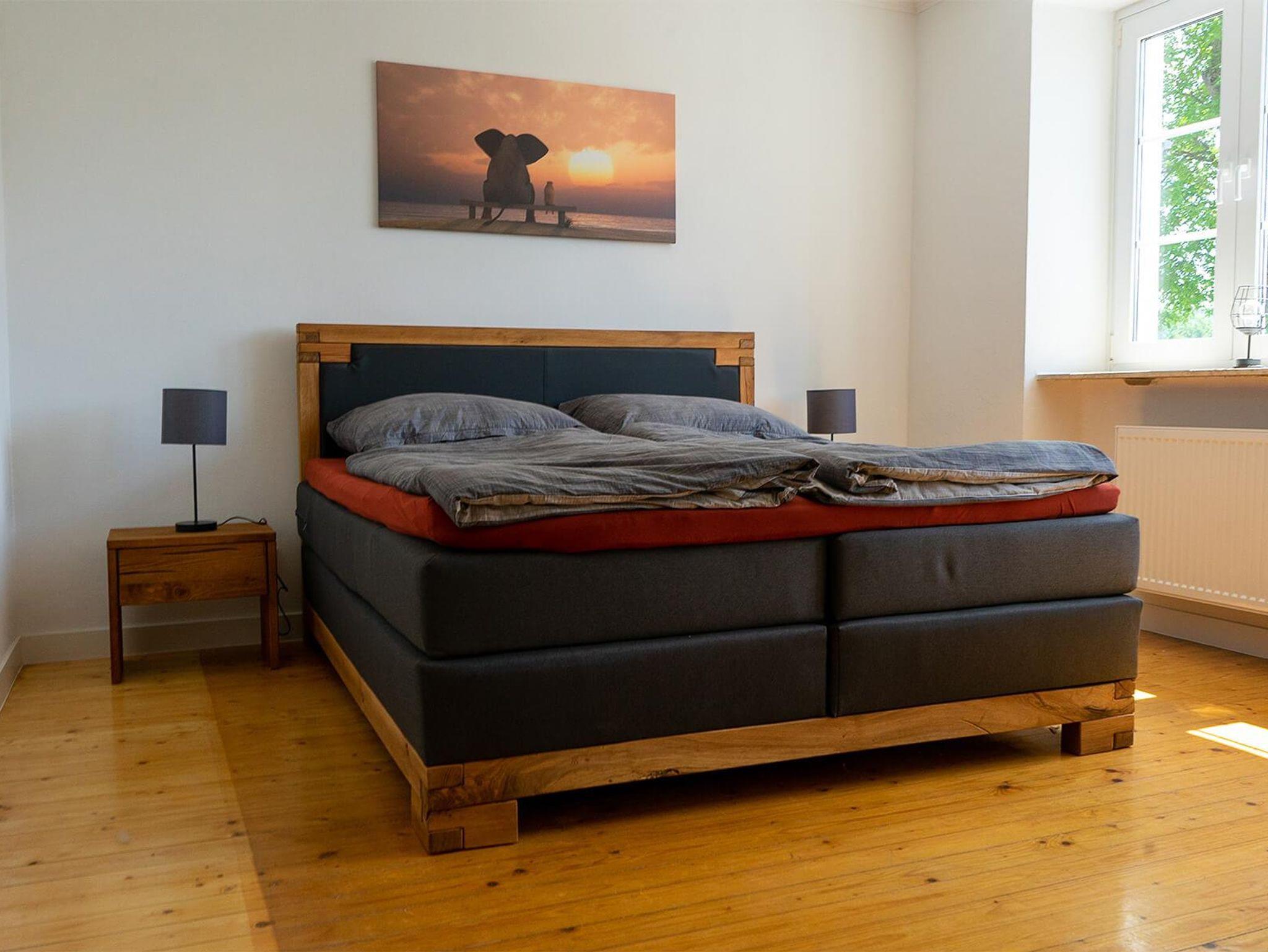 Dieses Schlafzimmer liegt im Erdgeschoss und ist ebenfalls mit einem Doppelbett 1,80m x 2,00m ausgestattet. Außerdem haben Sie den wunderschönen Moselblick wenn Sie aus dem Fenster schauen.