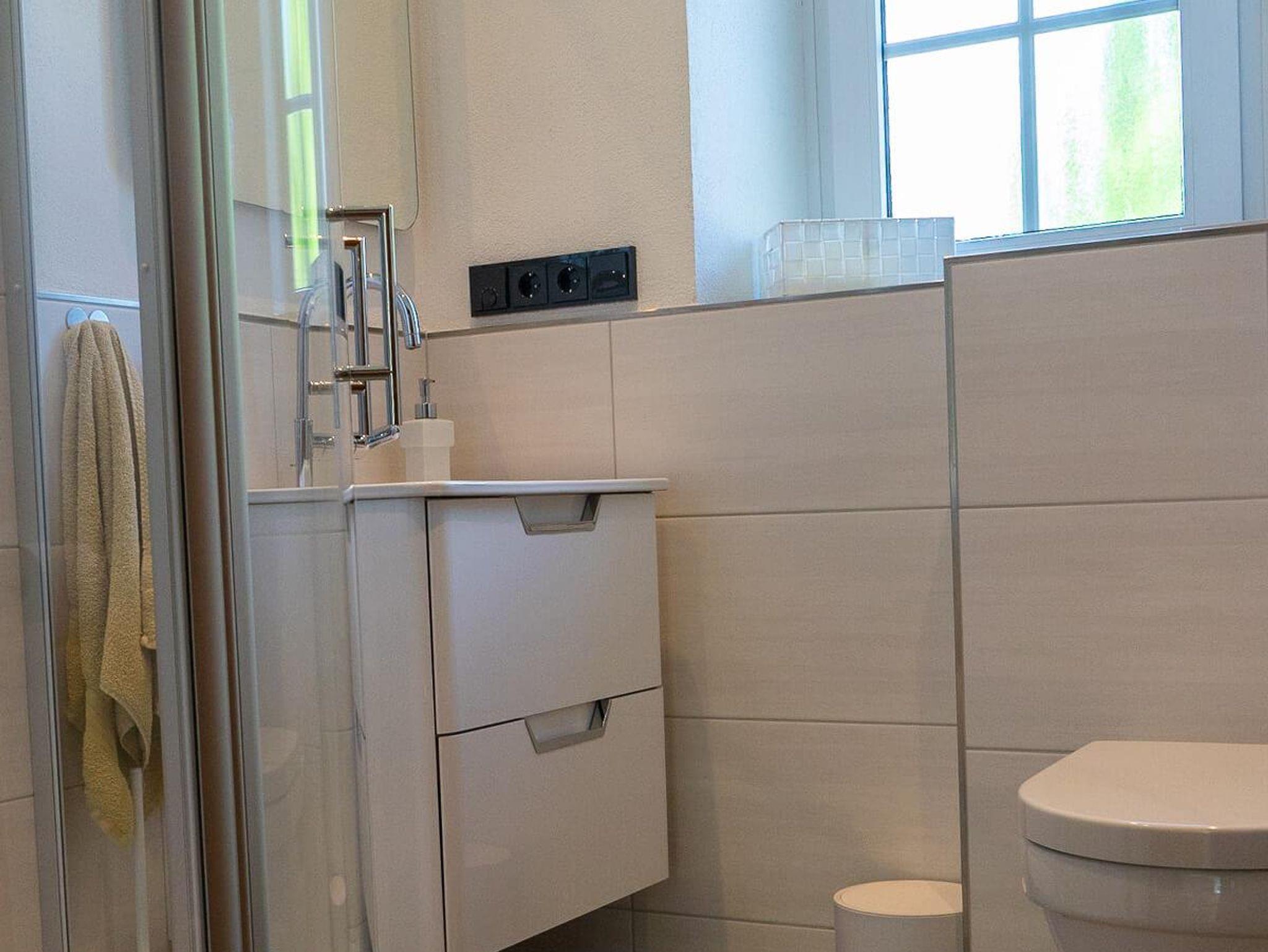 Dieses Schlafzimmer liegt ebenfalls im Erdgeschoss und enthält ein Ausziehbett 2x 0,80m x 2,00m, sowie ein Waschbecken und eine Kommode.