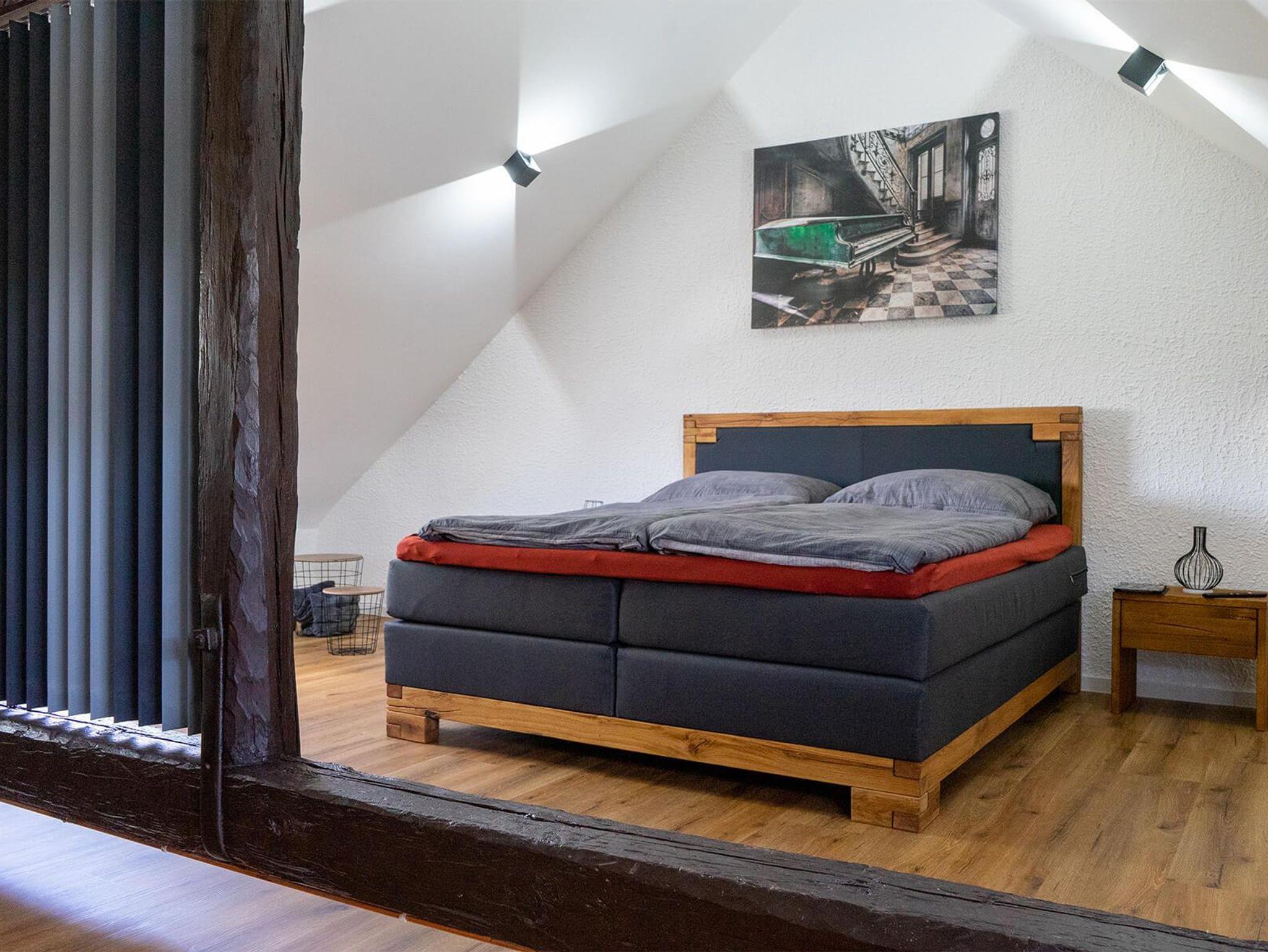 Das größte Schlafzimmer befindet sich im Dachgeschoss und ist mit einem Doppelbett 1,80m x 2,00m ausgestattet. Eine Sitzecke mit zwei Sesseln, ein Flachbildfernseher und eine Toilette mit Waschbecken befinden sich ebenfalls im Zimmer.