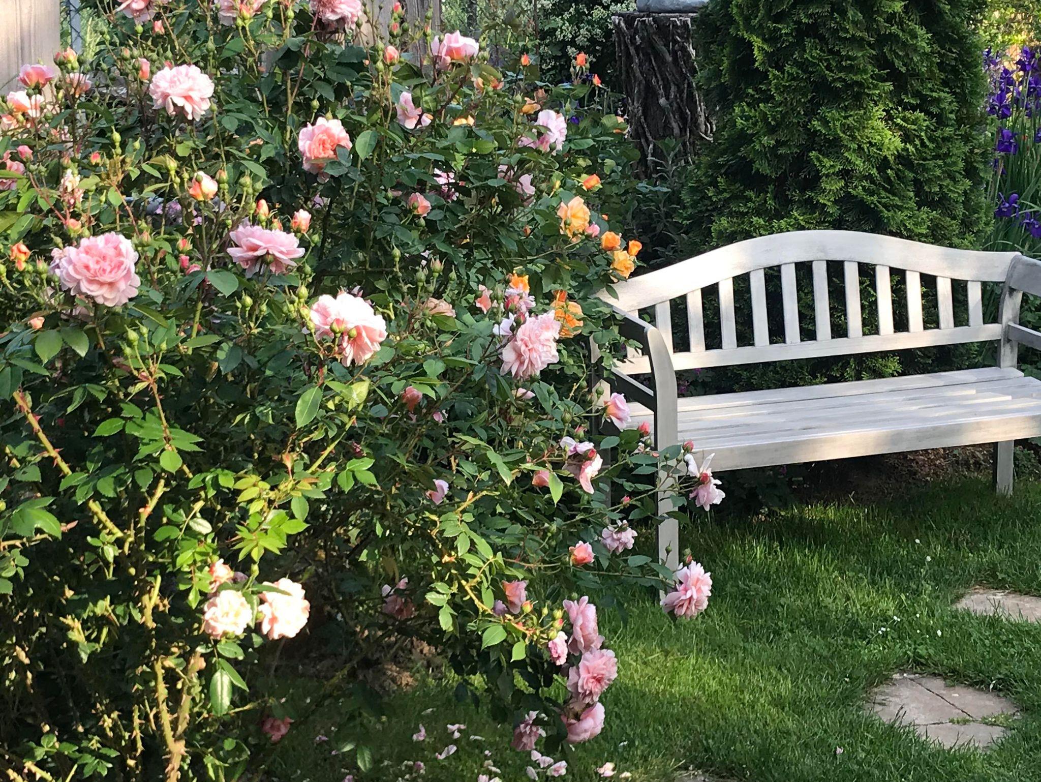 Der naturnahe Garten zeichnet sich durch seine majestätische Linde sowie durch zahlreiche Duftrosen,Staudenpflanzen und Kräuterbeete aus. Es zeigt sich ein abwechslungsreiches Farbenspiel von Rosenblüten, Stauden und Gräsern, Hortensien,Lavendel und anderen Kleingehölzen. Bienen, Hummeln und vielerlei Insekten tummeln sich in den alten Sandsteinen der großen Gartenmauer. Das Spiel von Licht und Schatten verleiht den einzelnen Gartenräumen interessante Stimmungen und alles im Einklang mit der Natur.