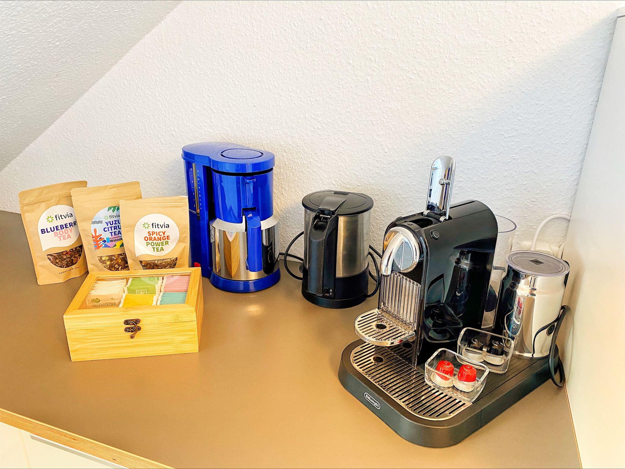 Die Wohnung verfügt über eine sehr gut ausgestattete Küche, in der Sie Ihre Lieblingsgerichte zubereiten können. Hier finden Sie alle notwendigen Utensilien, wie Herd, Backofen, Kühlschrank und Geschirrspüler. Eine kleine Auswahl an Tee steht für Sie bereit sowie eine Nespresso-Kaffeemaschine für erlesenen Kaffeegenuss.