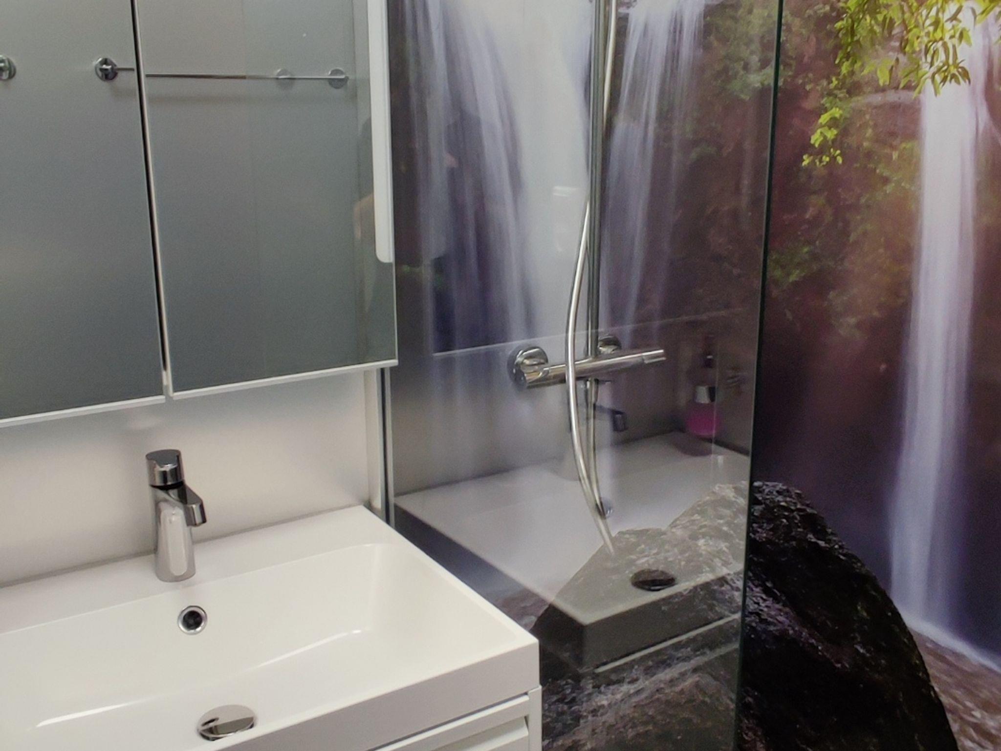 Die Wohnung verfügt über ein geschmackvoll eingerichtetes Schlafzimmer mit Klimaanlage. Das Badezimmer ist mit einer Regendusche ausgestattet.