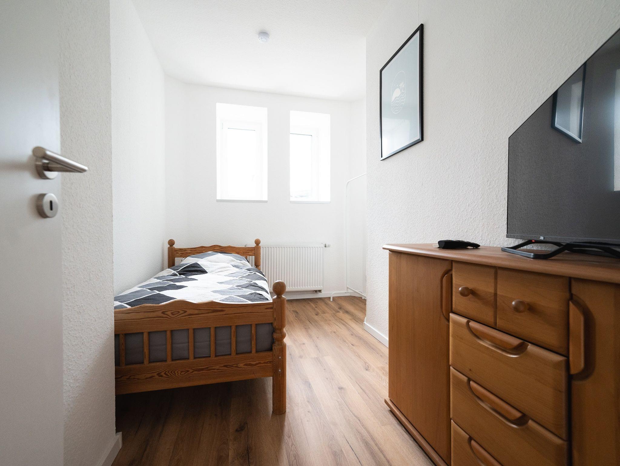 Entdecken Sie unsere einladende Ferienwohnung im Erdgeschoss mit einer Fläche von 65 qm. Sie verfügt über ein Schlafzimmer mit zwei Einzelbetten, ideal für erholsame Nächte. Im Wohnschlafraum erwarten Sie ein weiteres Einzelbett sowie eine praktische Küchenzeile, die Ihnen die Möglichkeit bietet, sich selbst zu verpflegen. Das Badezimmer ist modern ausgestattet mit einer Dusche und WC. Perfekt für einen entspannten Aufenthalt!