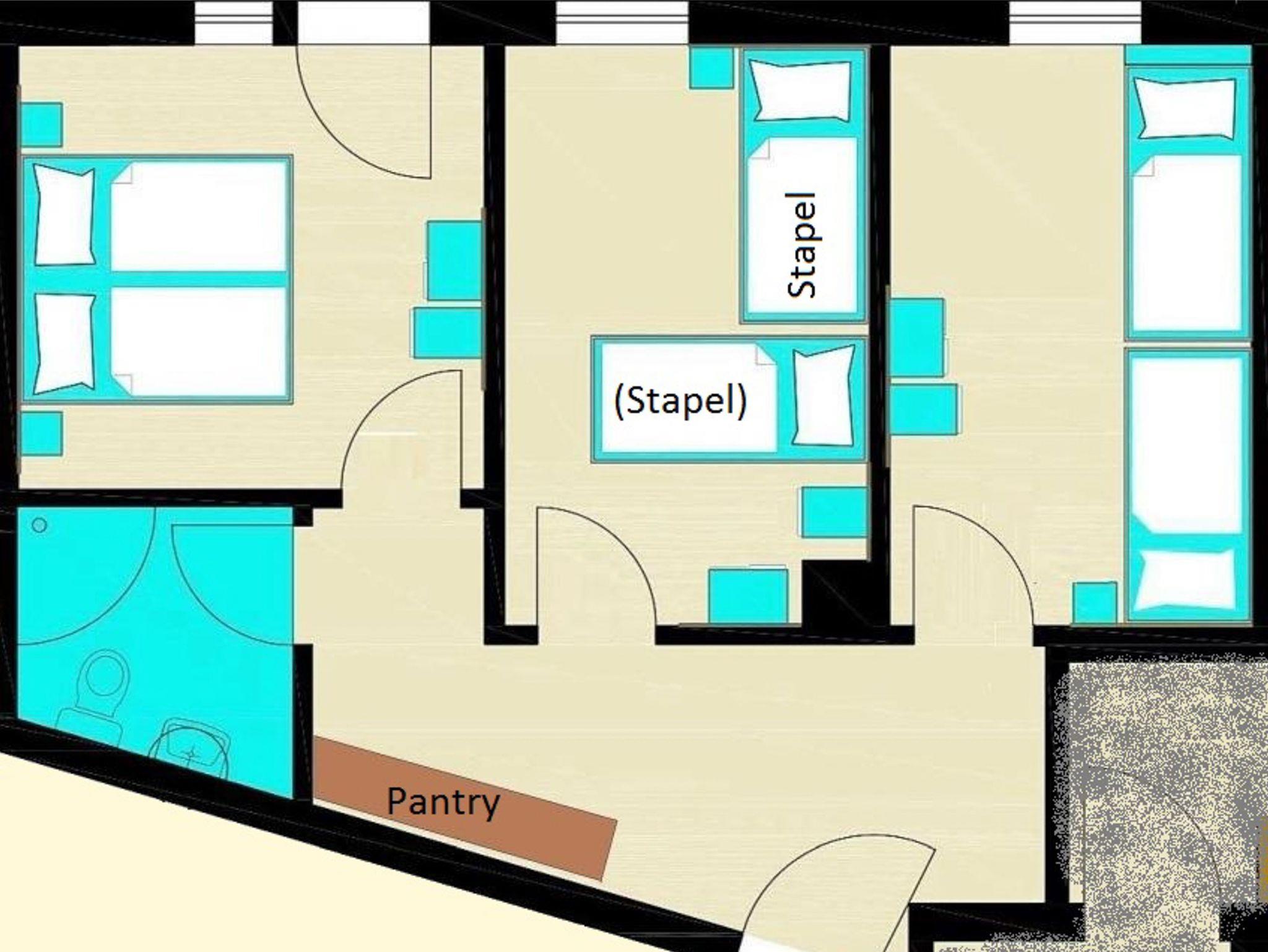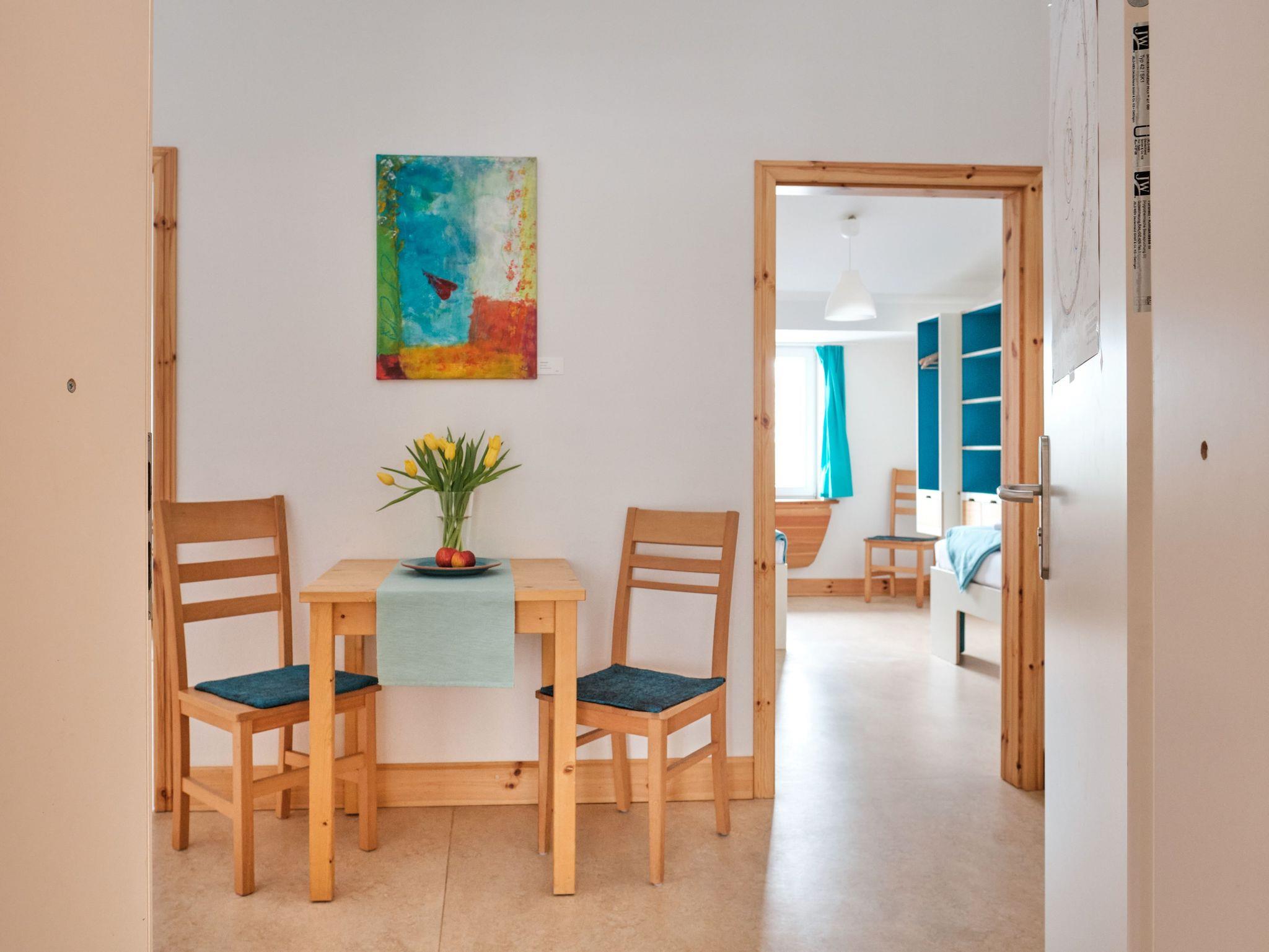 Die drei in Türkis gehaltenen Zimmer teilen sich ein Bad und eine Pantryküche im Flur, so ist eine Selbstversorgung möglich. Die Pantry ist mit allen notwendigen Geräten bester Energieeffiziens ausgestattet. Dieses 12m² Zimmer mit zwei Einzelbetten (90x200) liegt im Obergeschoss und schaut zum Kuhstall, zur Kälberwiese mit rechts dem Kinderbauernhof, dahinter im Rund begrenzen die Bäume vom Seeufer den Ausblick. Die Einrichtung stammt von befreundeten Designern und Tischlern, Künstler vom Hof und seiner Umgebung stellen ihre Bilder und Werke darin aus. Hier stehen zwei Stapelbetten bereit. Das Gästezimmer ist über die Außentreppe und Galerie zu erreichen.