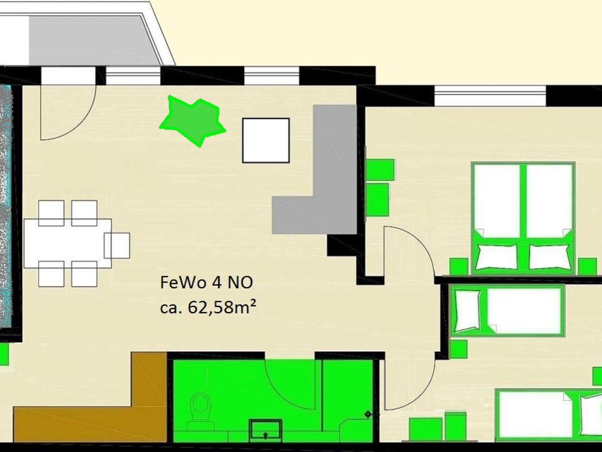 Diese 62m² große nordöstliche Ferienwohnung, in Grün gehalten, ist großzügig geschnitten, liegt im Obergeschoss und blickt zum Kinderbauernhof. Links hinter der Kälberwiese befindet sich der Kuhstall, rechts unten der Reitplatz. Dahinter im Rund begrenzen die Bäume vom Seeufer den Ausblick.