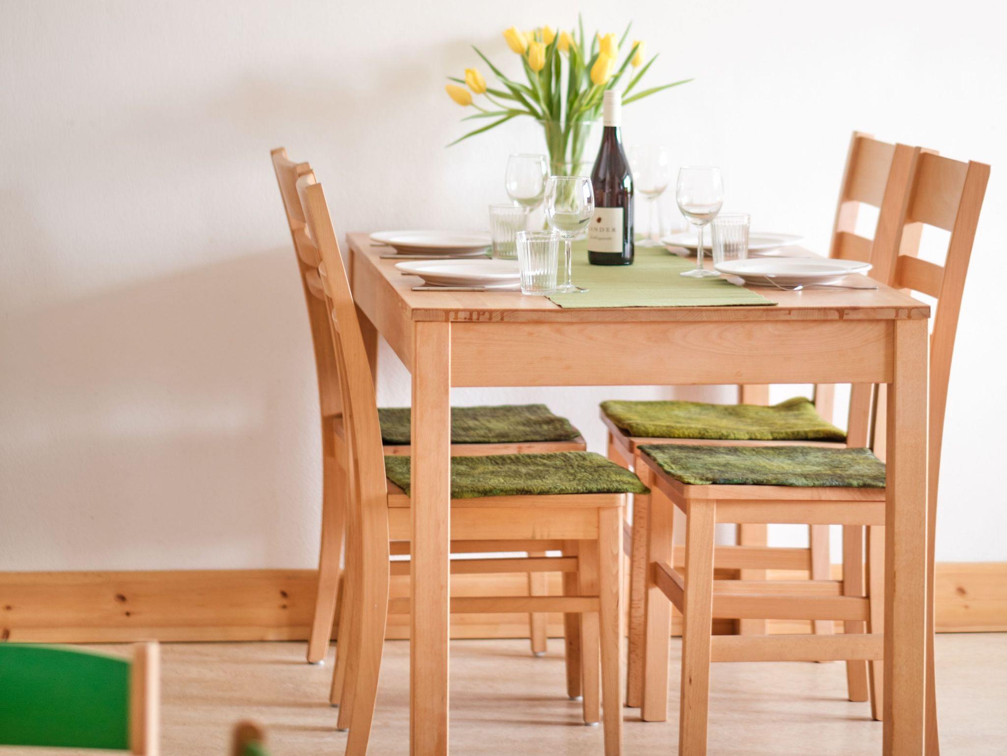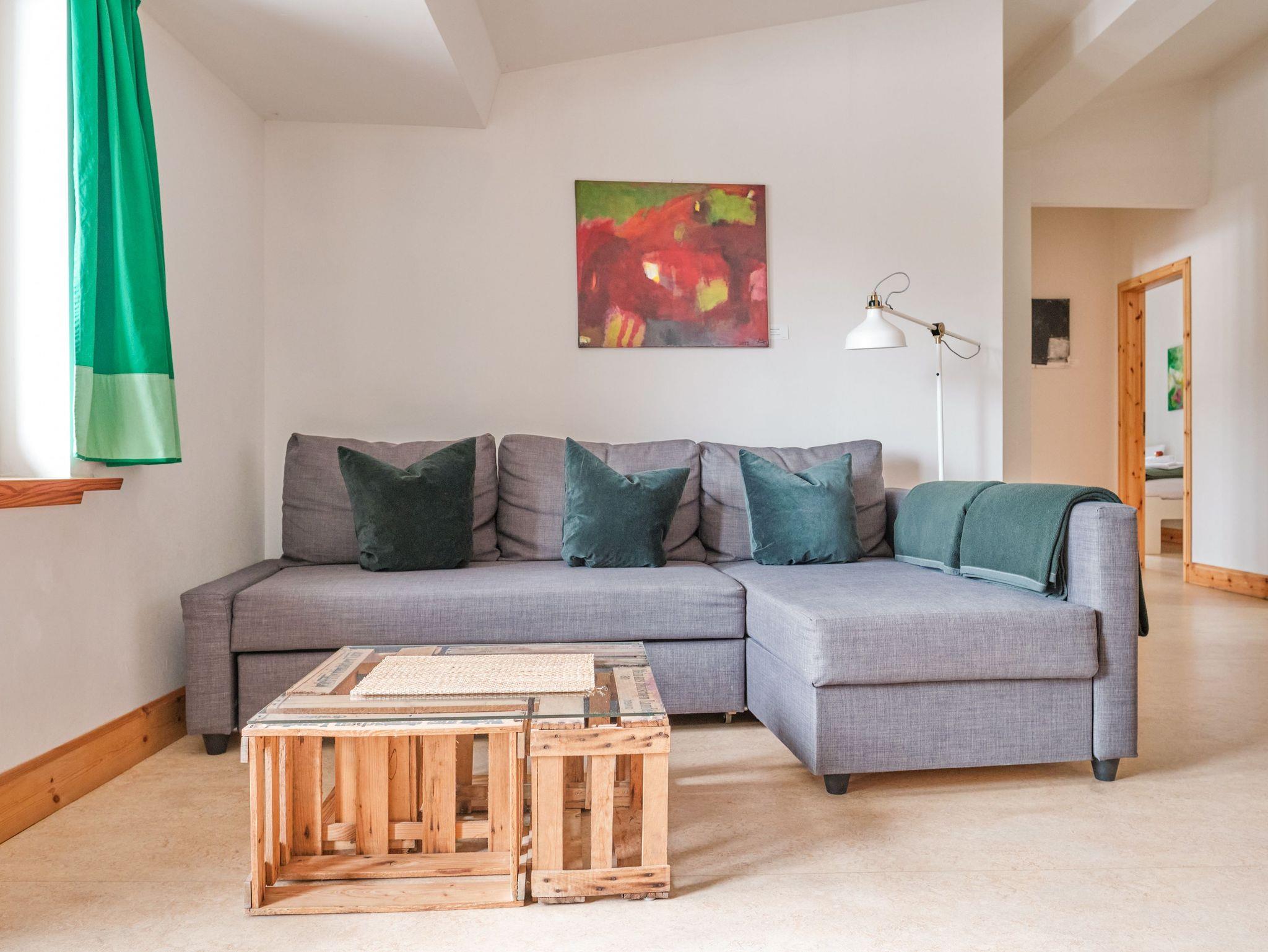 Sie hat 3 Schlafzimmer (1x Schlafzimmer mit Doppelbett (180x200; getrennte Matratzen), 1x Schlafzimmer mit 2 Einzelbetten (90x200), 1x Schlafzimmer mit 1 Einzelbett), Wohnküche mit TV und Bad. Die Einrichtung stammt von befreundeten Designern und Tischlern, Künstler vom Hof und seiner Umgebung stellen ihre Bilder und Werke darin aus. Die Küche ist mit Geräten hohen Komforts und bester Energieeffizienz ausgestattet. Die Ferienwohnung ist über die Außentreppe und Galerie zu erreichen, auch direkt über den eigenen Balkon.