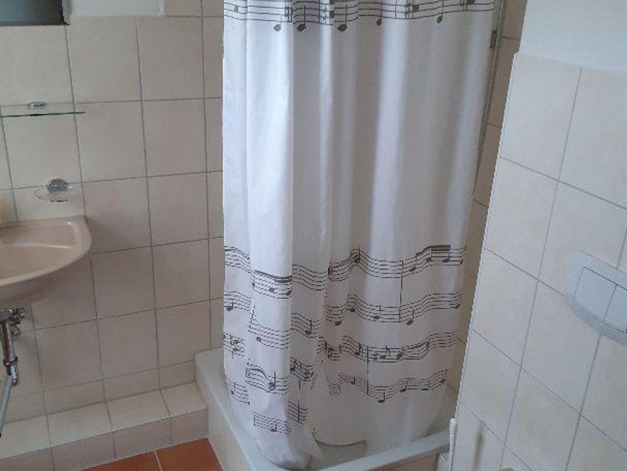 Die Dusche hat keinen Spritzschutz (Duschvorhang).
