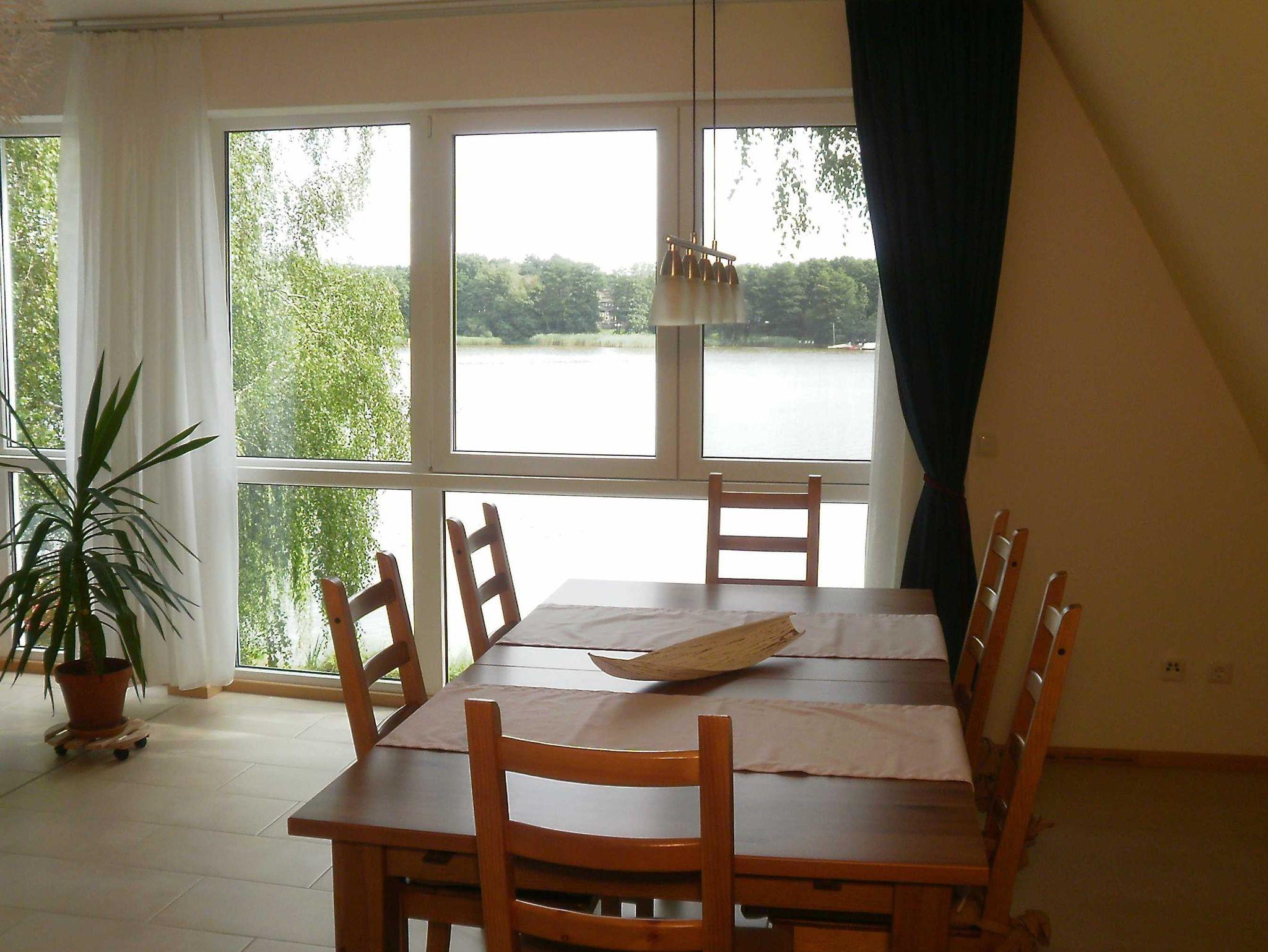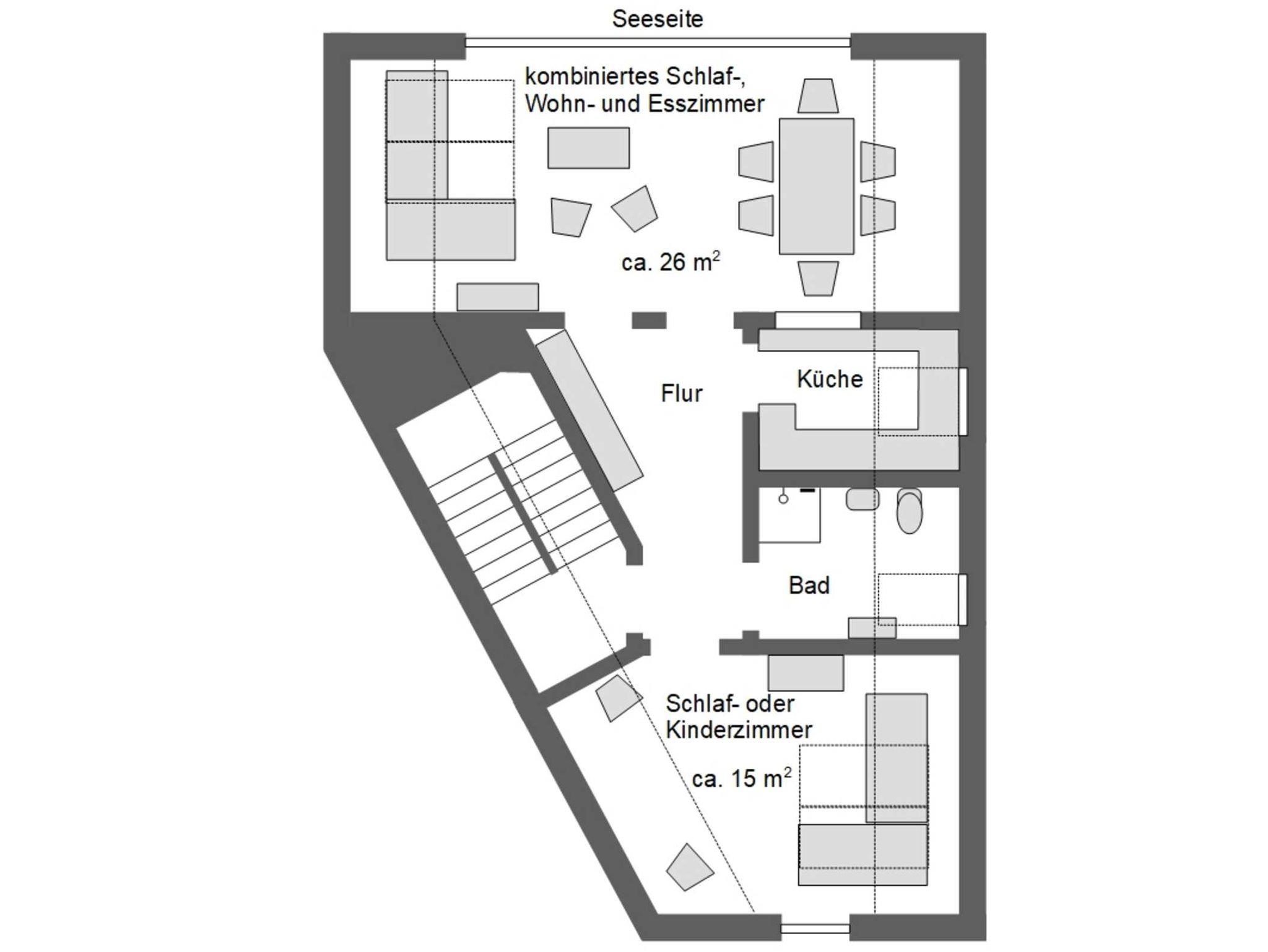 60 qm Ferienwohnung im zweiten Obergeschoss / Dachgeschoss des Ferienwohnhauses komfortabel ausgestattet, 1 Schlafraum, 1 kombinierter Wohn-/Schlafraum, separate Küche mit Durchreiche zum Essplatz, Bad mit Dusche, mit Panoramaverglasung und direktem Seeblick, allergikerfreundlich, Nichtraucher.