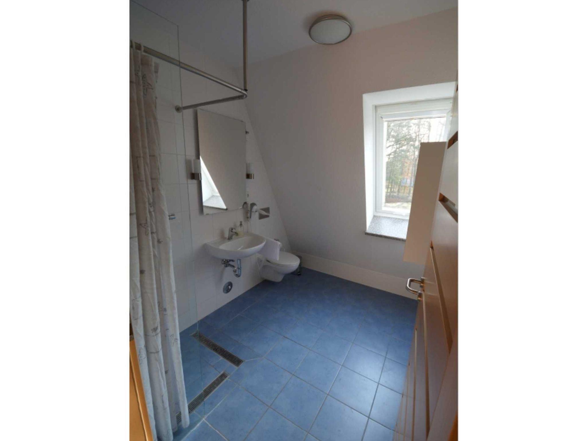 Bad mit WC, Waschbecken, Dusche, Föhn, Badschrank und Handtuchhalter,