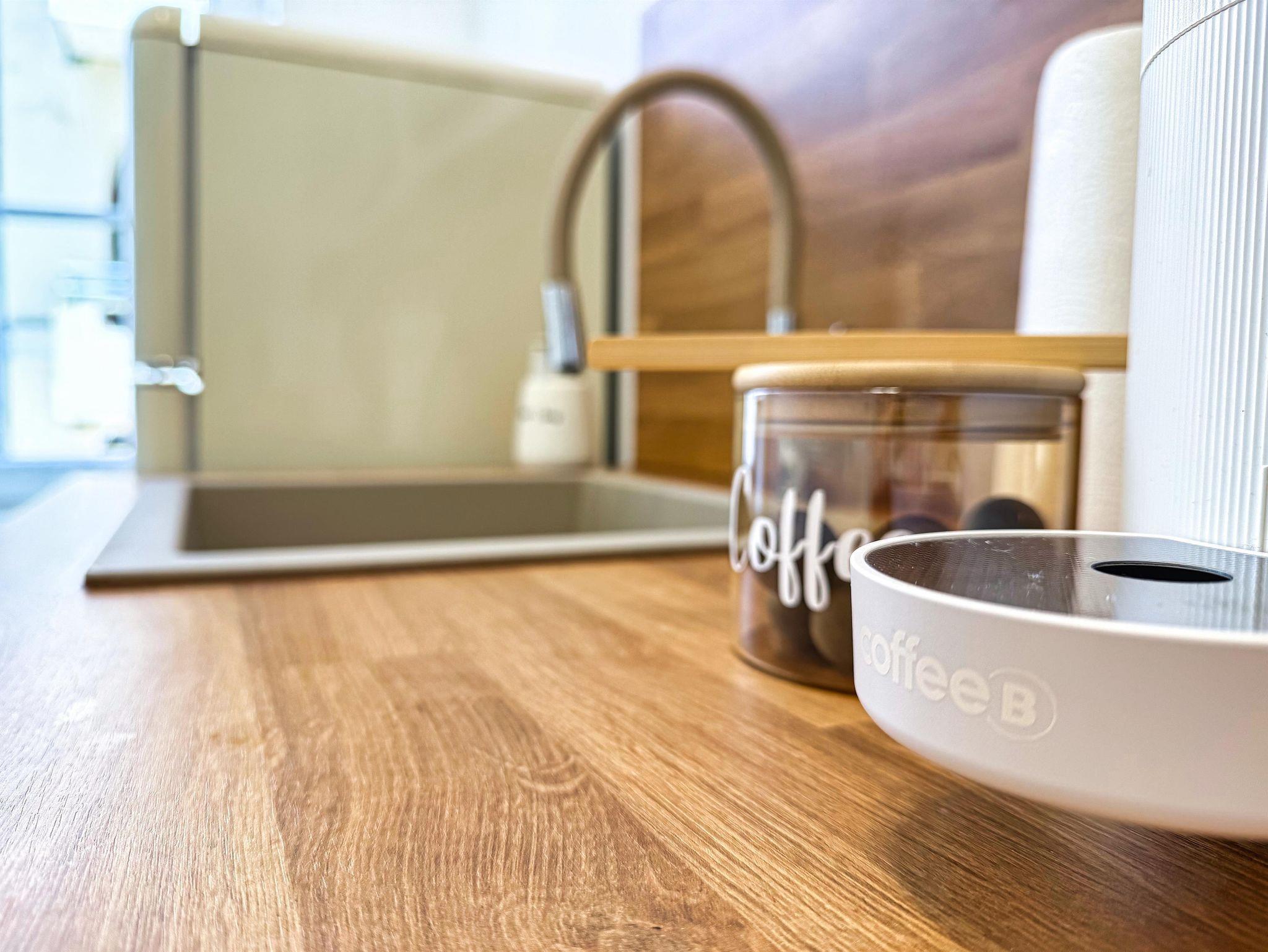 Die moderne Küche ist mit einer Coffee-B-Maschine, Teeauswahl und einem Geschirrspüler ausgestattet.