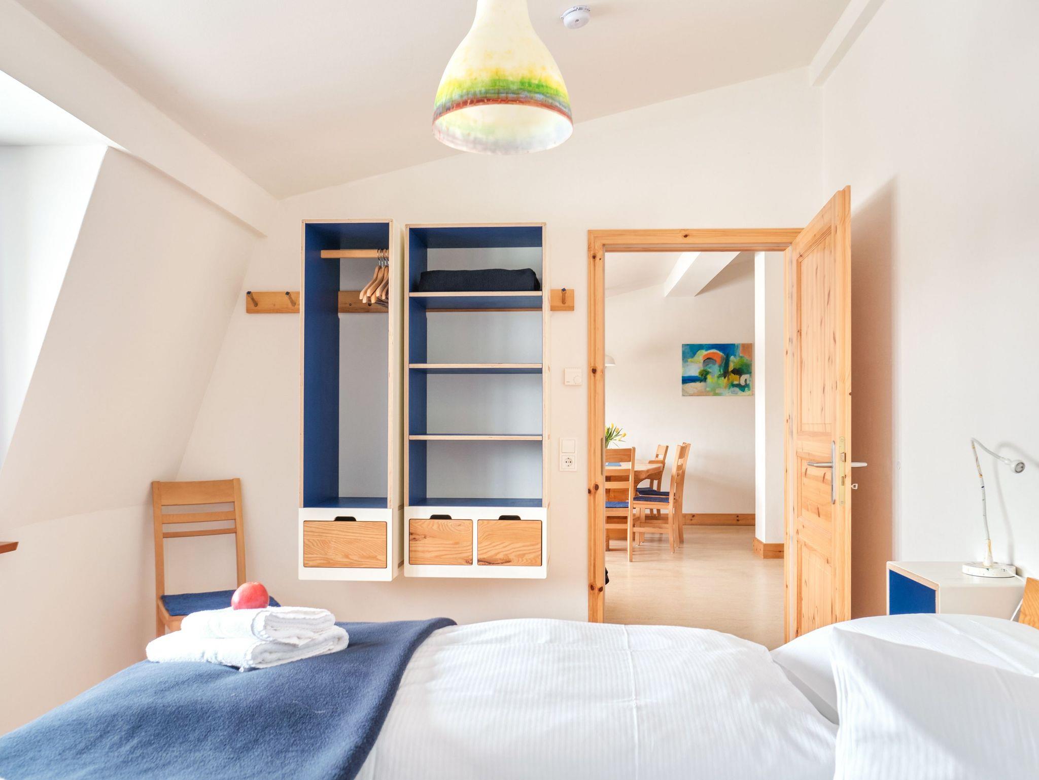 Diese 76m² große nordwestliche Ferienwohnung, in Blau gehalten, ist großzügig geschnitten, liegt im Obergeschoss und schaut zum Kuhstall, zur Kälberwiese mit rechts dem Kinderbauernhof, dahinter im Rund begrenzen die Bäume vom Seeufer den Ausblick.