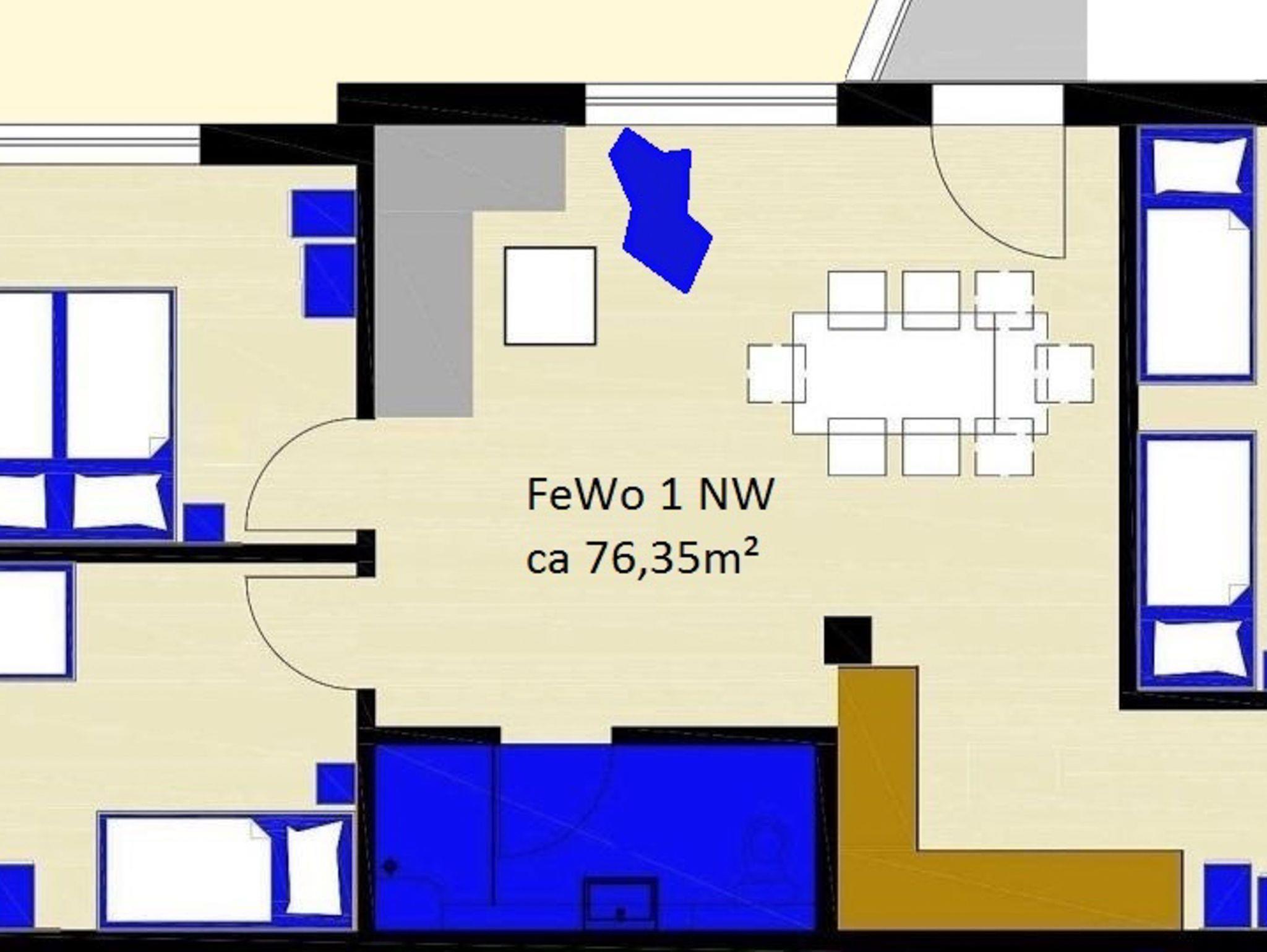 Sie verfügt über eine Wohnküche mit TV, 3 Schlafzimmer (1 x Doppelbettzimmer mit Doppelbett (180x200; getrennte Matratzen), 2 x Zweibettzimmer (90x200)) sowie ein Bad mit Dusche und WC. Im Wohnbereich steht zusätzlich eine Schlafcouch (140x200) als Aufbettung für 1 Person zur Verfügung. Die Küche ist mit Geräten hohen Komforts und bester Energieeffizienz ausgestattet. Die Ferienwohnung ist über die Außentreppe und Galerie zu erreichen, auch direkt über den eigenen Balkon.