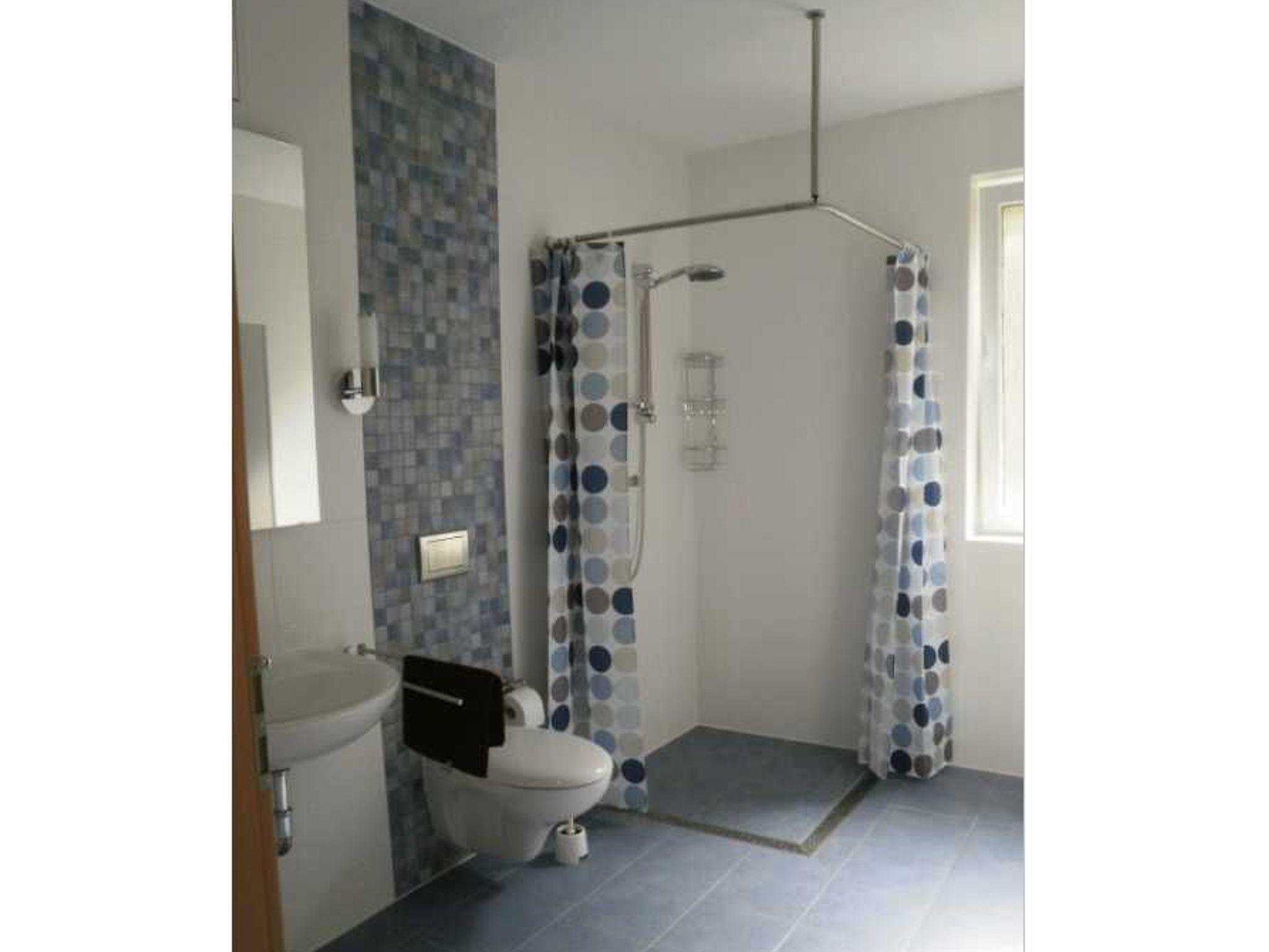 Bad mit WC, Waschbecken, Dusche, Föhn, Badschrank und Handtuchhalter,