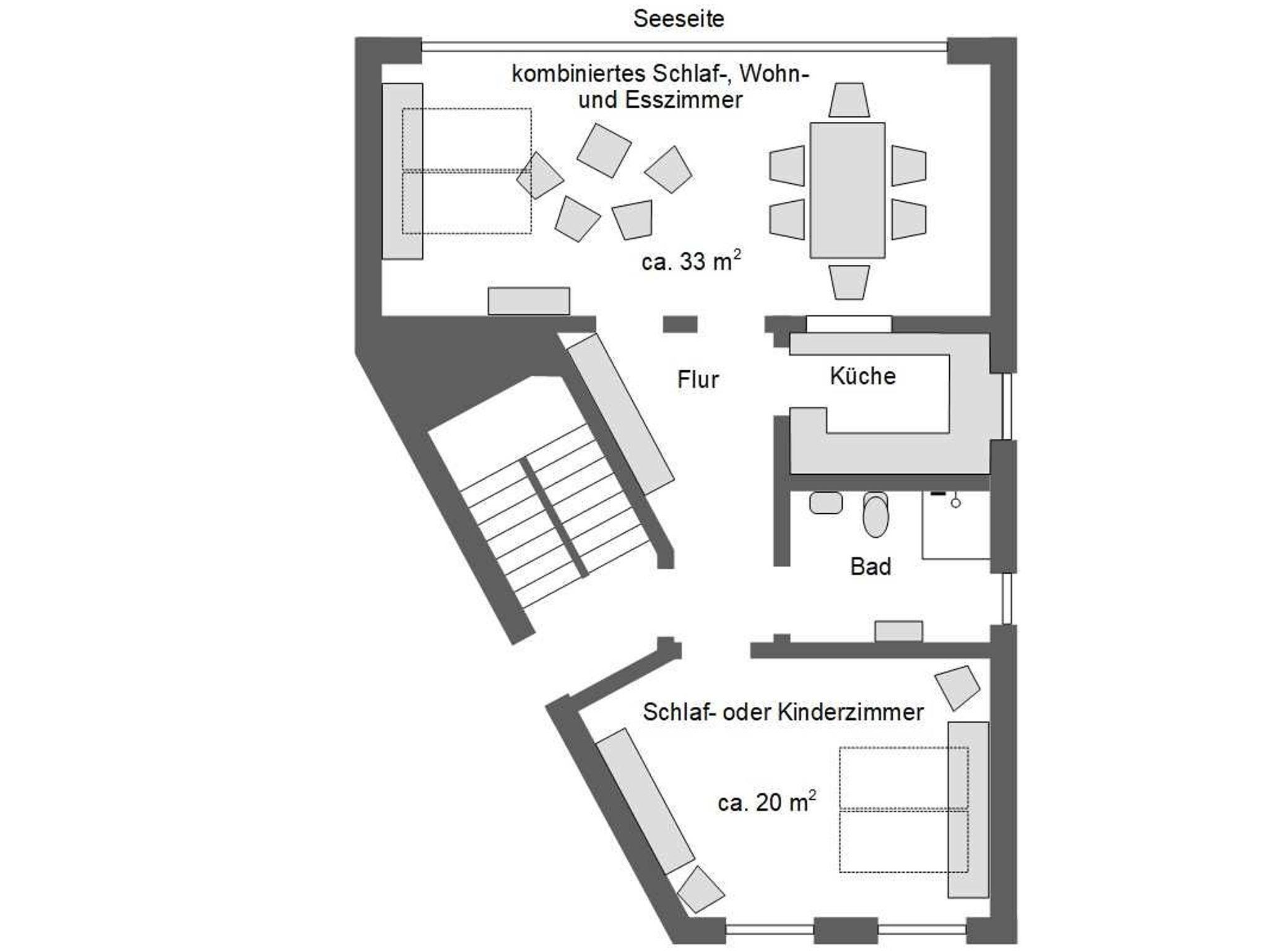 75 qm Ferienwohnung im Erdgeschoss des Ferienwohnhauses, komfortabel ausgestattet, 1 Schlafraum, 1 kombinierter Wohn-/Schlafraum, separate Küche mit Durchreiche zum Essplatz, Bad mit Dusche, mit Panoramaverglasung und direktem Seeblick, allergikerfreundlich, Nichtraucher, stufenlos erreich- und nutzbar.