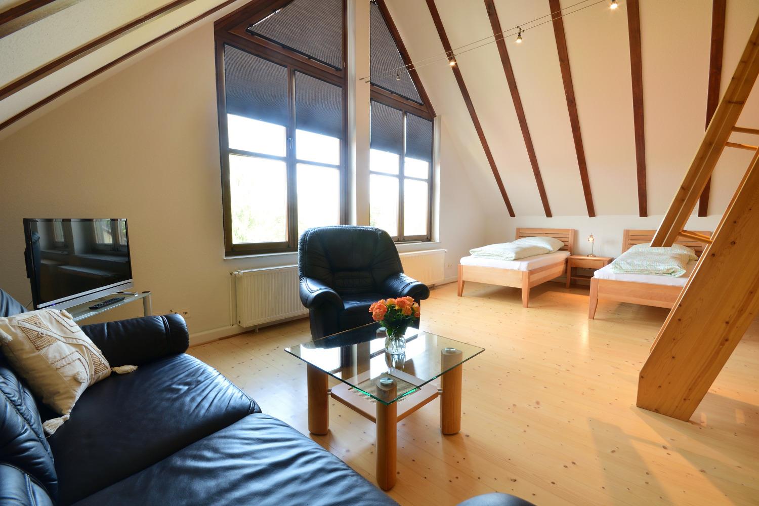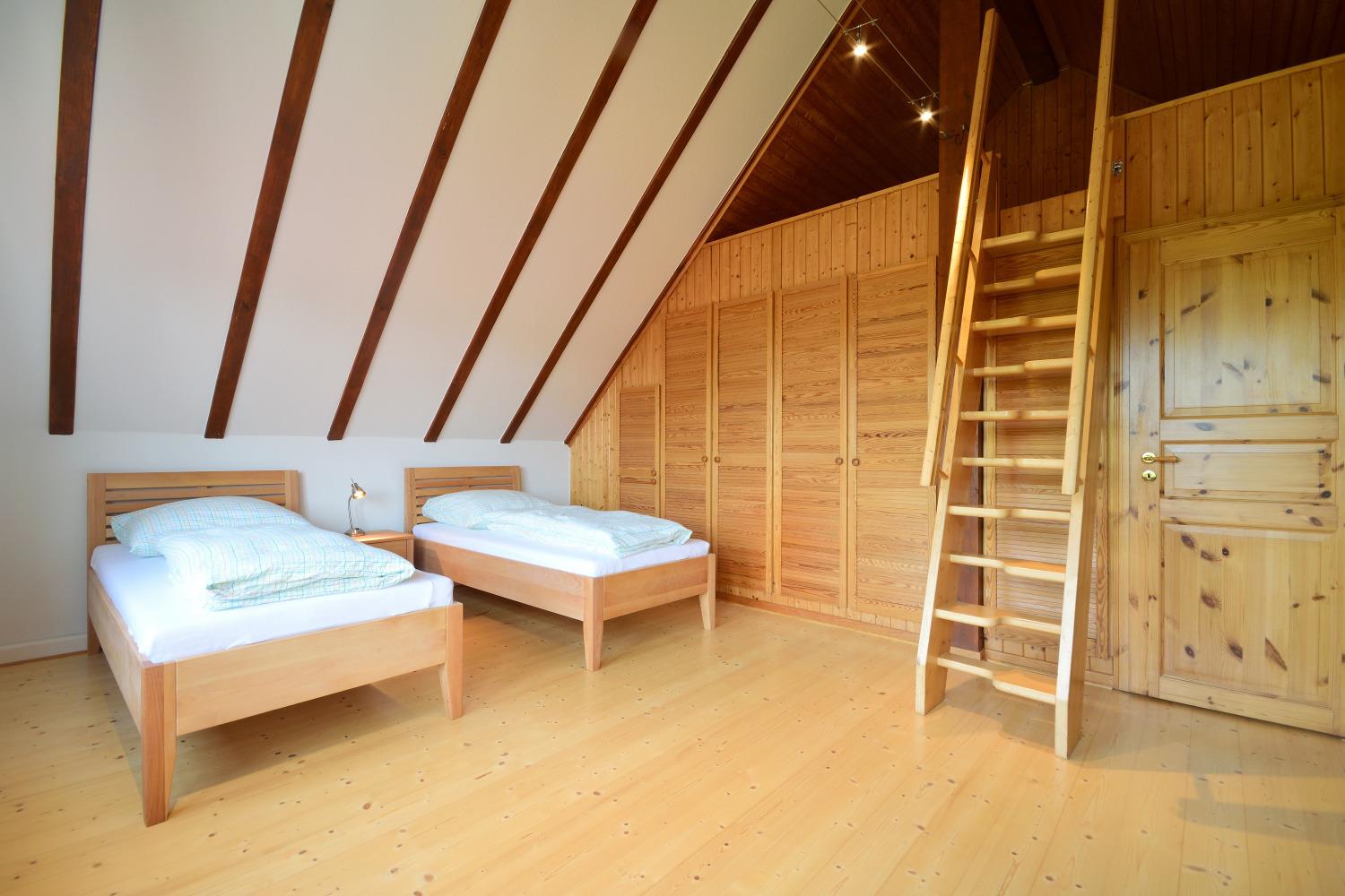 Über eine Treppe erreichen Sie das 1. Obergeschoss. Im großen Ankleidezimmer, mit vielen Schränken, findet Ihr gesamtes Urlaubsgepäck Platz. Auf dieser Etage befinden sich zudem das große Bad mit Badewanne, Fußbodenheizung, WC und 2 Wachbecken sowie drei Schlafzimmer. 2 Schlafzimmer sind mit Doppelbett ausgestattet. Die Fenster besitzen Rollläden. Das 3. Schlafzimmer ist mit 2 Einzelbetten + einer Schlafempore mit 2 Matratzen eingerichtet. Von diesem Zimmer haben Sie einen Blick zum Schweriner See. Ein Sofa, Sessel und weiterer TV steht Ihnen hier ebenfalls zur Verfügung.
