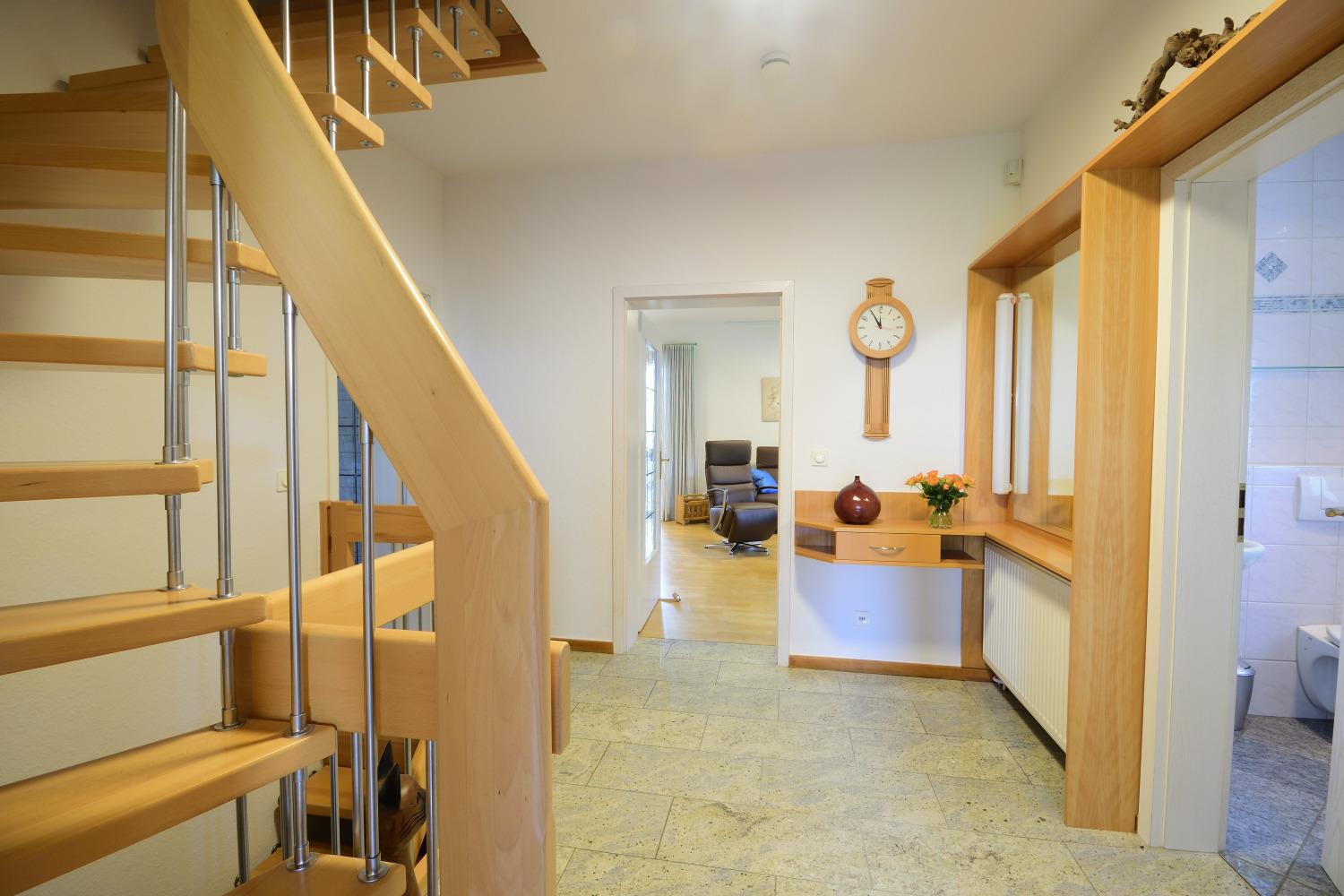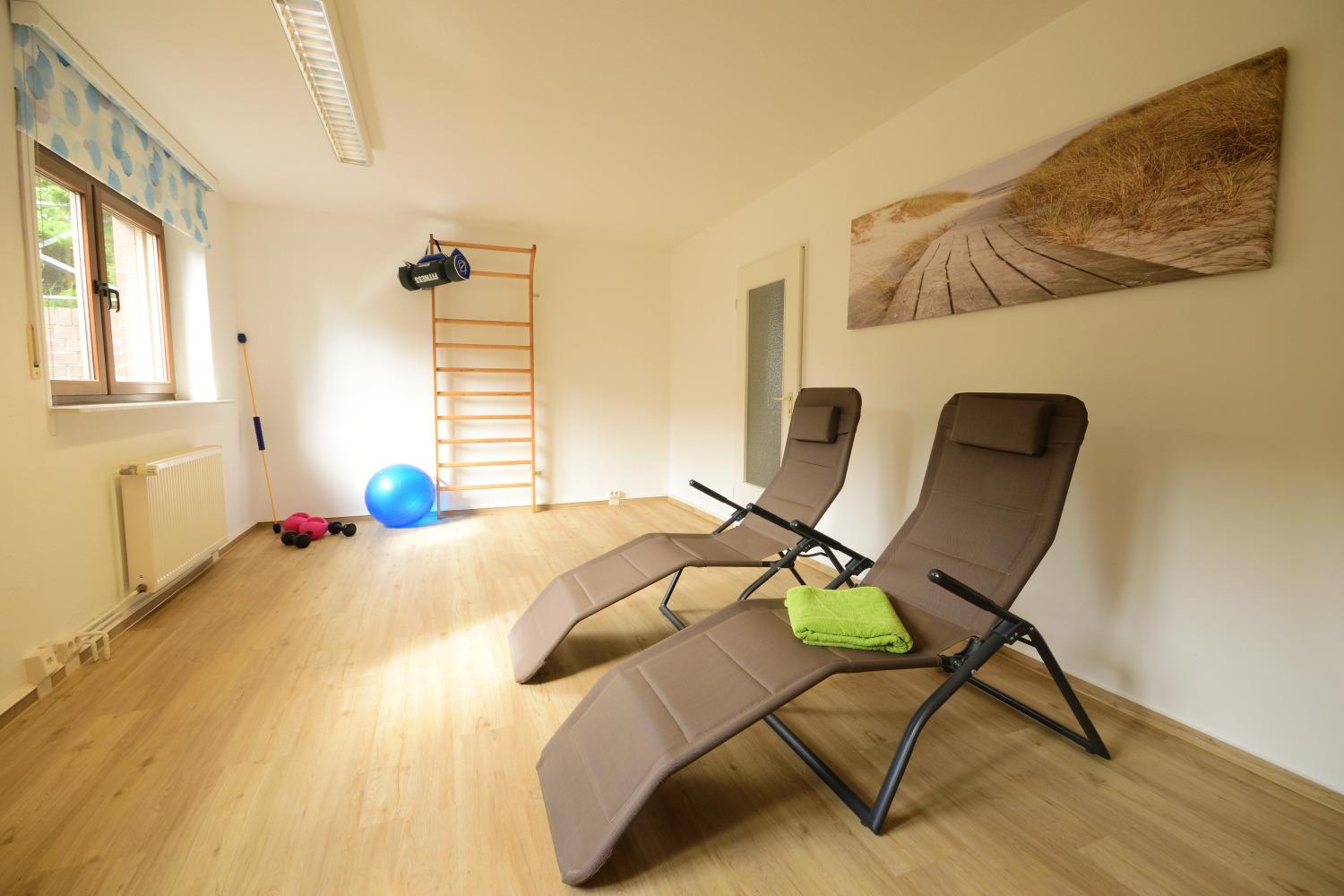 In der unteren Etage befindet sich Ihr privater Freizeitbereich. Hier steht Wellness, Sport und Spiel auf dem Programm. Verwöhnen Sie Ihren Körper in der großen Infrarot Sauna, entspannen Sie auf den Relax liegen im Ruheraum oder fordern Sie Ihren Körper mit den Fitnessgeräten heraus. Ein kleiner Billardtisch steht Ihnen im Spielzimmer für gesellige Stunden bereit. Der Waschmaschinenraum befindet sich ebenfalls auf dieser Etage.