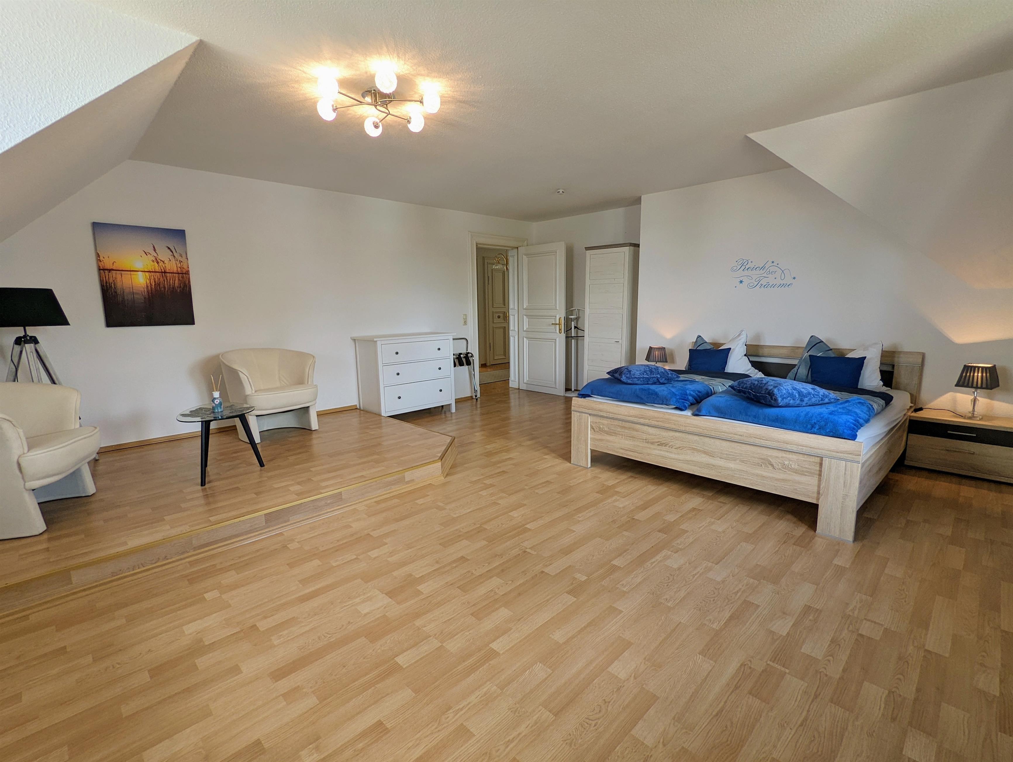 Auf 100 m² Wohnfläche bietet die Ferienwohnung genügend Freiraum für 2 Personen. Die Wohnung erstreck sich über das gesamte Dachgeschoss und bietet dadurch den schönsten Blick über den Schweriner See, bis zum Horizont. Von der Diele gelangen Sie in alle Räume. Das Wohnzimmer lädt mit einer großen Sofalandschaft und einem Essbereich zu gemütlichen Stunden ein. Vom Wohnbereich gelangen Sie auf den kleinen Balkon. Genießen Sie den freien Blick über den ganzen Schweriner See und zur Insel Kaninchenwerder. Das Schlafzimmer bietet mit seinem Doppelbett und der Leseecke einen idealen Ruhebereich. Auch von hier haben Sie einen wundervollen Blick auf den See. Auf Wunsch können Sie ein zweites Schlafzimmer mit Einzelbett hinzu bekommen. In der voll ausgestatteten Küche können Sie Ihre Lieblingsspeisen zubereiten. Das Bad ist mit Badewanne und einer großen Dusche ausgestattet. Zur Unterhaltung stehen Ihnen ein Smart-TV und WLAN zur Verfügung. Parken können Sie direkt vor dem Haus. Ein SUP (Stand Up Paddle) können Sie kostenfrei nutzen.