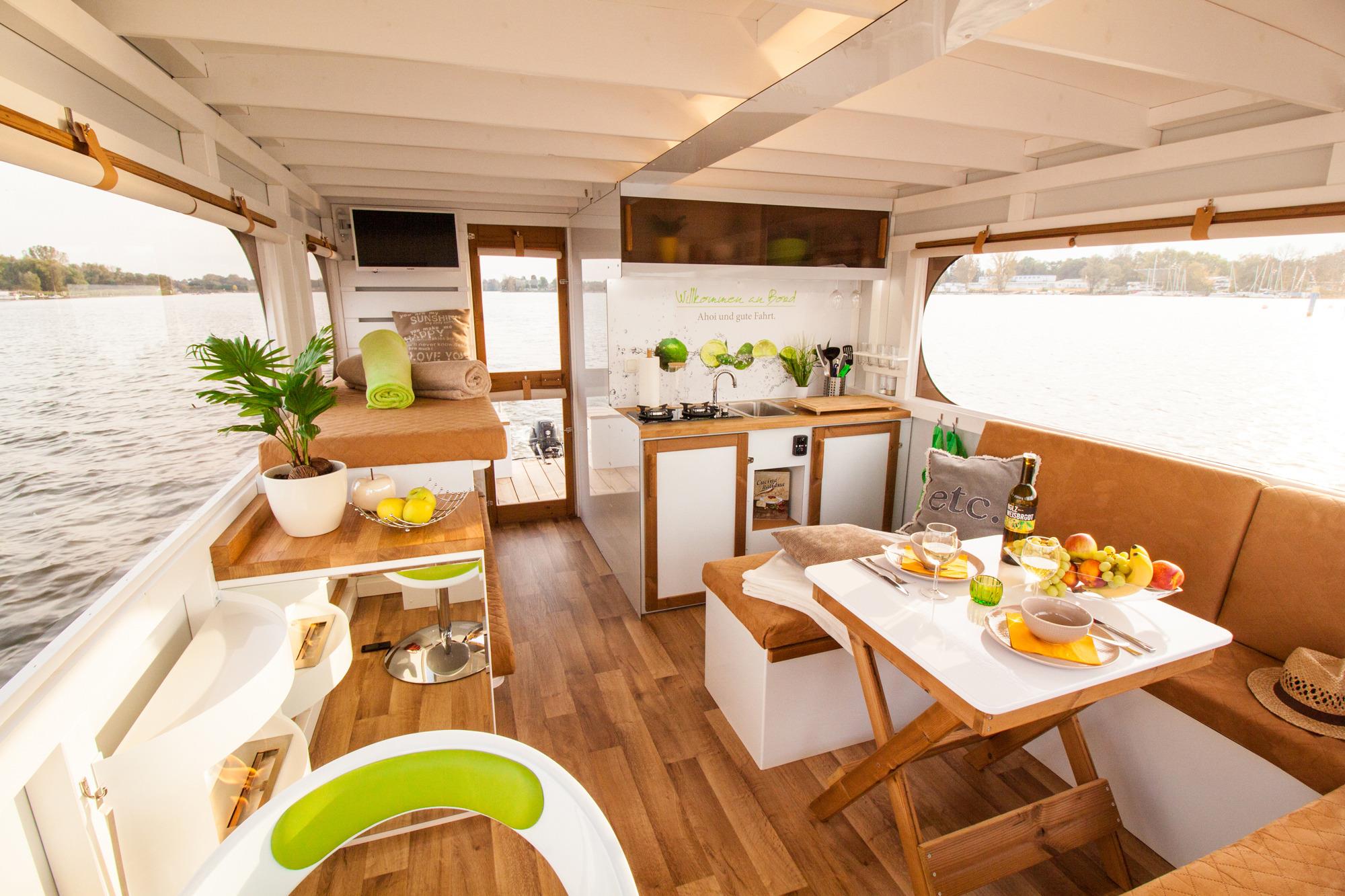 Unser Hausboot bietet Ihnen den Komfort einer Ferienwohnung auf dem Wasser. Aufgrund der Solaranlage können Sie einige Zeit auf dem See verbringen ohne eine Marina anlaufen zu müssen. Das absolute Highlight ist unsere Bugterrasse. Von hier aus können Sie den Sonnenauf- und Sonnenuntergang genießen. In der Küche finden Sie alles was für die Zubereitung eines guten Essens erforderlich ist. Starten Sie Ihr persönliches Abenteuer mit einem der Hausboote.