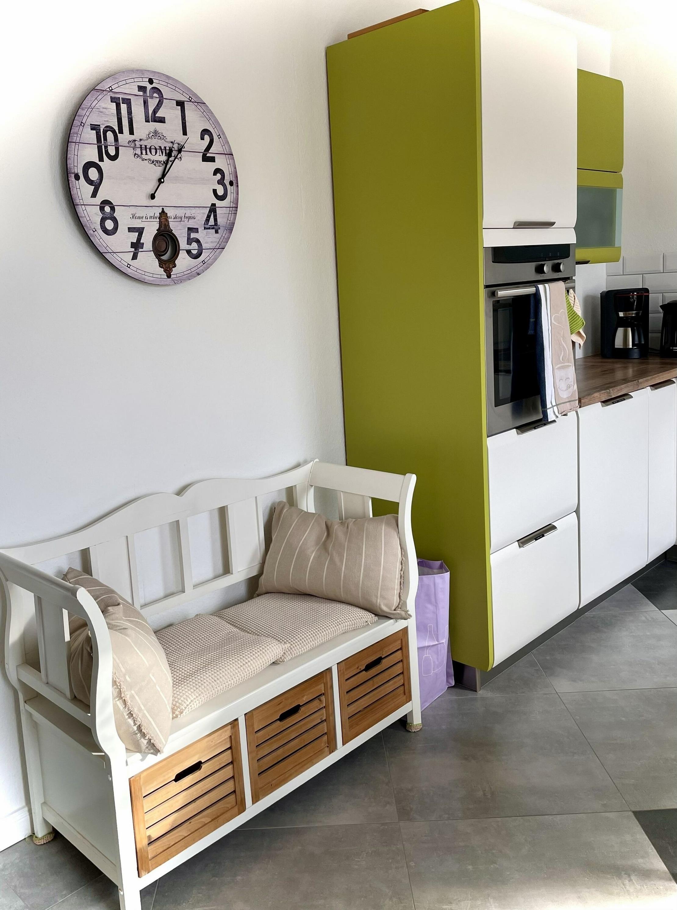 Im Erdgeschoss befindet sich eine komplett ausgestattete Küche mit gemütlicher Sitzgelegenheit für gemeinsame Mahlzeiten.