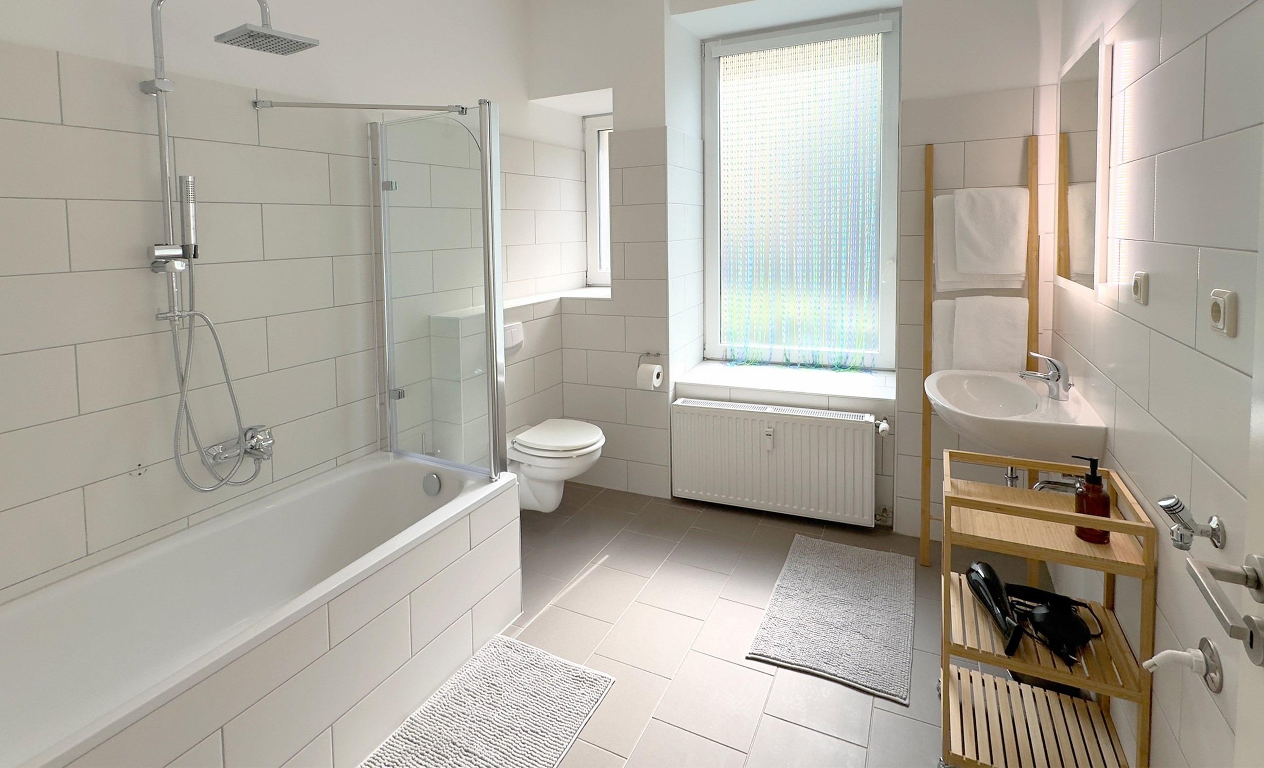 - Modernes Badezimmer mit Badewanne (mit Duschfunktion) und WC inklusive Waschmaschine mit Trocknerfunktion