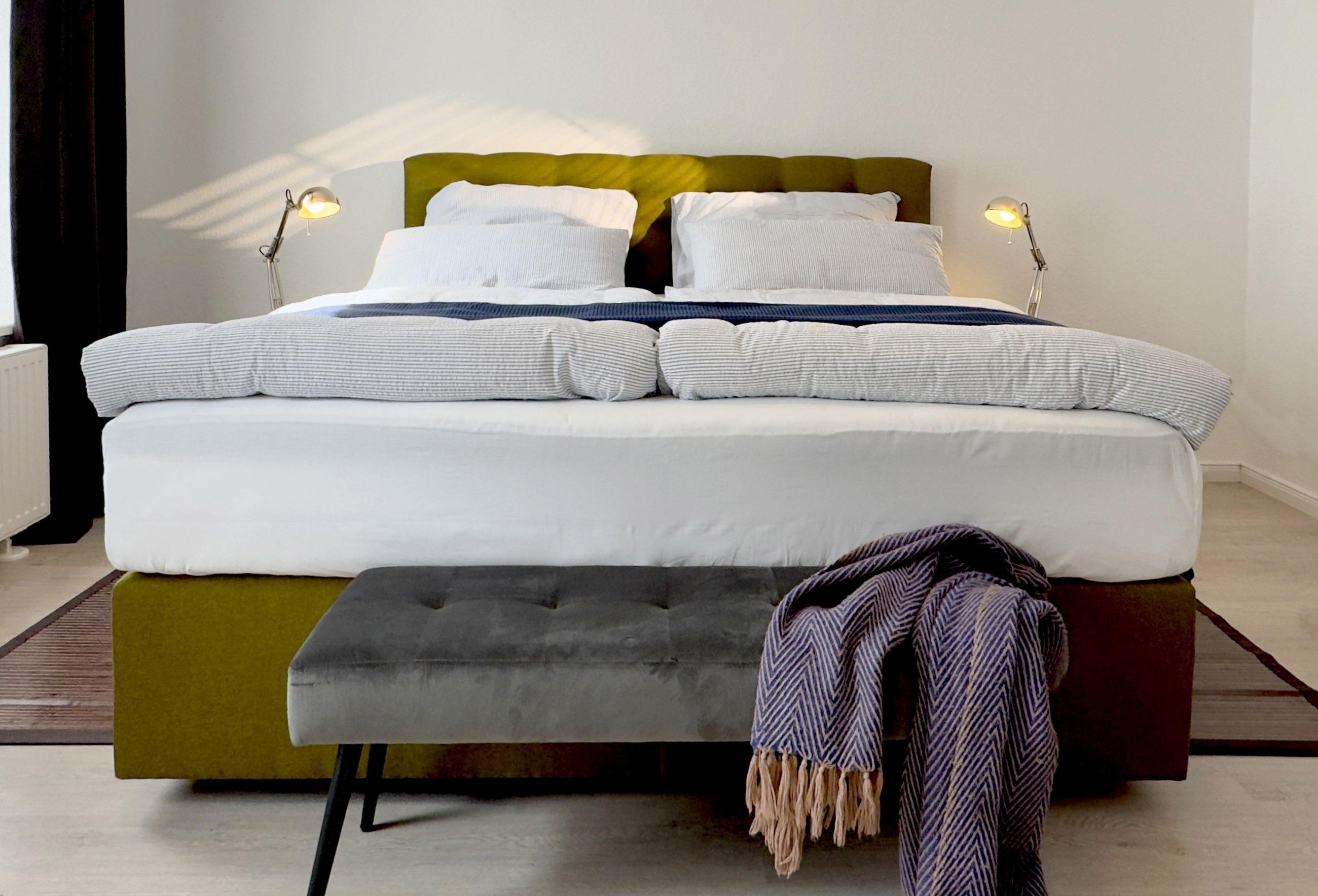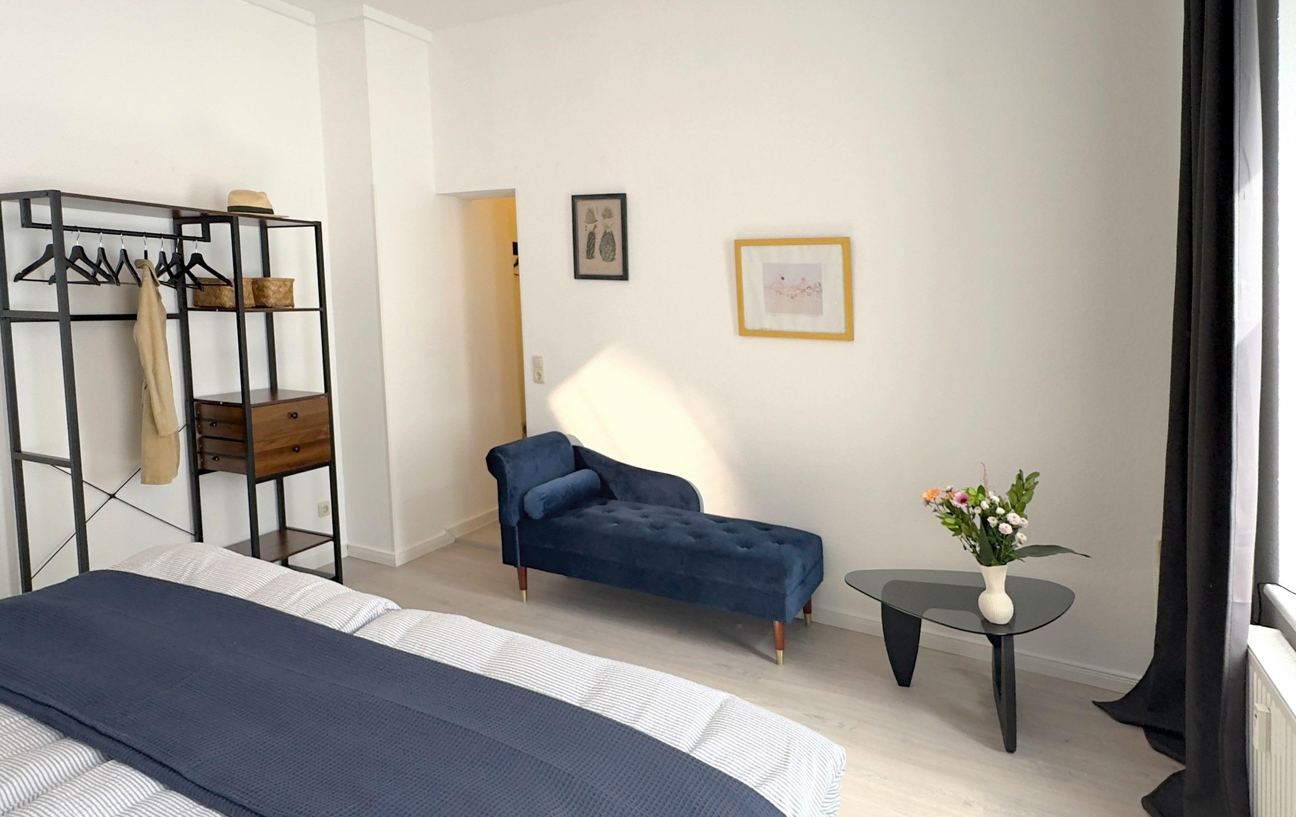 - Separates Schlafzimmer mit einem hochwertigem Kingsize-Boxspringbett (180x200), Chaiselongue und Kleiderständer