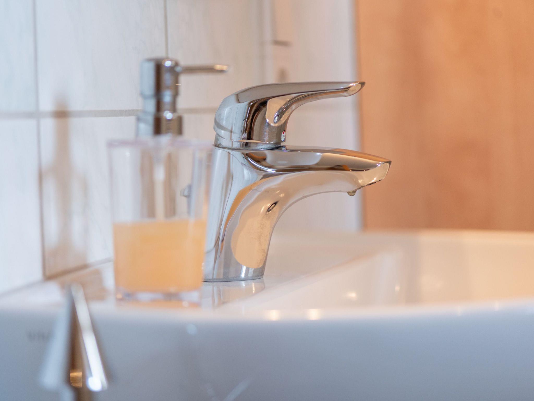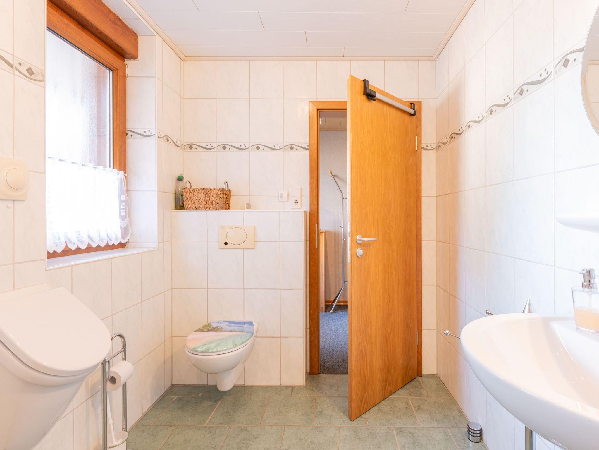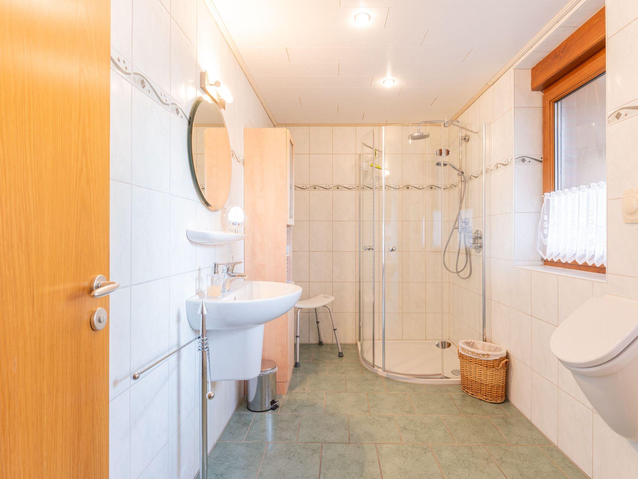 Das Badezimmer ist hell und modern. Handtuchtrockner und Fußbodenheizung sorgen für angenehme Temperaturen. Die Dusche ist 1m x 1m, das WC-Becken ist mit einer Geruchsabsaugung ausgestattet und für die männlichen Gäste ist ein Urinal vorhanden.