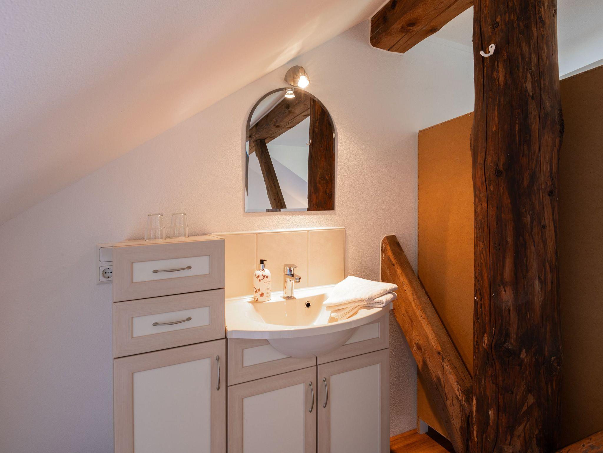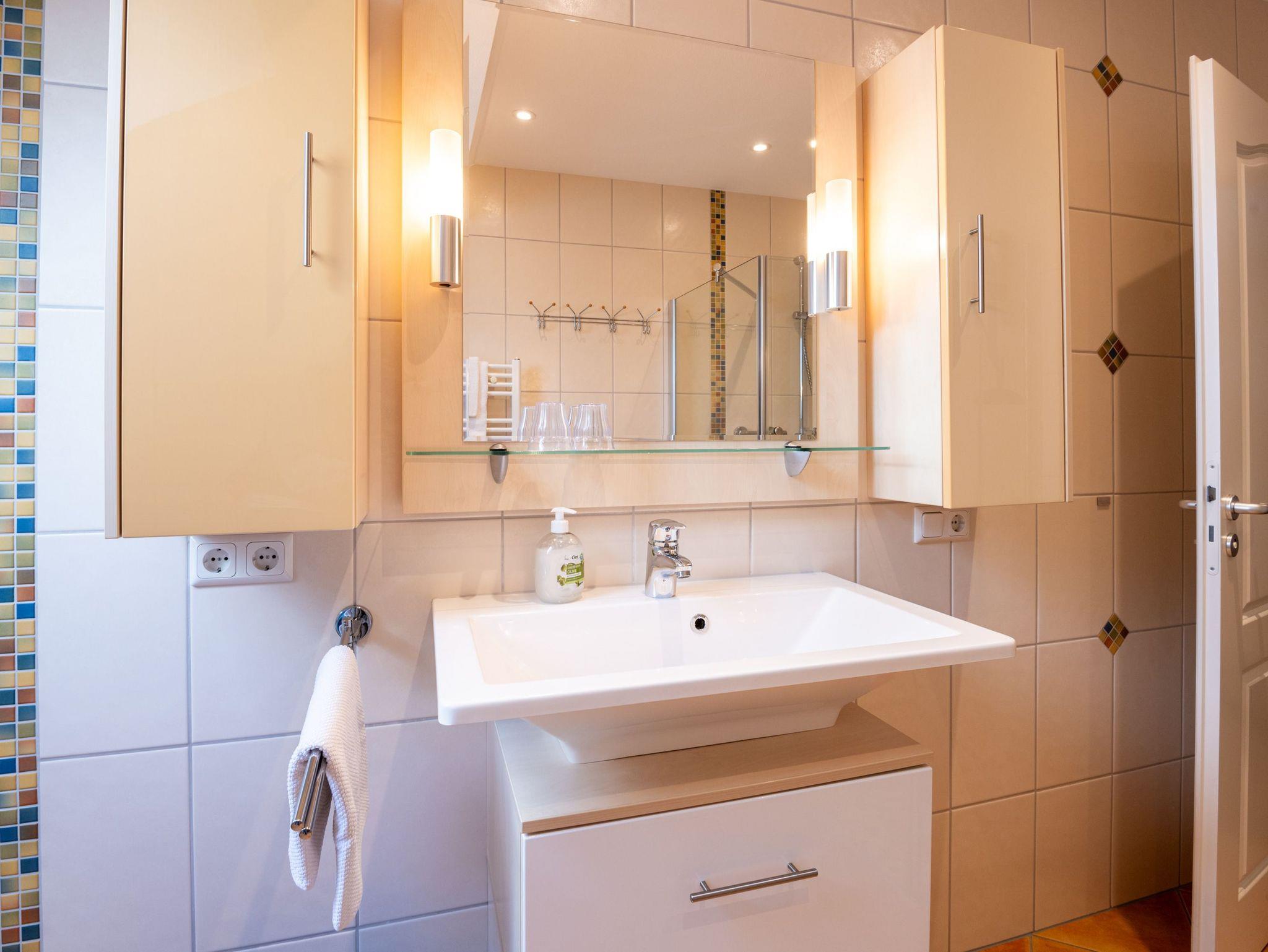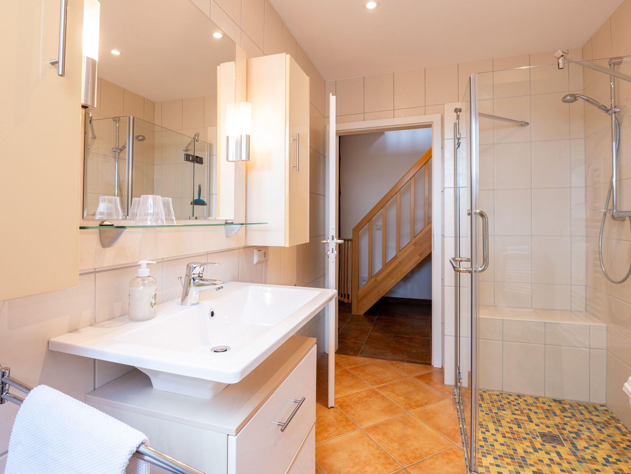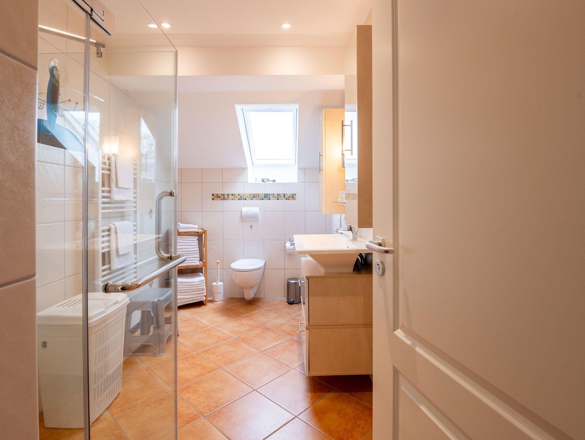 Bad: Schönes freundliches Badezimmer mit Dusche, inkl. Sitzmöglichkeit.