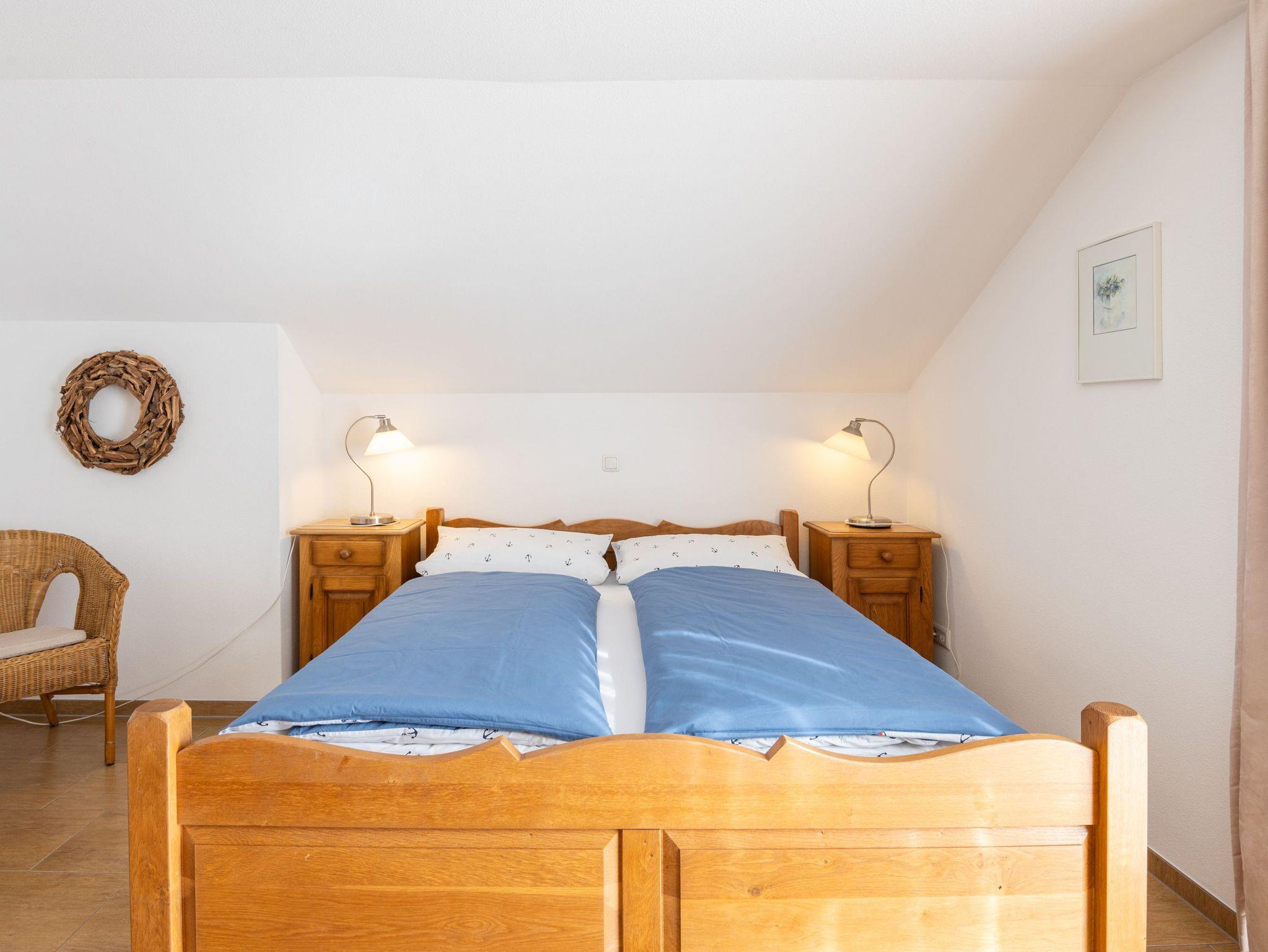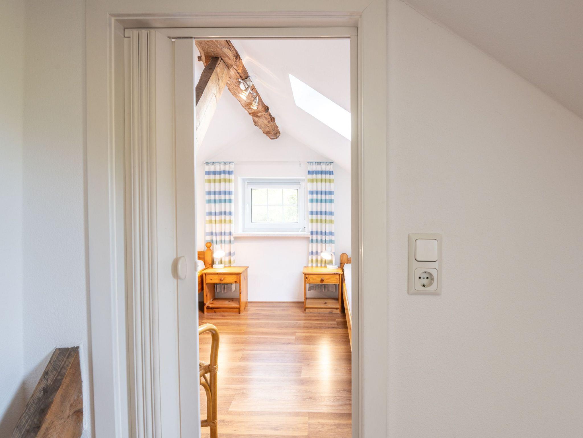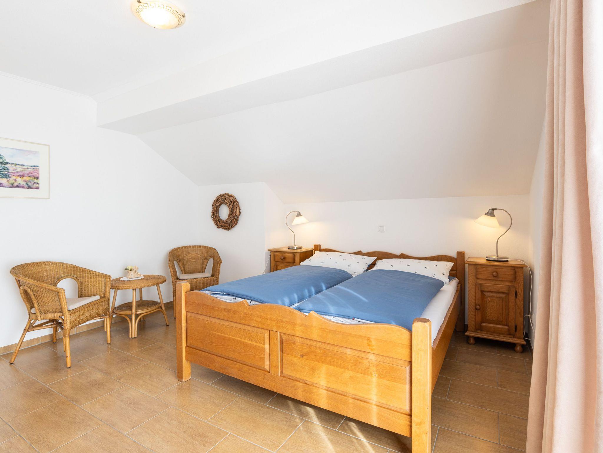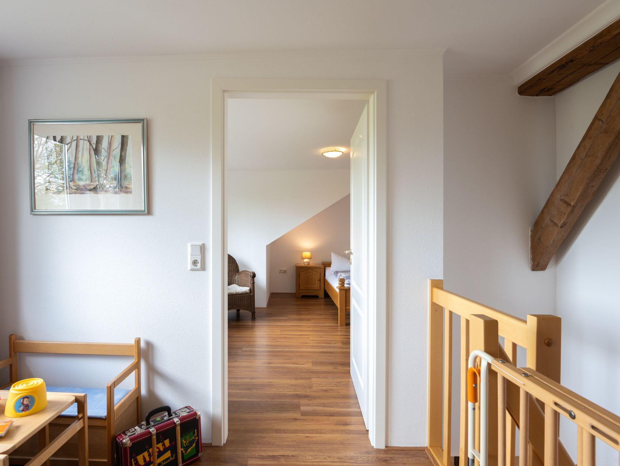 Obergeschoss: Im Obergeschoss befinden sich 1 großes Schlafzimmer mit Doppelbett und ein zusätzliches Waschbecken. Eine kleine Sitzecke lädt zum Verweilen ein. Platz für Kleidung finden Sie in einer Kommode und in einem Schrank im Flur. Das kleine Schlafzimmer, bevorzugt für Kinder, enthält zwei Einzelbetten und eine Kommode.