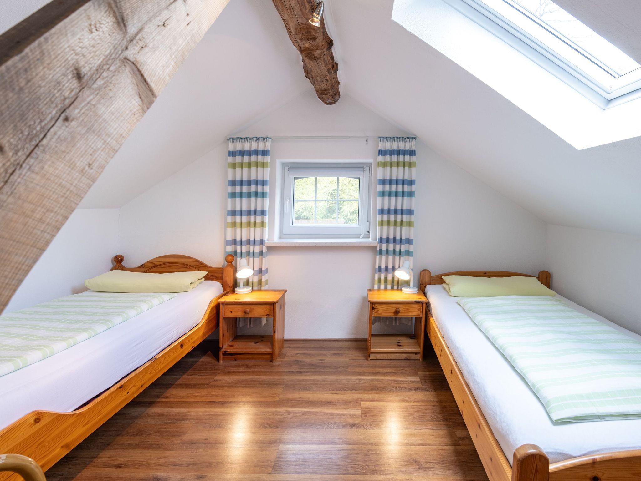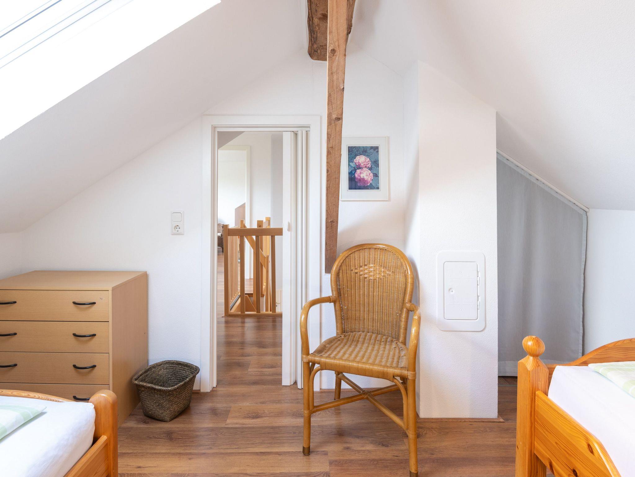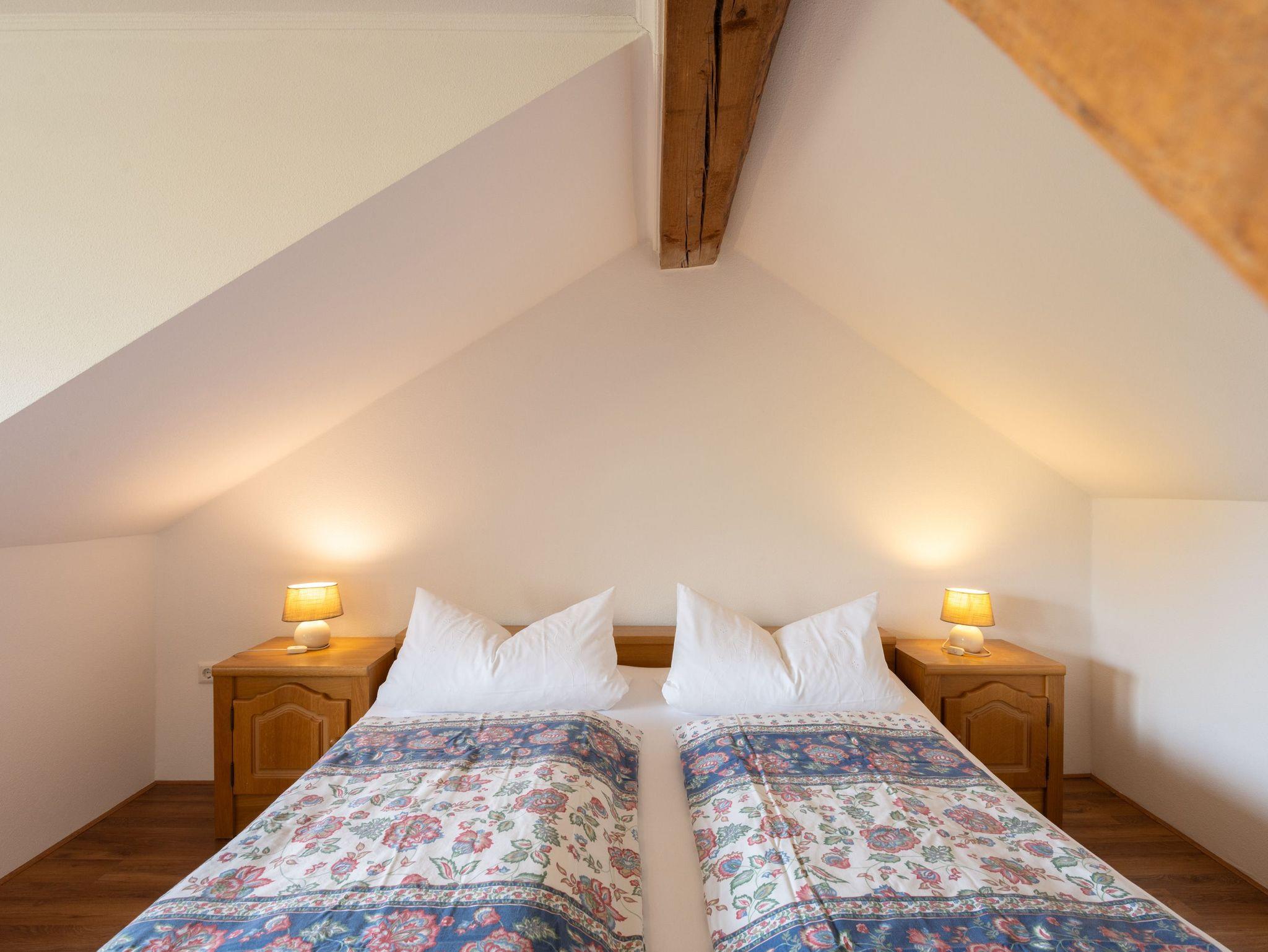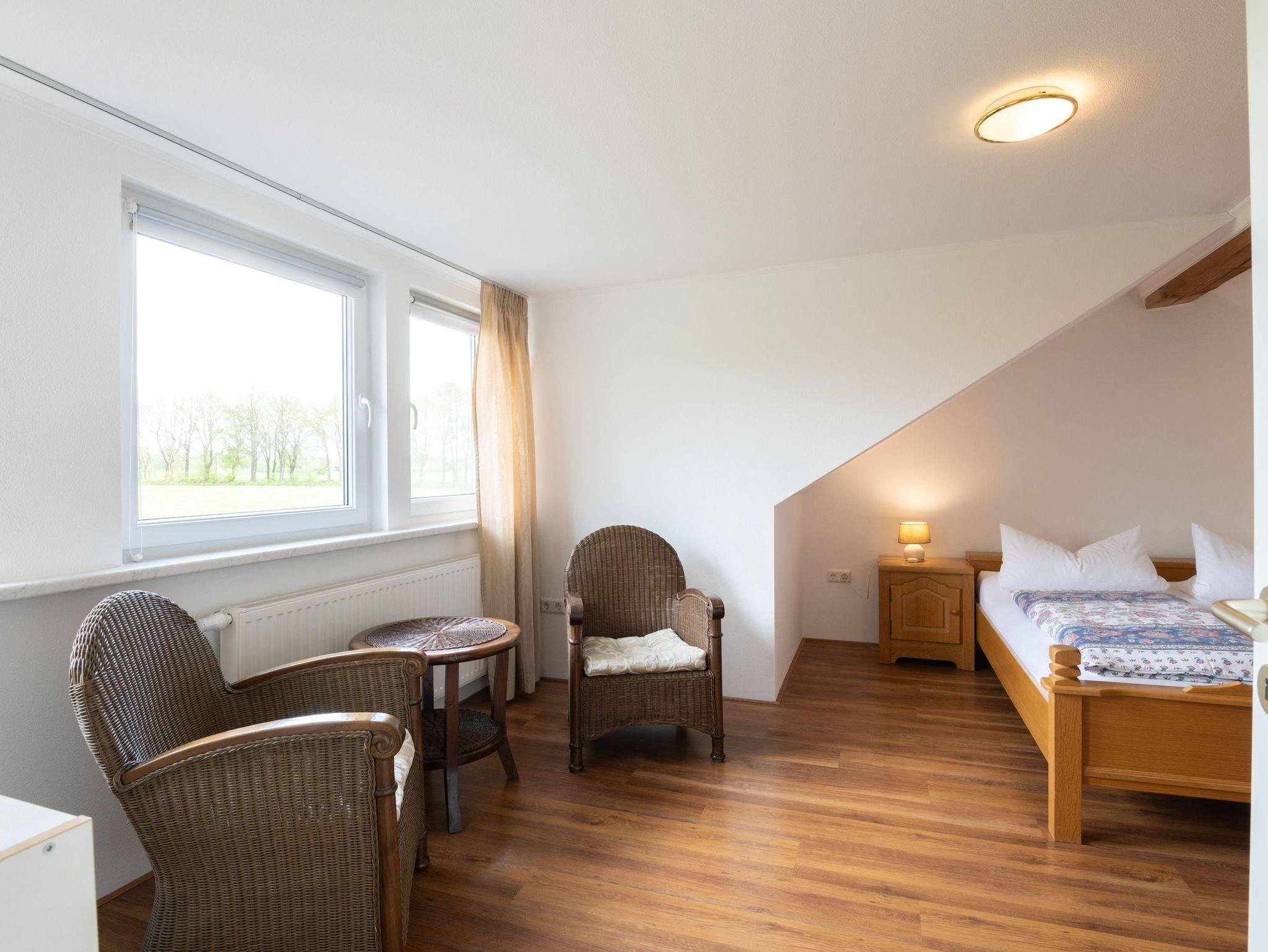 Obergeschoss: Im Obergeschoss befinden sich 1 großes Schlafzimmer mit Doppelbett und ein zusätzliches Waschbecken. Eine kleine Sitzecke lädt zum Verweilen ein. Platz für Kleidung finden Sie in einer Kommode und in einem Schrank im Flur. Das kleine Schlafzimmer, bevorzugt für Kinder, enthält zwei Einzelbetten und eine Kommode.