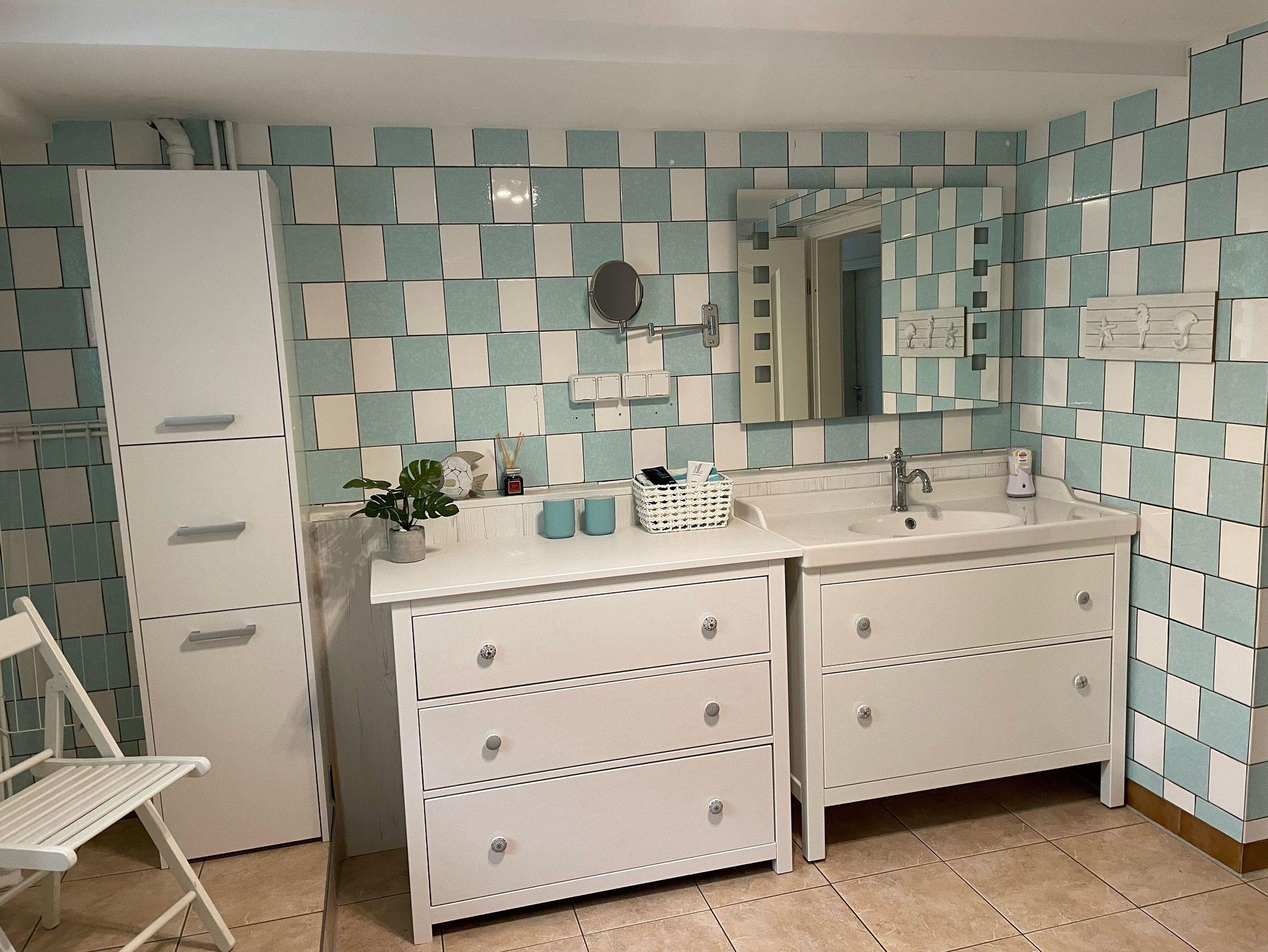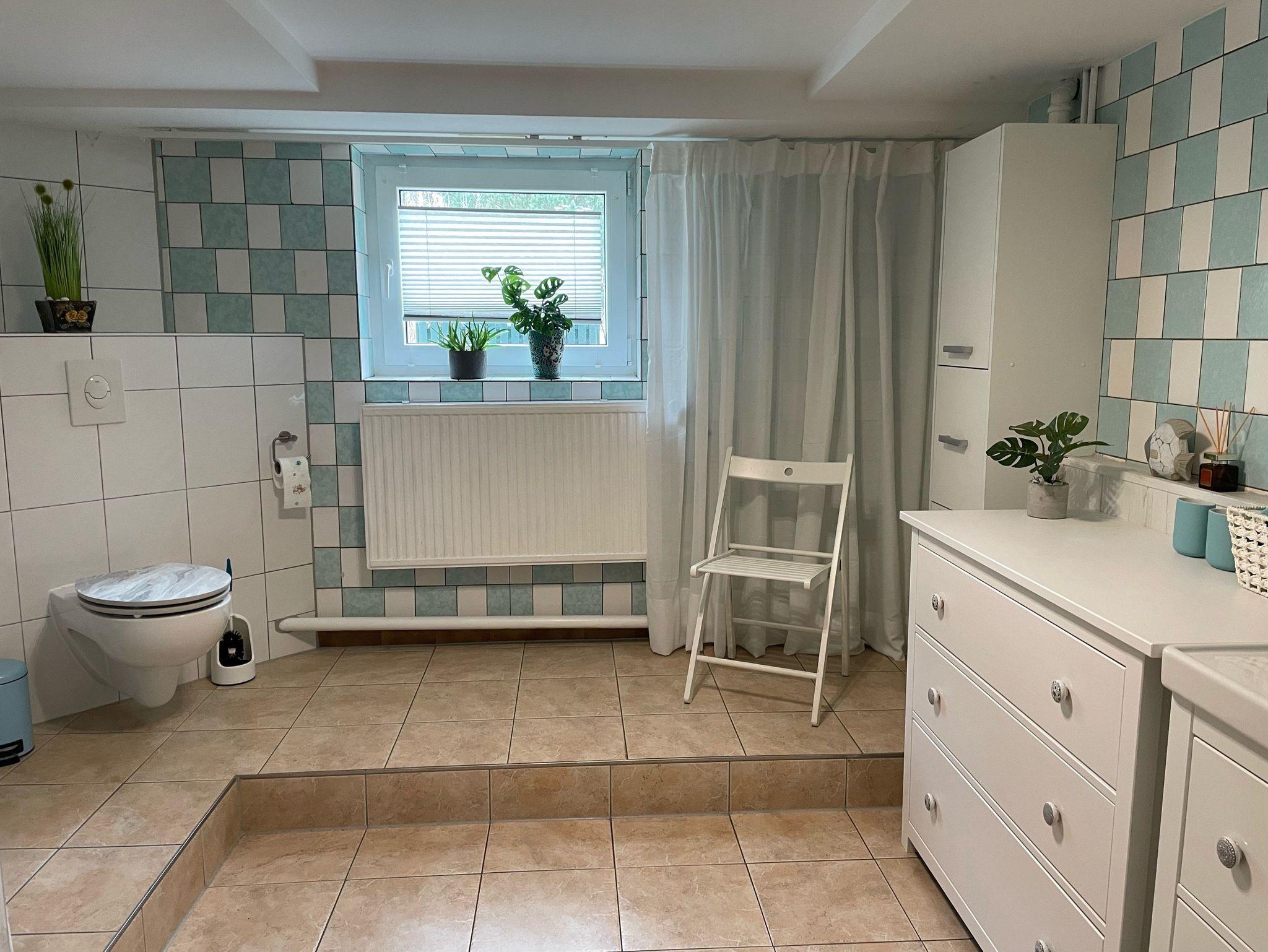 Im großen Bad befindet sich ein WC, Waschtisch, Dusche, Schrank, Stuhl und Wäschetrockner.