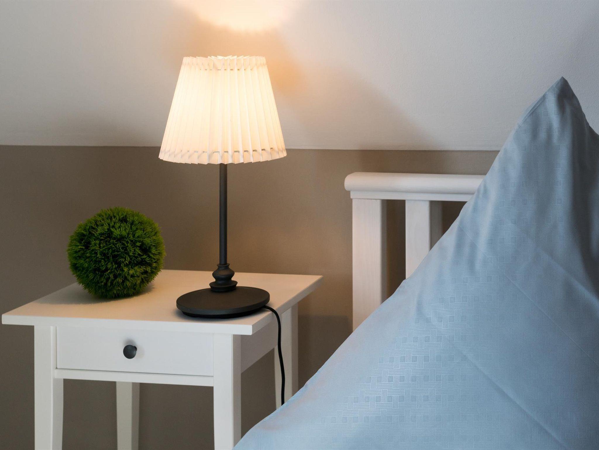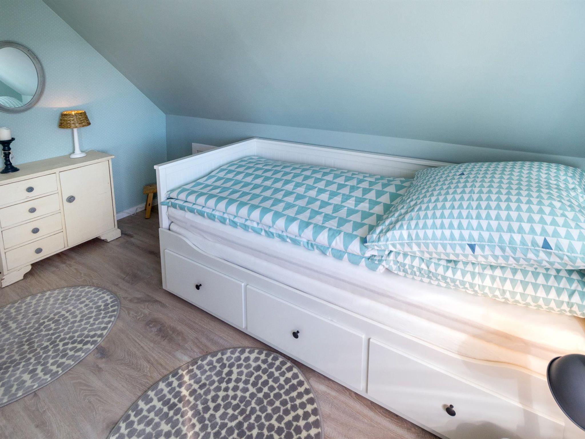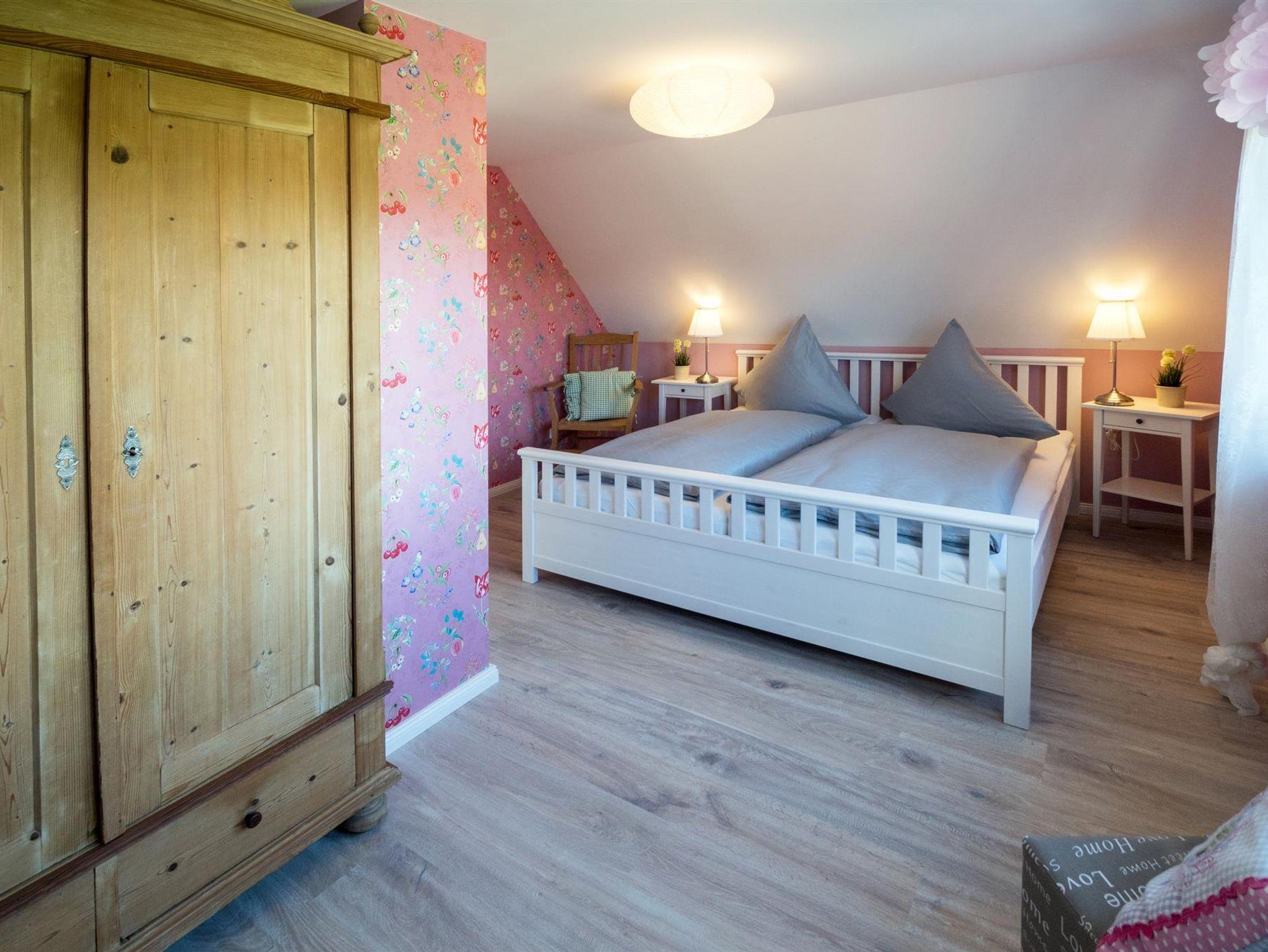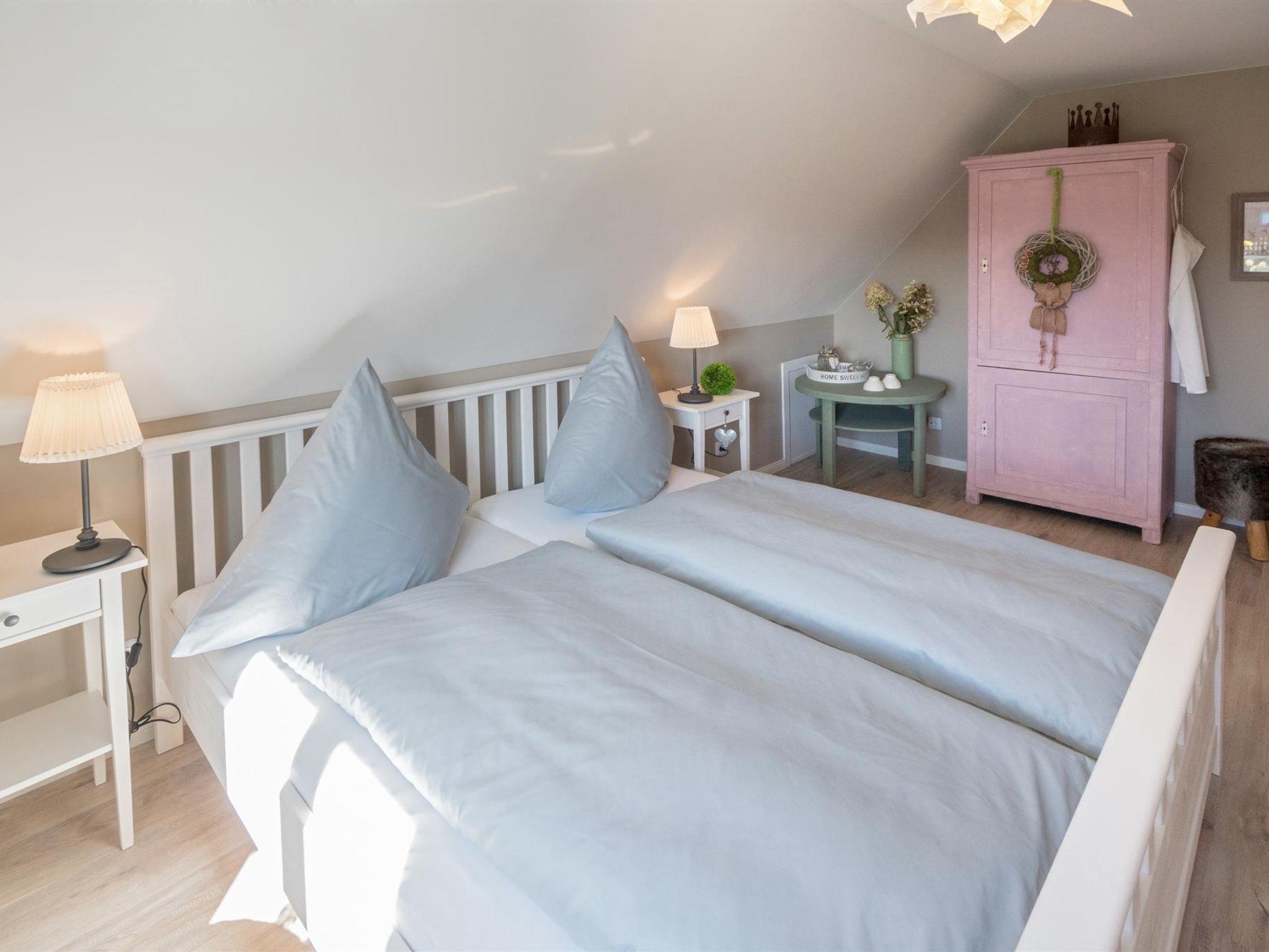 Im Obergeschoss gelangen Sie dann durch einen großen Flur, zu den drei Schlafzimmern. Zwei Zimmer sind mit jeweils einem Doppelbett ausgestattet, im dritten Schlafzimmer befindet sich ein Einzelbett. Dieses kann man bei Bedarf ausziehen und zu einem Doppelbett umfunktionieren. Alle Zimmer sind mit einem Kleiderschrank ausgestattet. Außerdem befindet sich auf der 1. Etage ein Gäste- WC.