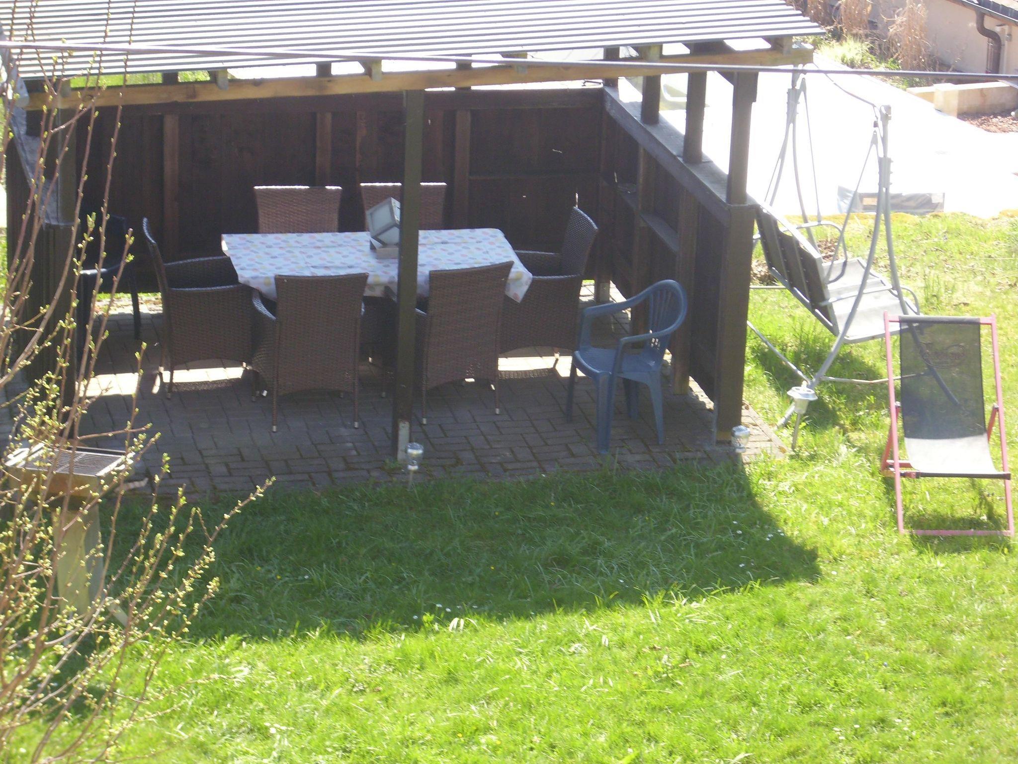 Im Garten steht eine überdachte Terrasse mit Gartenmöbeln zur Verfügung.
