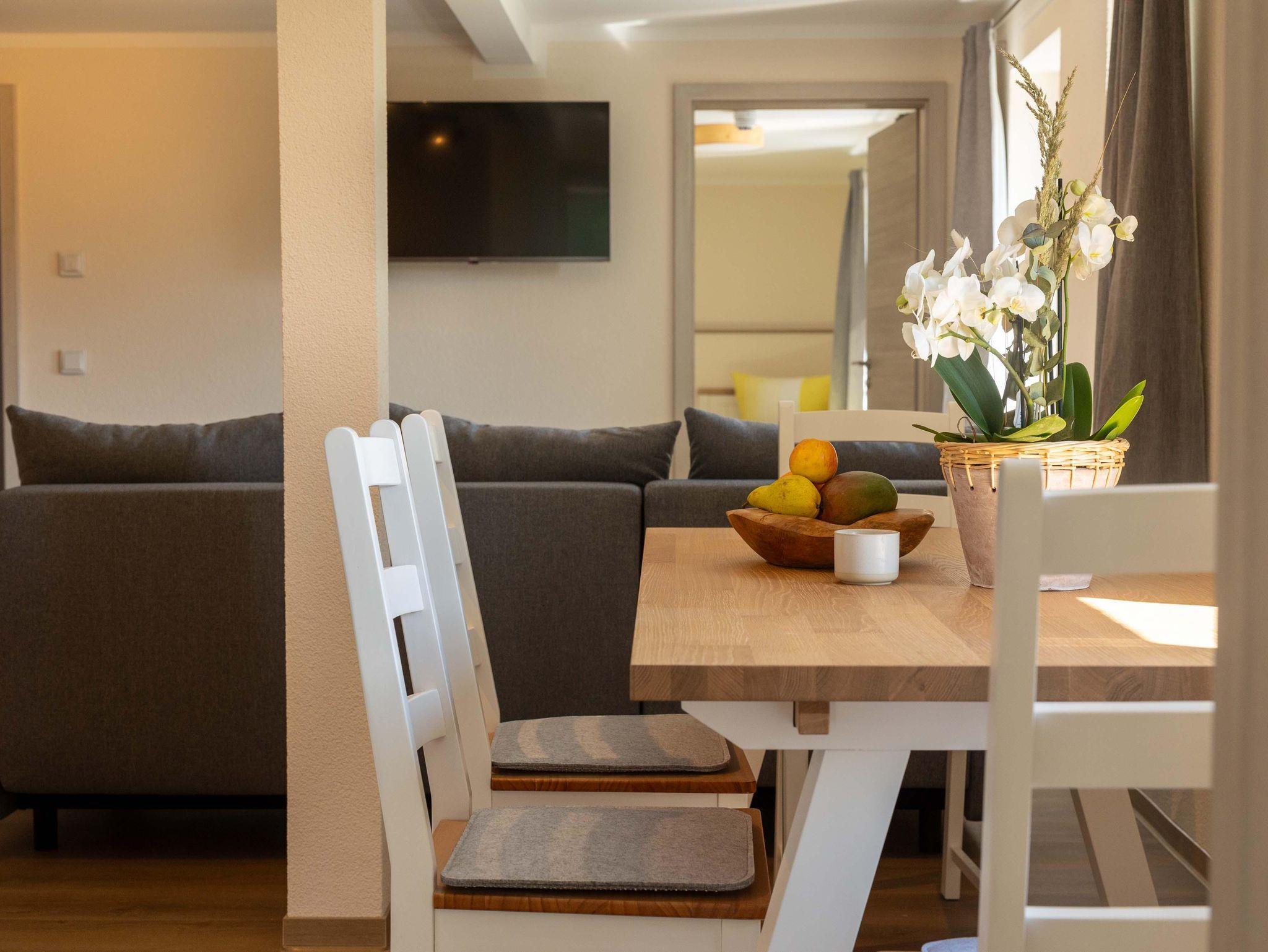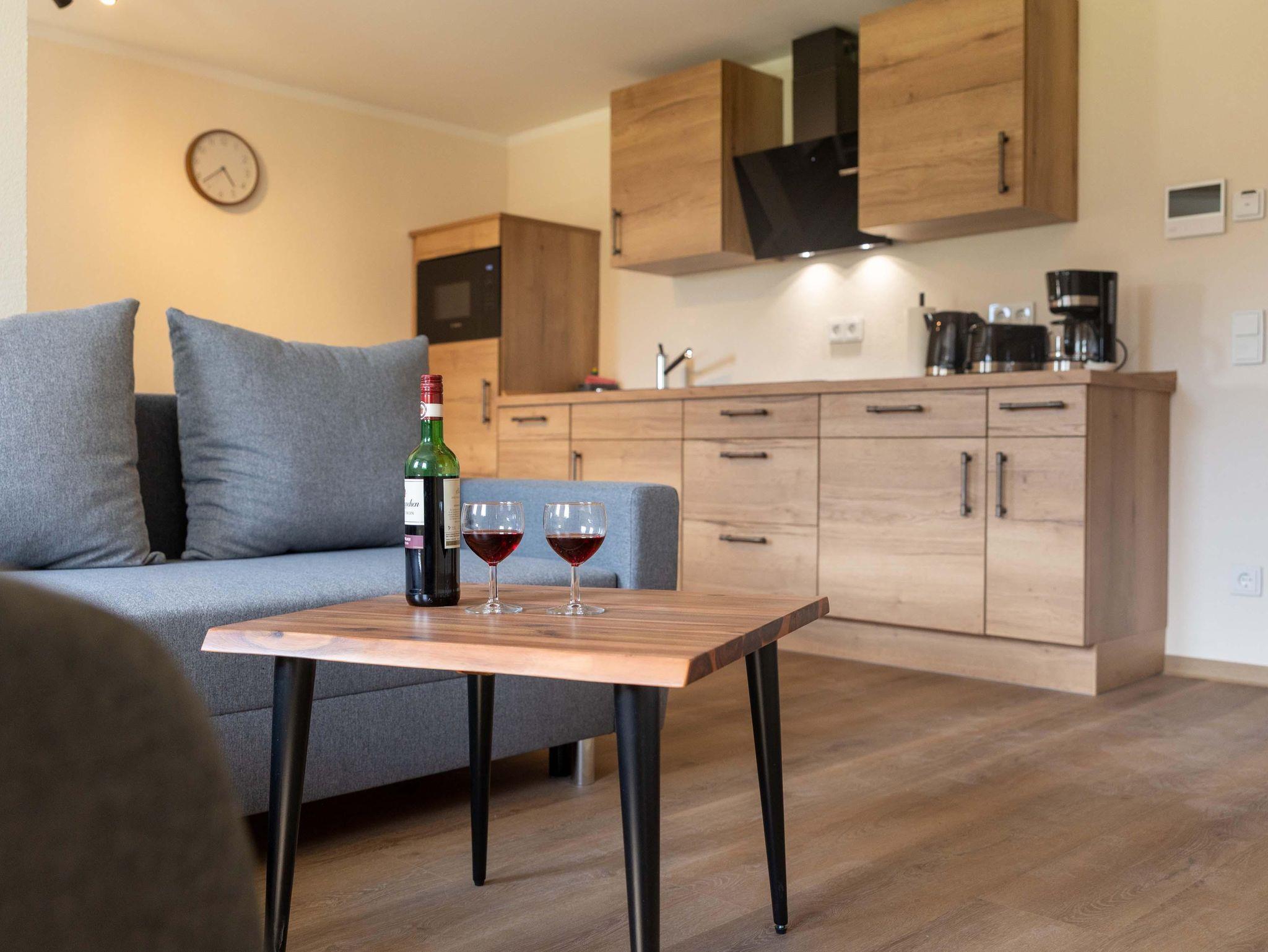 Diese gemütliche Ferienwohnung bietet Platz für bis zu 4 Personen und ist ideal für Familien oder Freunde. Im Zentrum steht die voll ausgestattete Wohnküche mit einem Geschirrspüler, 4-Zellen-Herd, Mikrowelle, Kaffeemaschine, Kühlschrank (ohne Gefrierzelle), Wasserkocher und Toaster. Alles, was Sie für die Zubereitung köstlicher Mahlzeiten benötigen, ist vorhanden. Der Esstisch mit vier Stühlen lädt zu gemeinsamen Essen ein, während das Sofa, der Couchtisch und das TV-Gerät im selben Raum für entspannte Abende sorgen.