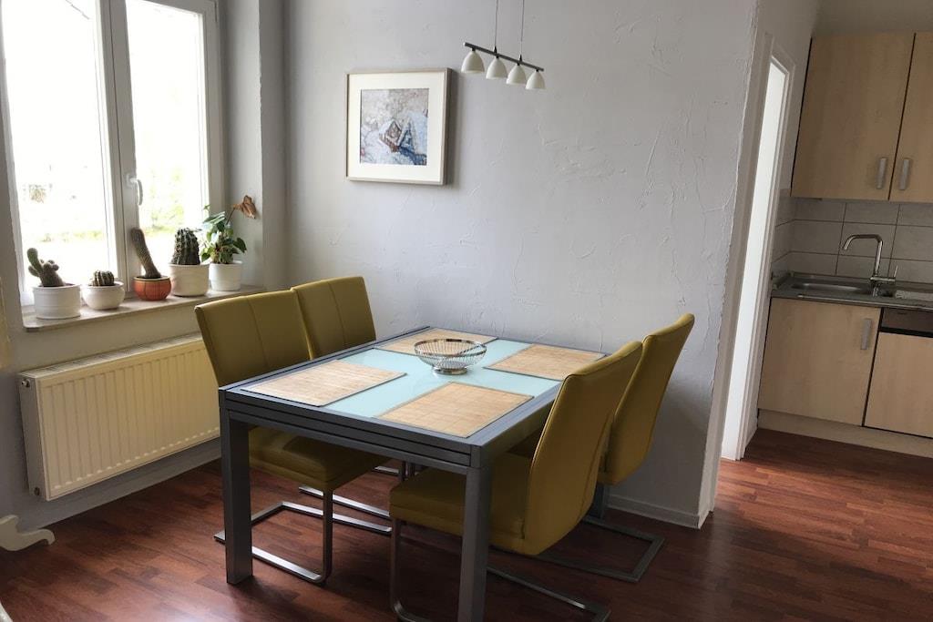 Ihre strandnahe Ferienwohnung befindet sich in einer 2008 sanierten Villa im Stil der Bäderarchitektur im Herzen des Seebades Ahlbeck. Die Komplettausstattung der Ferienwohnung lässt keine Wünsche offen. Sie ist modern eingerichtet. Für lange Winterabende ist ein Kaminofen integriert. Ein eigener Parkplatz, eine eigene Terrasse, ein Strandkorb für 8 Euro pro Tag und Fahrräder für je 6 Euro pro Tag vervollständigen das Angebot. Die Ferienwohnung ist für 4 Personen eingerichtet, befindet sich im Erdgeschoss und ist 52 m² groß. Sie besteht aus einem Wohnzimmer mit ausziehbarer Couch , Kamin, einer abgeteilten Veranda mit Doppelbett,einem abgeteilten Küchenbereich mit Einbauküche, Geschirrspüler, E-Herd mit Backofen, Kühlschrank, Kaffeemaschine, Toaster und Wasserkocher. Ein Essbereich und ein separates Bad mit Dusche und WC runden die Ausstattung ab.