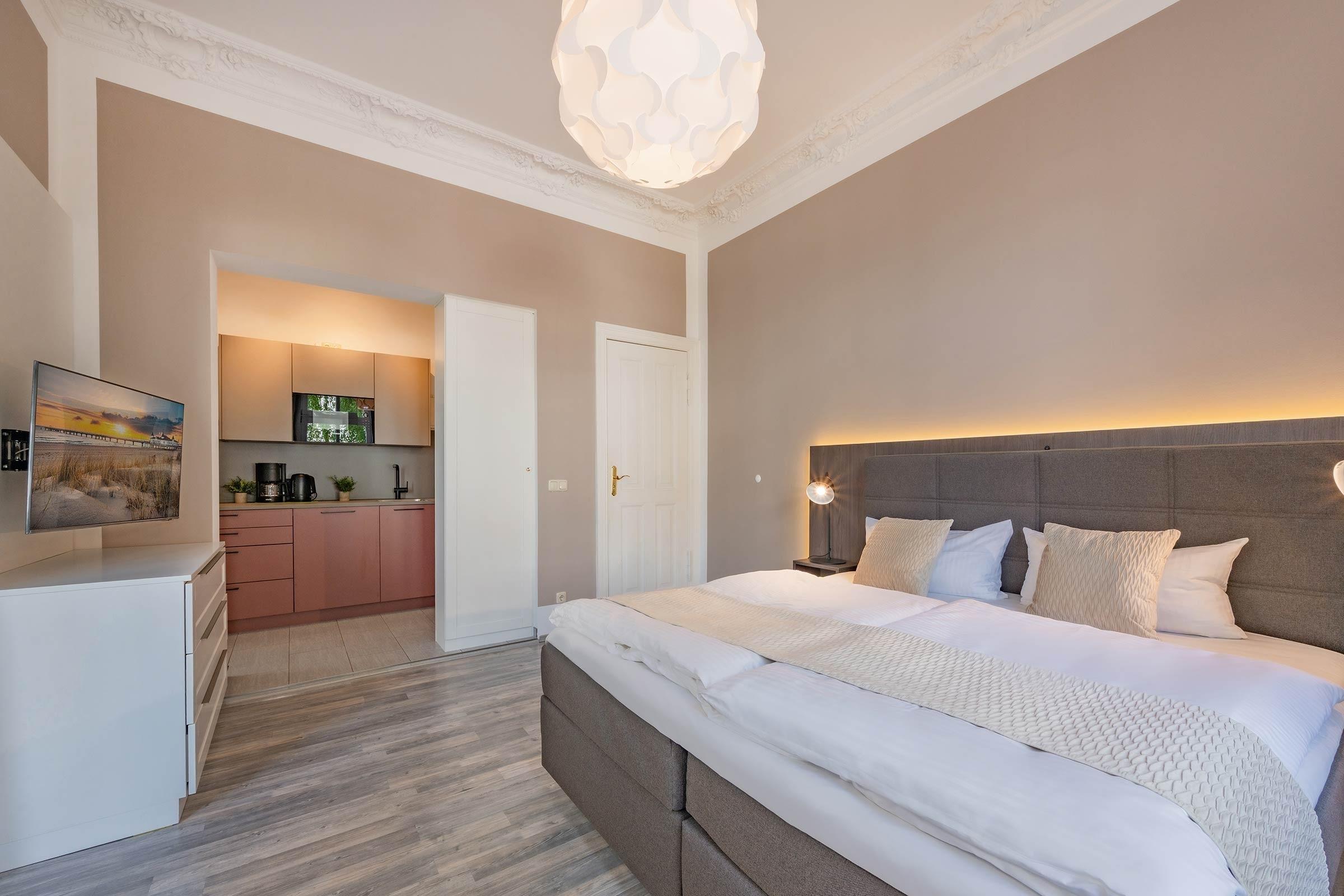 Das Bernstein, ein Juwel unter den Apartments der Villa Carmen in Seebad Ahlbeck, heißt Sie mit offenen Armen willkommen. Auf 38 m² kombiniert dieses exquisite Refugium zeitgemäßen Komfort mit einer gemütlichen Atmosphäre, die Sie vom ersten Moment an verzaubern wird. Die ausgewählten Möbel und liebevollen Details schaffen ein Ambiente, das zum Verweilen einlädt. Mit einem bequemen Doppelbett, ausgestattet für erholsame Nächte und positiv bewertet von zahlreichen zufriedenen Gästen, steht Ihrem erholsamen Schlaf nichts im Weg. Die Tatsache, dass Haustiere ebenfalls willkommen sind, macht das Bernstein zur perfekten Wahl für jeden Gast.
