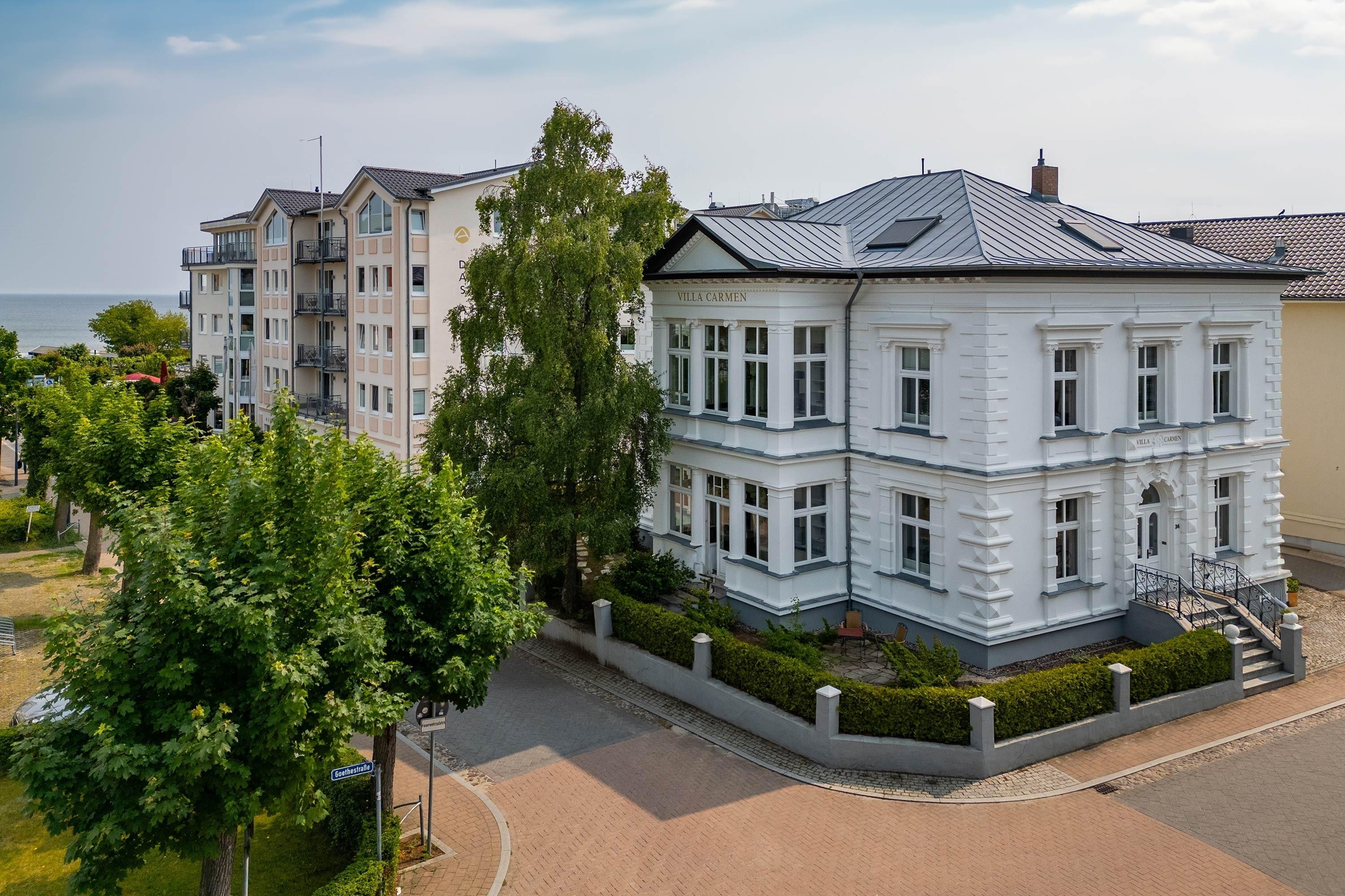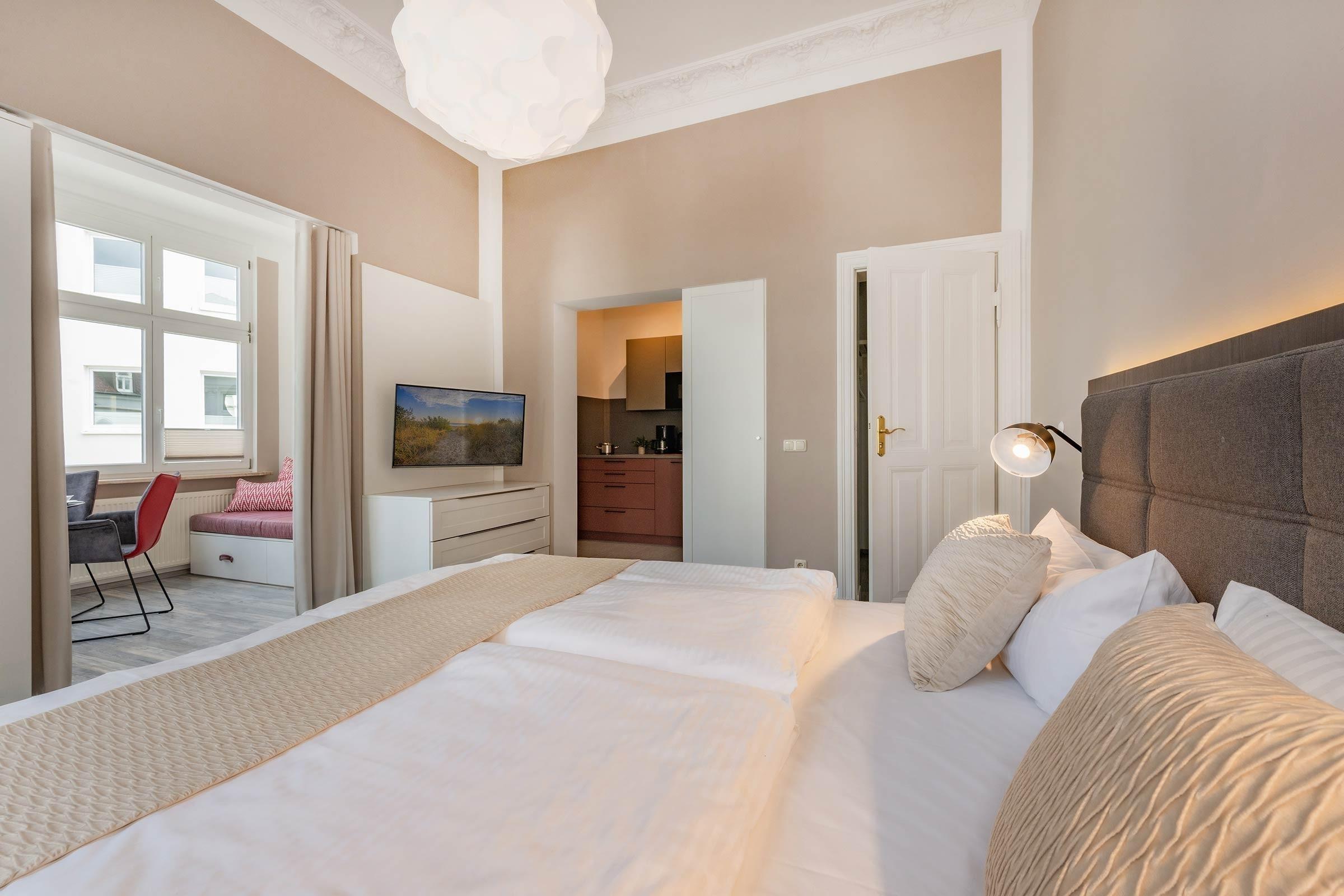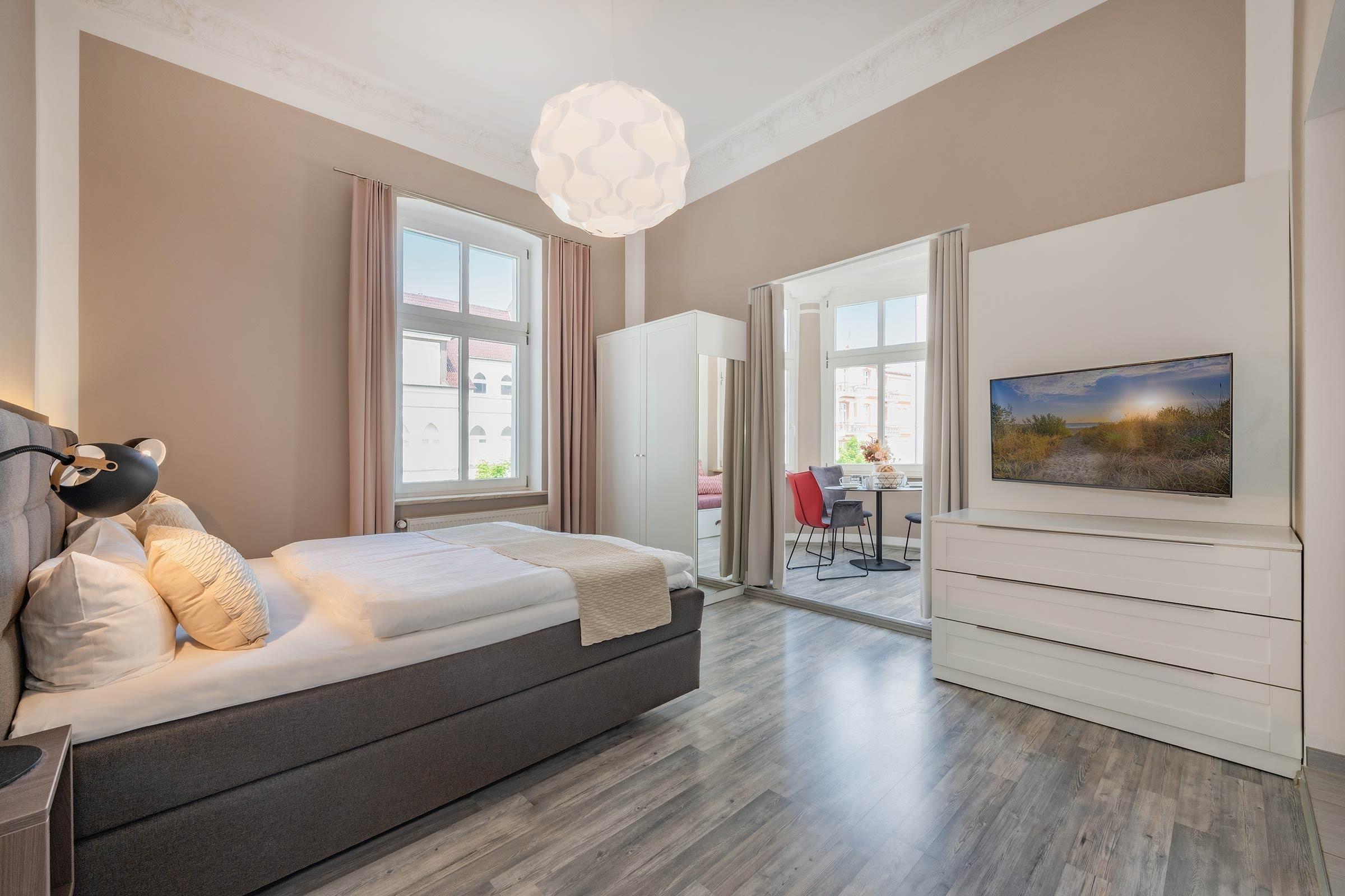 Das Apartment "Strandkorb" in der Villa Carmen in Seebad Ahlbeck ist eine Einladung, das Strandleben mit einem Hauch von Luxus zu erleben. Dieses 38 m² große Refugium, das in den oberen Etagen liegt und über eine Treppe erreichbar ist, bietet einen idyllischen Rückzugsort, der Stil, Komfort und Privatsphäre vereint. Es ist ein Nichtraucherapartment und haustierfrei, was ein klares und allergenarmes Ambiente gewährleistet.