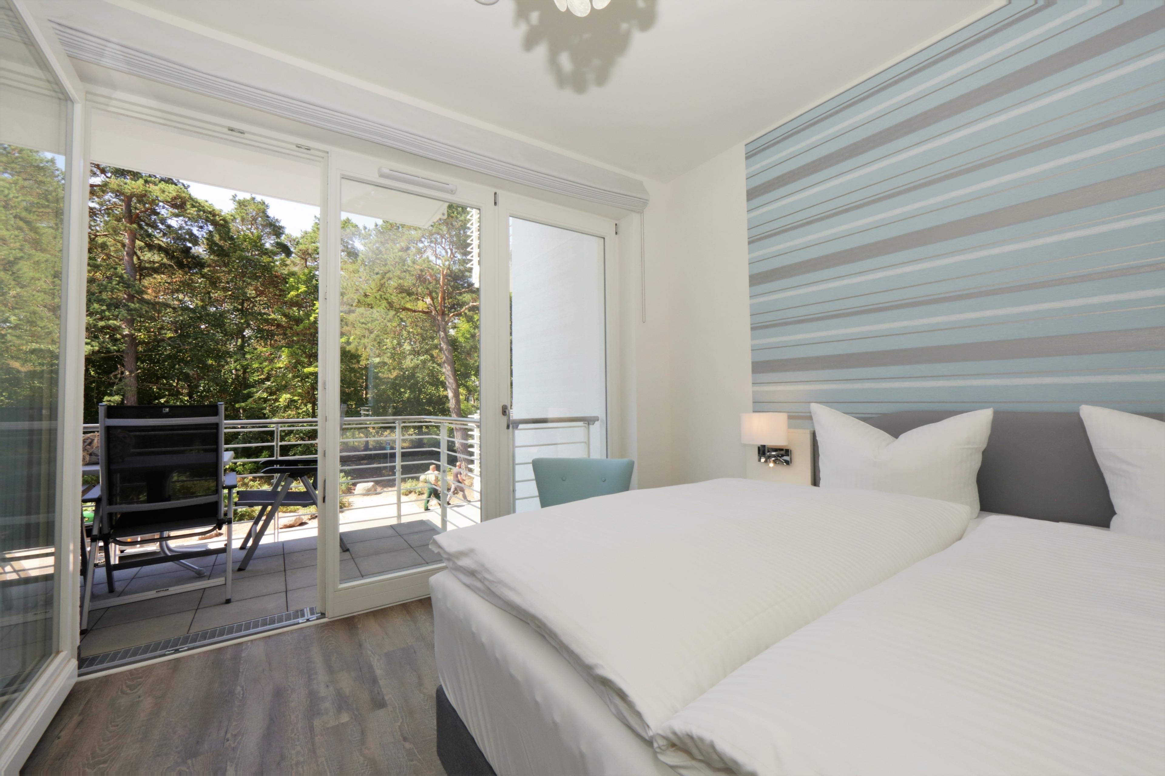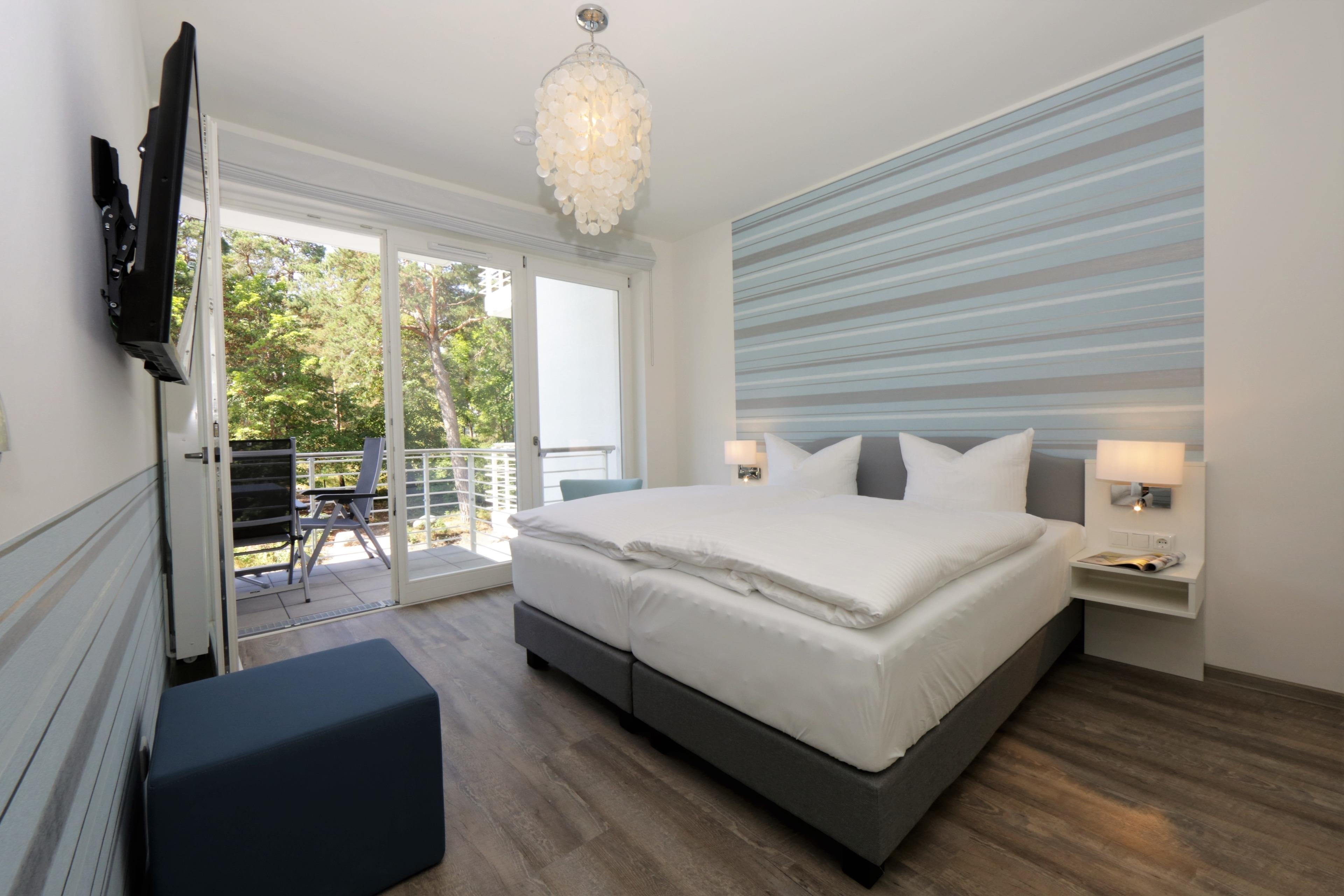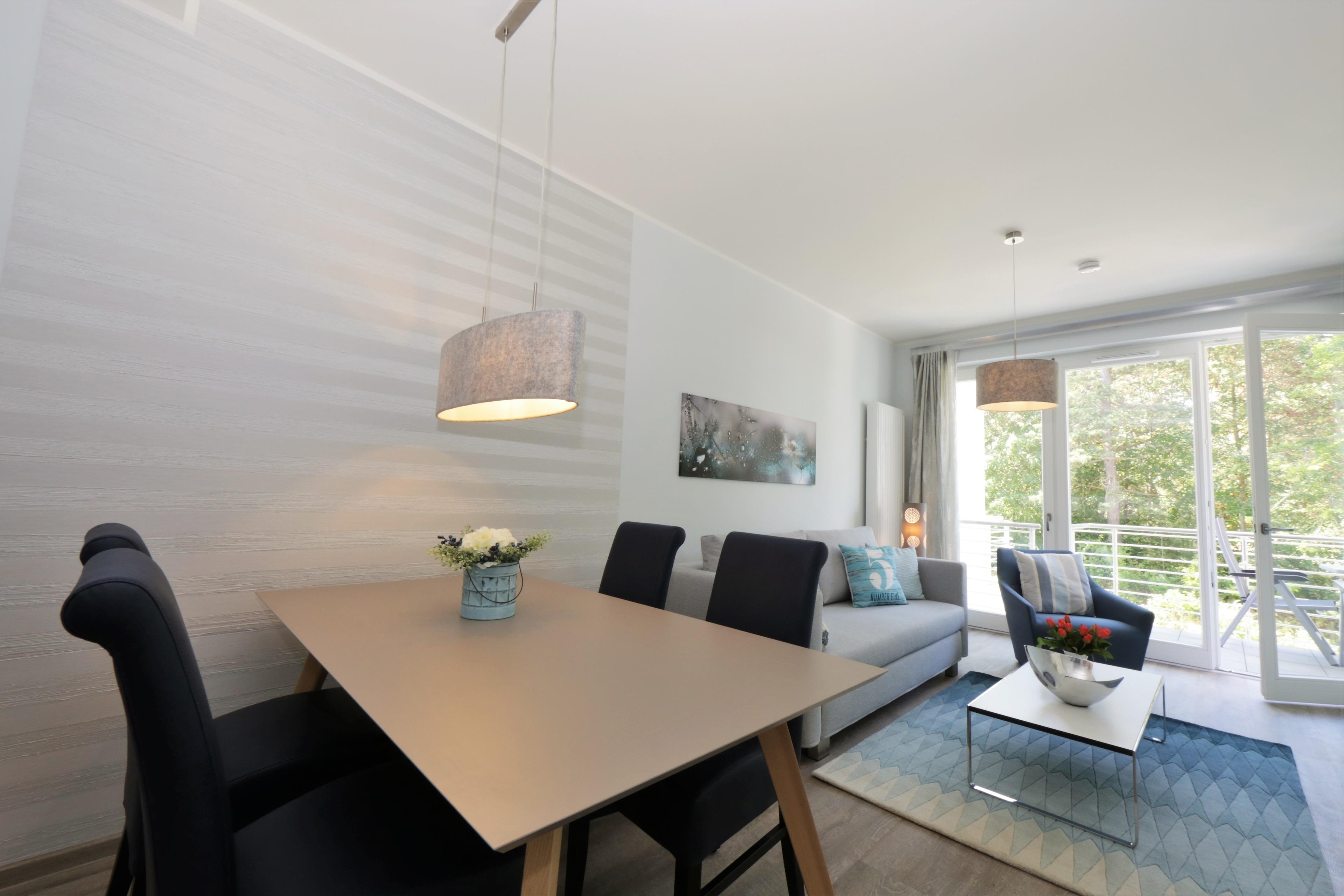 Die moderne, liebevoll eingerichtete Ferienwohnung mit 55 m² Wohnfläche befindet sich im 1. Obergeschoss der Strandresidenz. Die sonnige südliche Ausrichtung der Wohnung garantiert viele Sonnenstunden. Ein großer überdachter Balkon lockt die Gäste schon zum Frühstück ins Freie. Die Wohnung ist individuell und komfortabel ausgestattet und bietet 2 Personen und einem Kind Platz für einen erholsamen Urlaub am Meer. Der offene Wohnraum bietet Ihnen eine gemütliche Sitzecke mit Flat TV. Das Sofa (Liegefläche 180 x 135) bietet einer kleineren 3. Person den Schlafplatz. Die Küchenzeile incl. Backofen, Ceranfeld, Kühlschrank, Geschirrspüler etc. sowie der Essplatz sind ebenfalls offen im Wohnraum integriert. Im geräumigen Schlafzimmer sorgt ein Boxspringbett mit getrennten Matratzen (90 x 200) für erholsamen Schlaf und ein großer Kleiderschrank für viel Stauraum. Der Balkon lässt sich sowohl vom Wohn- als auch vom Schlafzimmer betreten. Das großzügige, moderne Bad ist mit einer ebenerdigen Dusche und Waschtisch/WC ausgestattet.