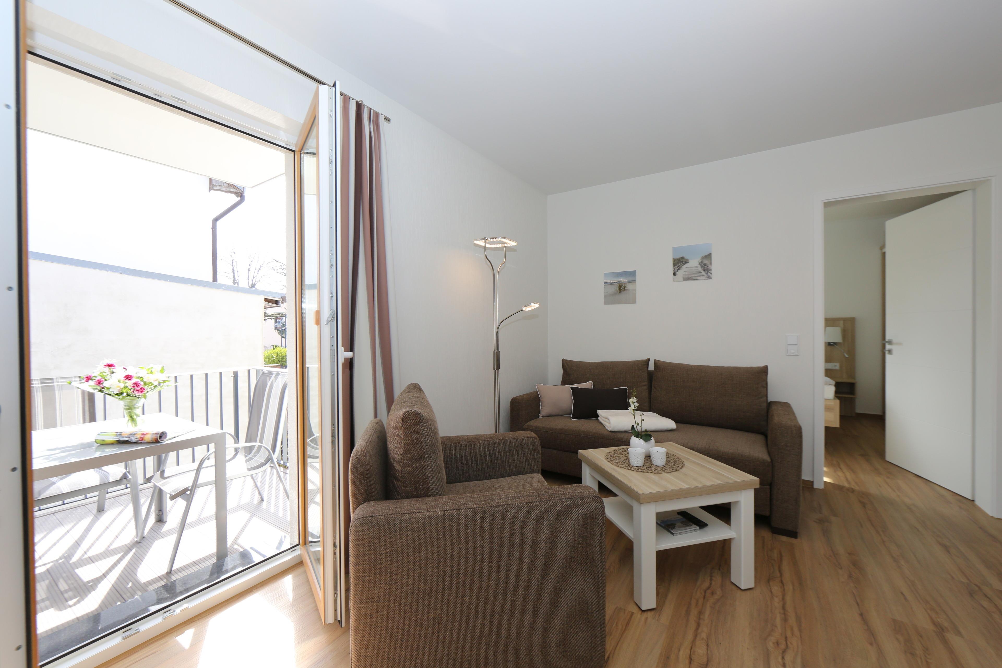 Dieses Appartement befindet sich in der 1. Etage der im Jahr 2016 erbauten Ahlbeck Suiten und ist für 2 bis 3 Personen geeignet. Das modern und hell eingerichtete 2-Zimmer Appartement ist 53 qm groß und verfügt über einen Balkon, wo Sie bereits morgens die Sonne genießen können. Im lichtdurchfluteten Wohnraum befinden sich eine gemütliche Sitzecke mit Sessel und einer zum Relaxen einladenden Couch mit Schlaffunktion sowie ein Couchtisch. Außerdem vorhanden ist ein Esstisch, der Platz für 4 Personen bietet. Fernseher und Stereoanlage sind selbstverständlich vorhanden. Ebenso im Wohnraum integriert ist eine moderne Küchenzeile, die mit Induktionskochfeld, Kombi-Mikrowelle, Kühlschrank und Geschirrspülmaschine ausgestattet ist. Das Schlafzimmer ist mit einem komfortablen Doppelbett und einem Kleiderschrank mit ausreichend Stauraum eingerichtet. Im Badezimmer finden Sie eine ebenerdige Dusche, einen schönen Waschtisch mit ausreichend Aufbewahrungsmöglichkeiten und großem Spiegel sowie ein WC vor. Für angenehme Wärme sorgt eine Fußbodenheizung in der kompletten Wohnung.