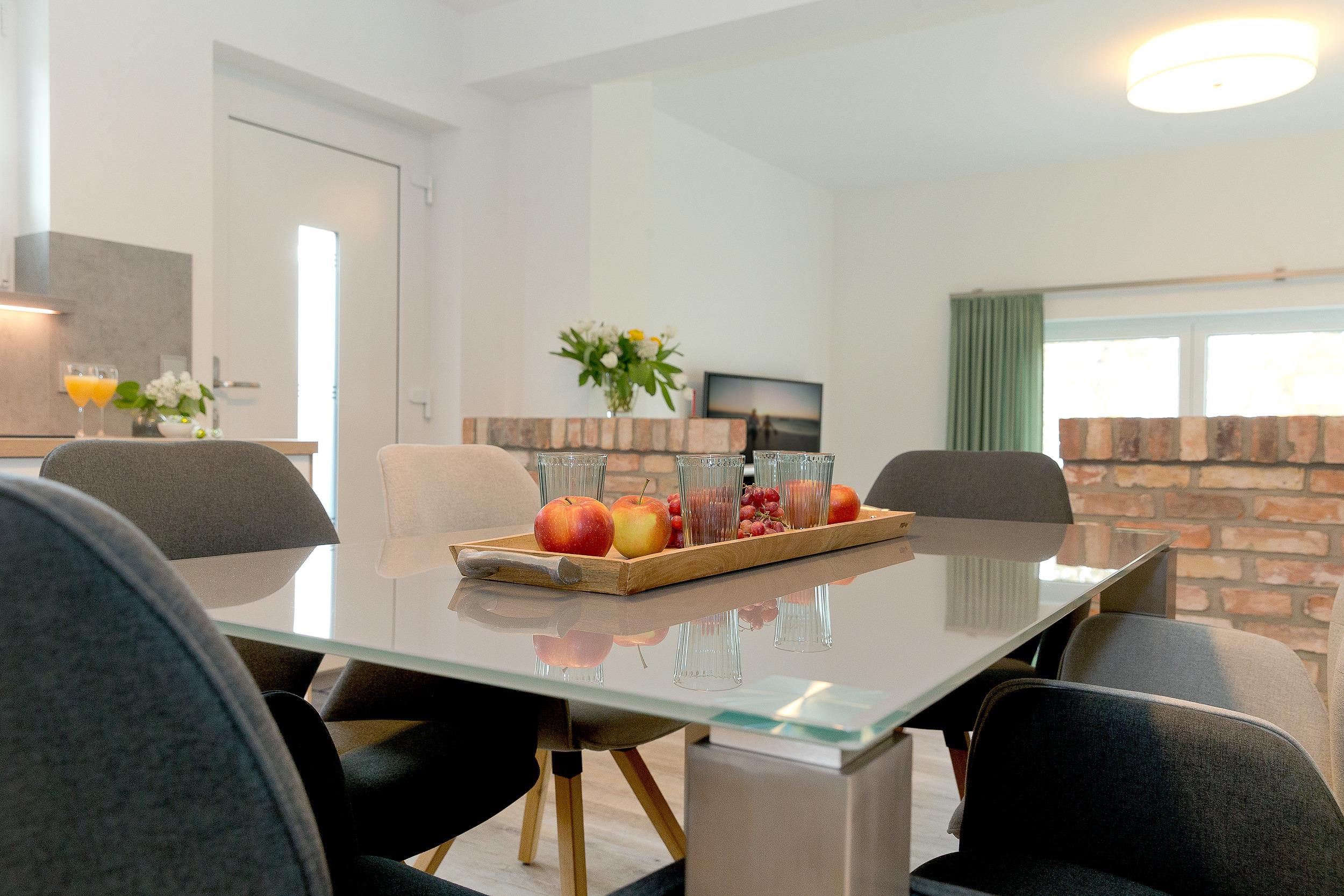 Diese moderne hochwertige 4-Zimmer Haushälfte erstreckt sich mit ihren 98 qm und ihren 4 Zimmern über zwei Ebenen. Alle Räume sind geschmackvoll und mit viel Liebe zum Detail gestaltet. Maximal 6 Personen können hier mit viel Komfort erholsame Ferien verleben. Im Erdgeschoss lädt die Wohnküche zum Kochen und zu gemeinsamen Mahlzeiten ein. Die moderne Küche ist mit Geschirrspüler, Cerankochfeld, Backofen, Kühlschrank etc. ausgestattet. Am angrenzenden bequemen Essplatz werden Sie gerne länger verweilen. Über ein paar Stufen abwärts erreichen Sie den offenen Wohnraum mit großem Ecksofa, Couchtisch und Flat TV. Von hier aus gelangen Sie auf die möblierte Terrasse, die südlich ausgerichtet ist und viel Sonne verspricht.
